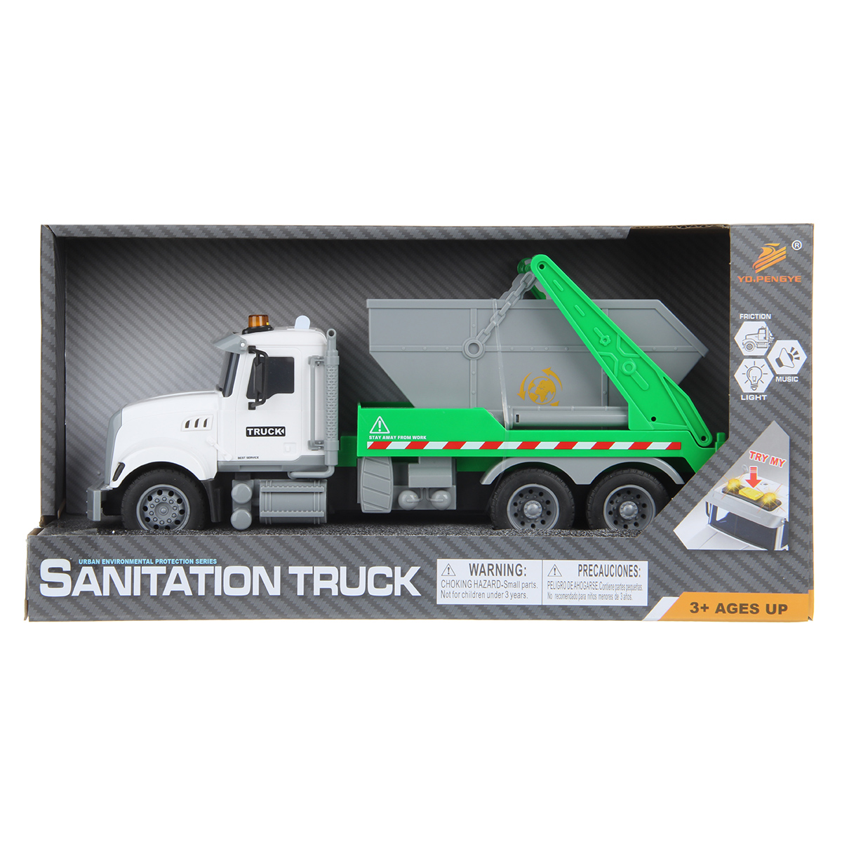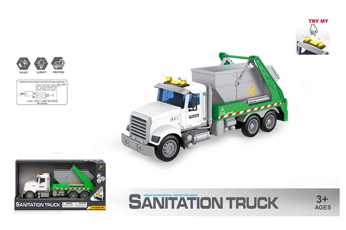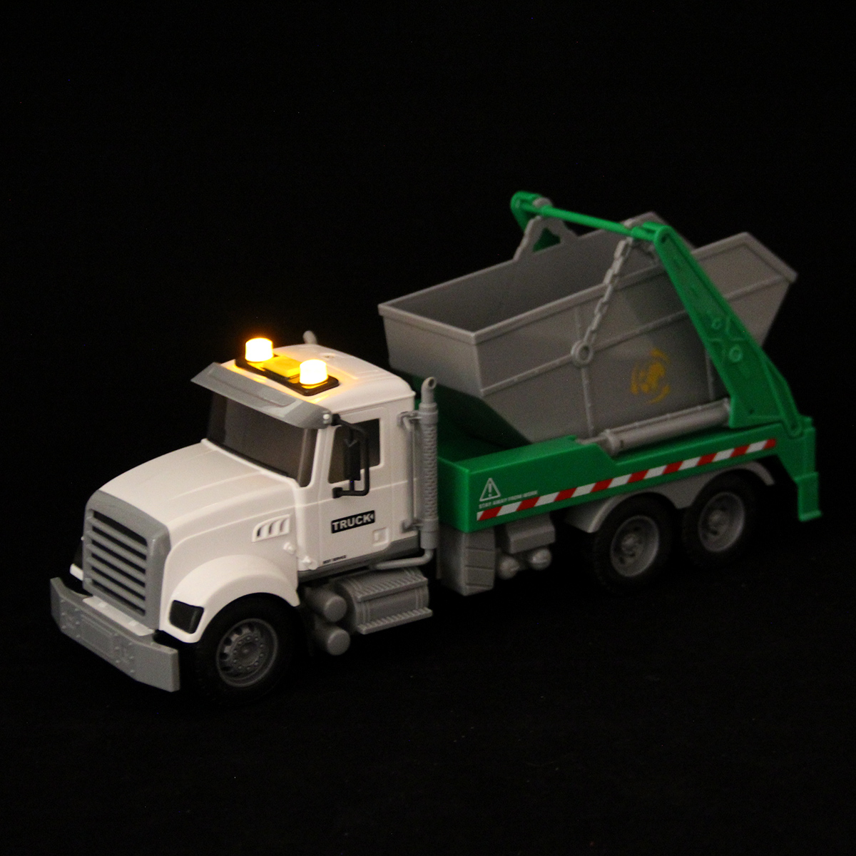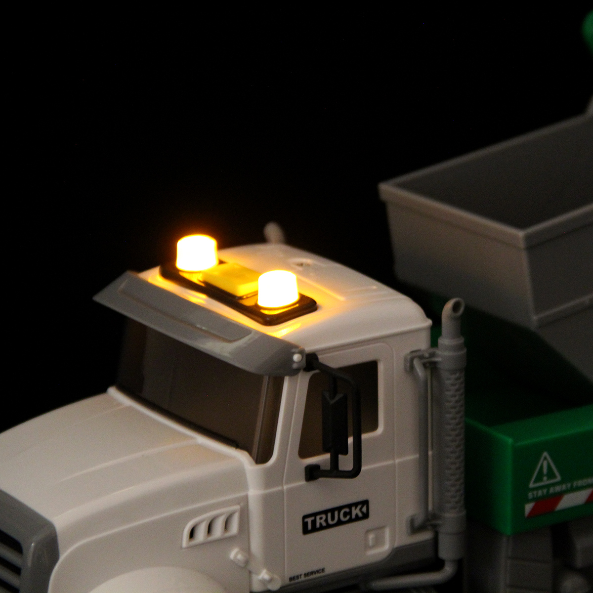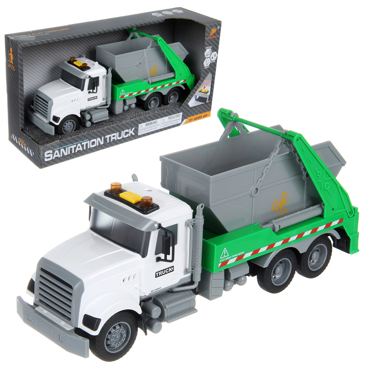 Большая машинка мусоровоз с подвижными деталями, звуковыми и световыми эффектами. Игрушка мусоровоз издает звуки заднего хода и гудка, имеет подсветку лампочек на кабине, можно играть в темное время суток.