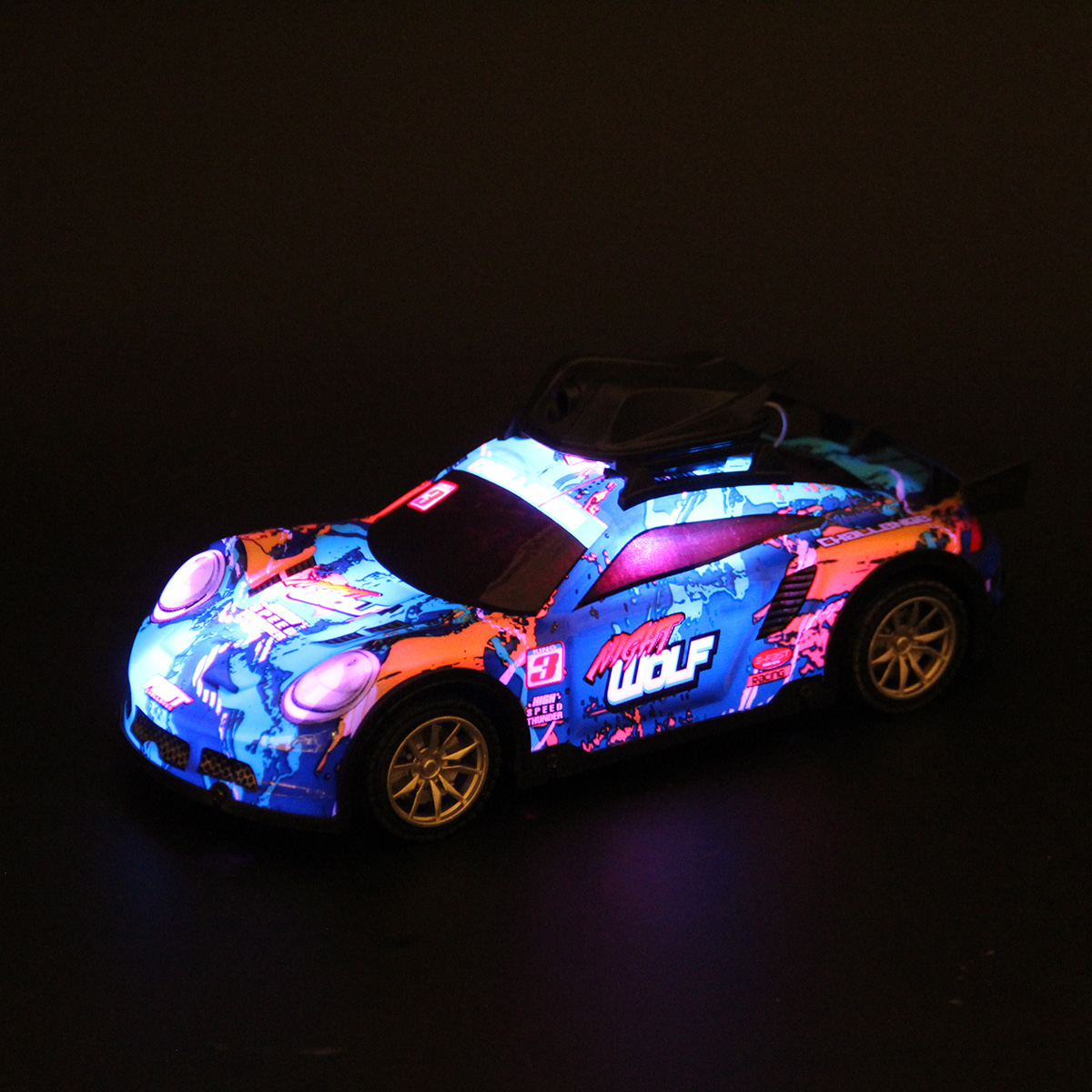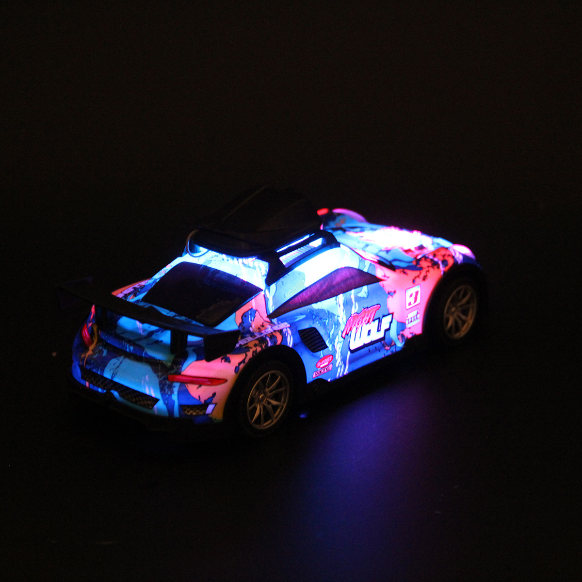 Движение во все стороны, поворачивают передние колеса, задний привод, колеса прорезинены. Подсветка корпуса красным и синим.