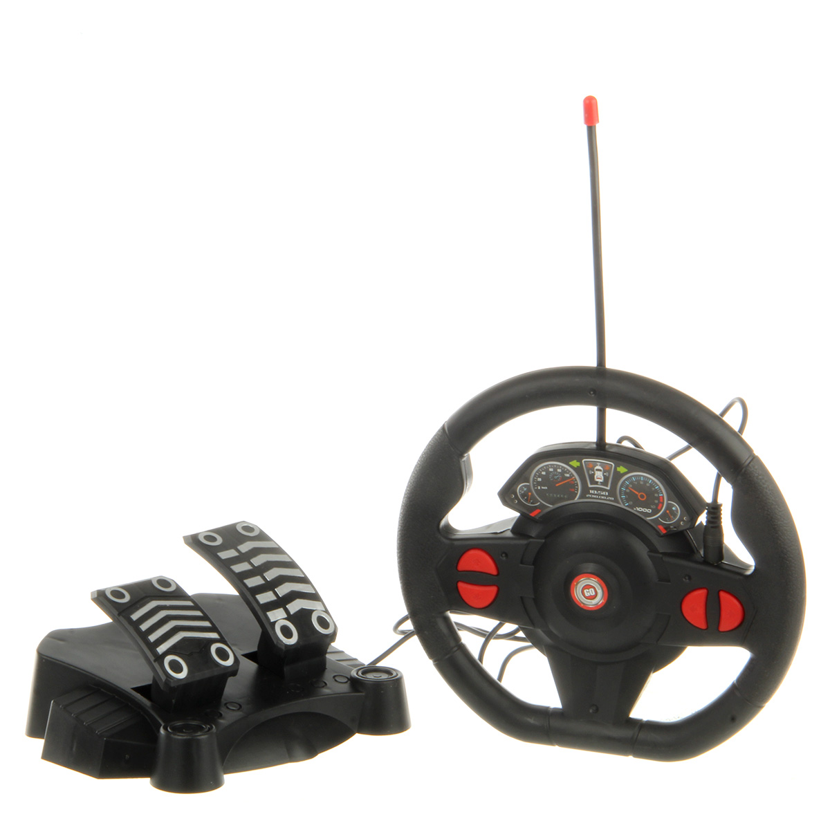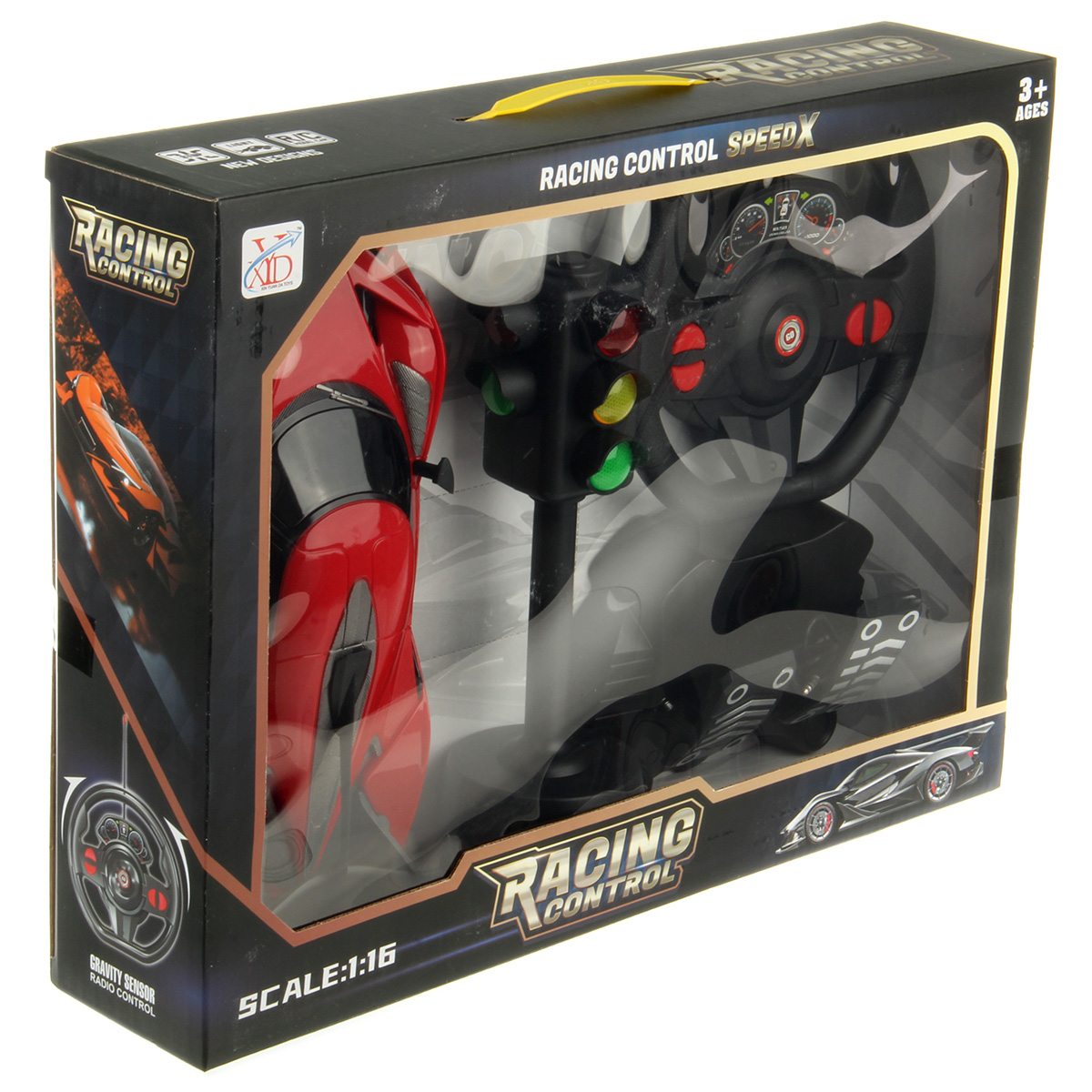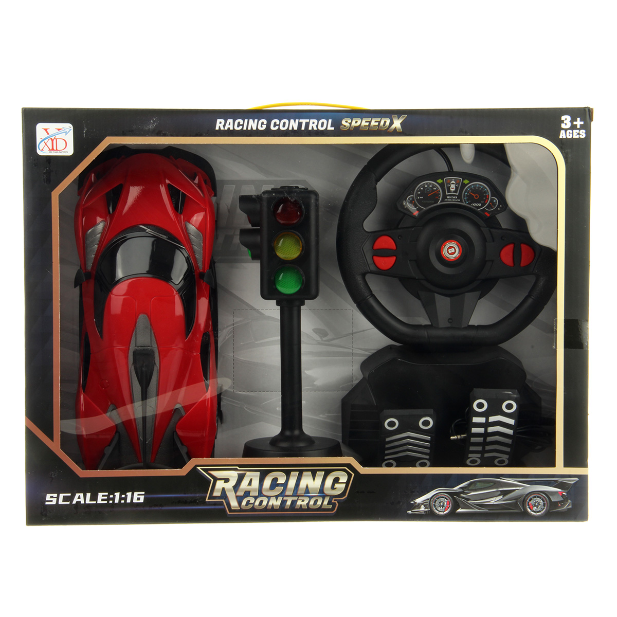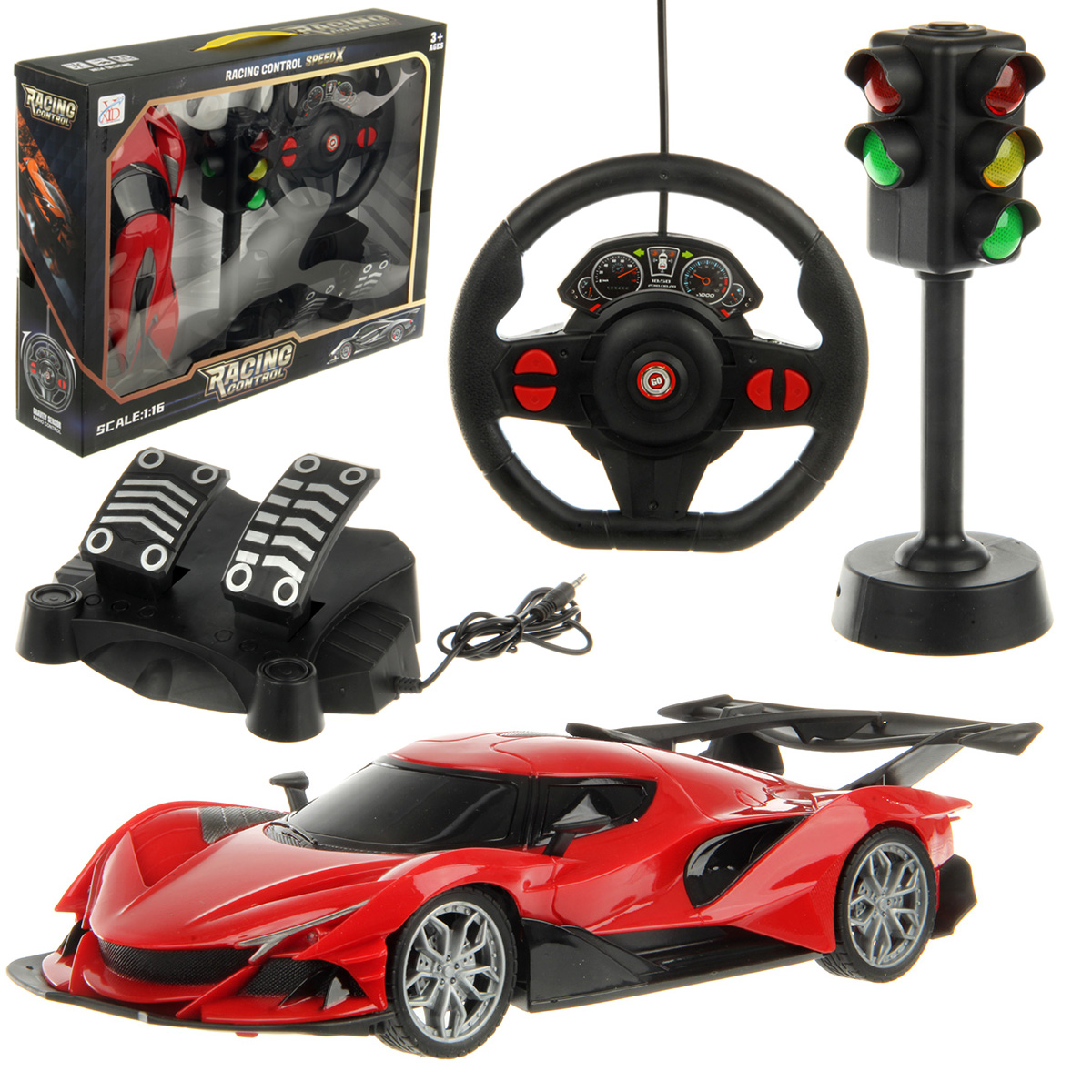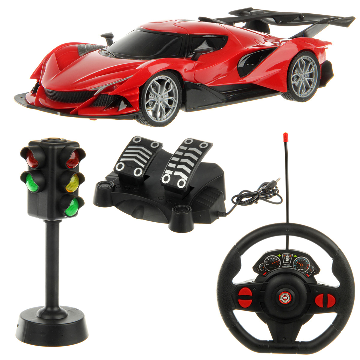 Машинка на радиоуправлении приведет в восторг каждого ребенка.Машина радиоуправляемая имеет стильный дизайн, пульт удобно ложится в руки.Игрушка машинка станет прекрасным подарком для ребят разного возраста.Машина на батарейках выполнена в красивой расцветке, реалистичном виде.Машина в масштабе 1х16 с простым управлением.В комплекте машинка, пульт управления, педаль, светофор.При управлении машиной с помощью педали едет вперед и назад.Функционал светофора. Несколько режимов работы при нажатии на кнопку в верхней части светофора.1. Подсвечиваются красный и зеленый сигналы светофора, издает отсчет времени, занимает в районе 10 секунд, 2 подсветки, долгая и мигающая.2. Подсвечиваются красный и желтый, издает отсчет времени, занимает в районе 10 секунд, 2 подсветки, долгая и мигающая.Функционал машинки.1. Провод педали вставляется в руль. Педаль работает от руля.2. Катается во все стороны, поворачивают передние колеса.3. При движении вперед подсвечиваются передние фары.4. Колеса прорезинены.5. Заднеприводная.Масштаб 1 к 16.Машинка работает от 4 батареек АА, не входят в комплект.Пульт управления работает от 2 батареек АА, не входят в комплект.Светофор работает от 3 батареек LR44, входят в комплект.Полимер.Максимальная скорость 6 км в час.Частота радиоуправления 27 МГц.Размеры светофора 9х9х22 см.Размеры машинки 28х11х7 см.Размеры пульта управления 18х4х17 см.Размеры педали 16х13х8 см.Длина провода 84 см.Размеры коробки 42х9х31 см.