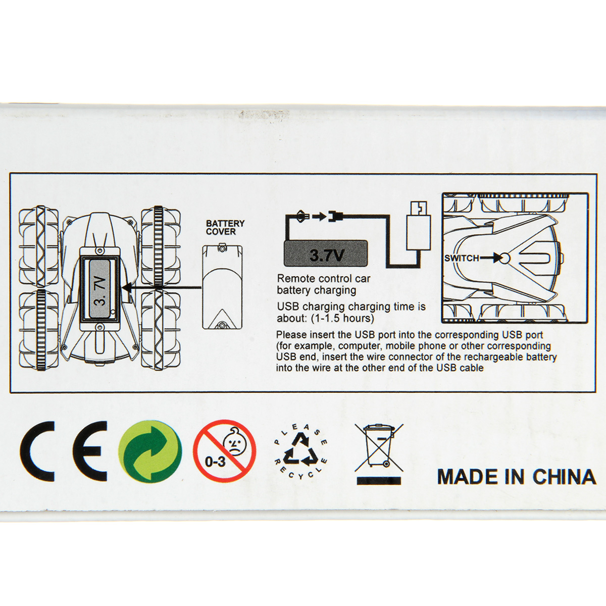 Машинка, пульт управления, аккумулятор 3.7 V, отвертка крестовая, инструкция на английском и китайском языках.