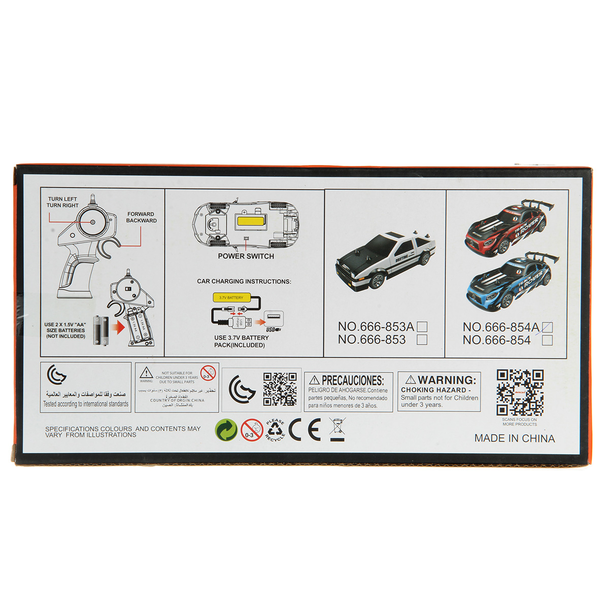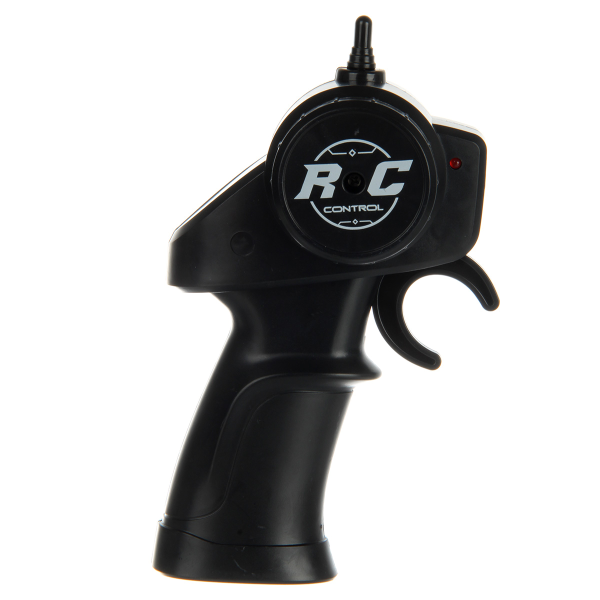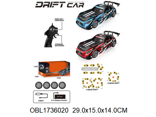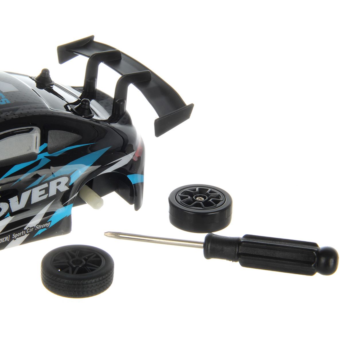 Машинка, пульт управления, 4 сменных прорезиненных колеса, 3 конуса, крестовая отвертка, аккумулятор 3.7 V, USB кабель.