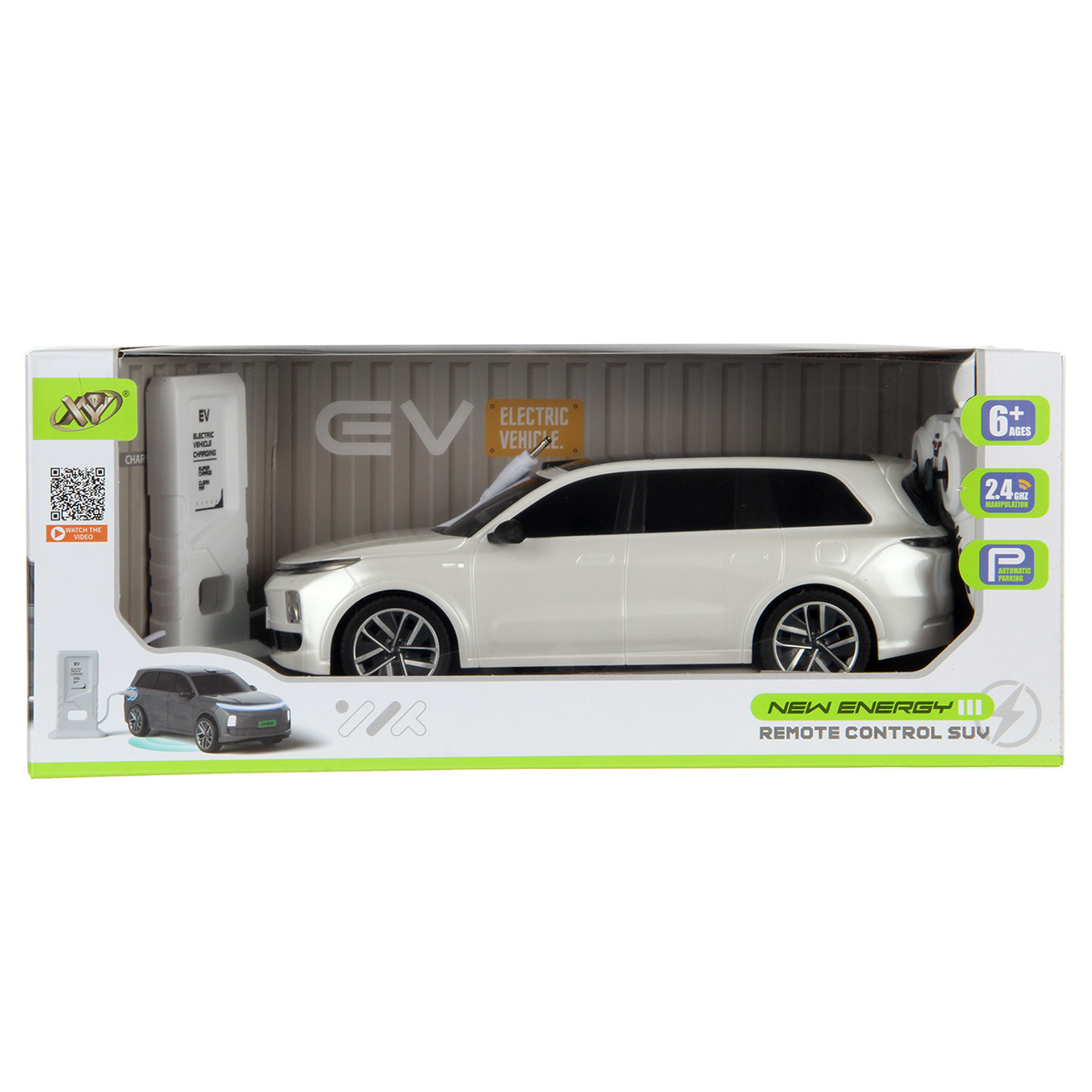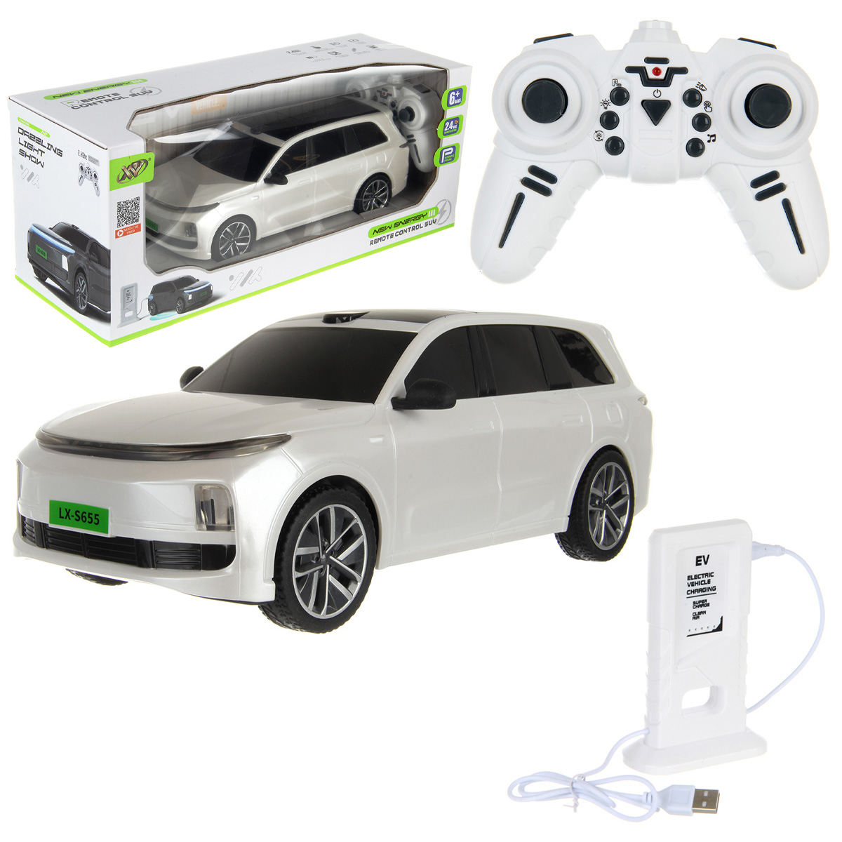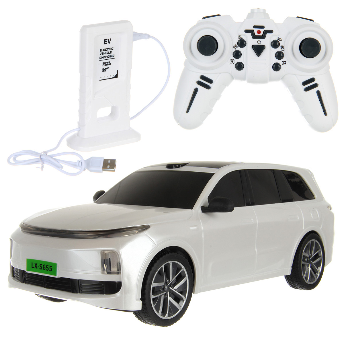 В наборе машинка, пульт управления, станция зарядки.