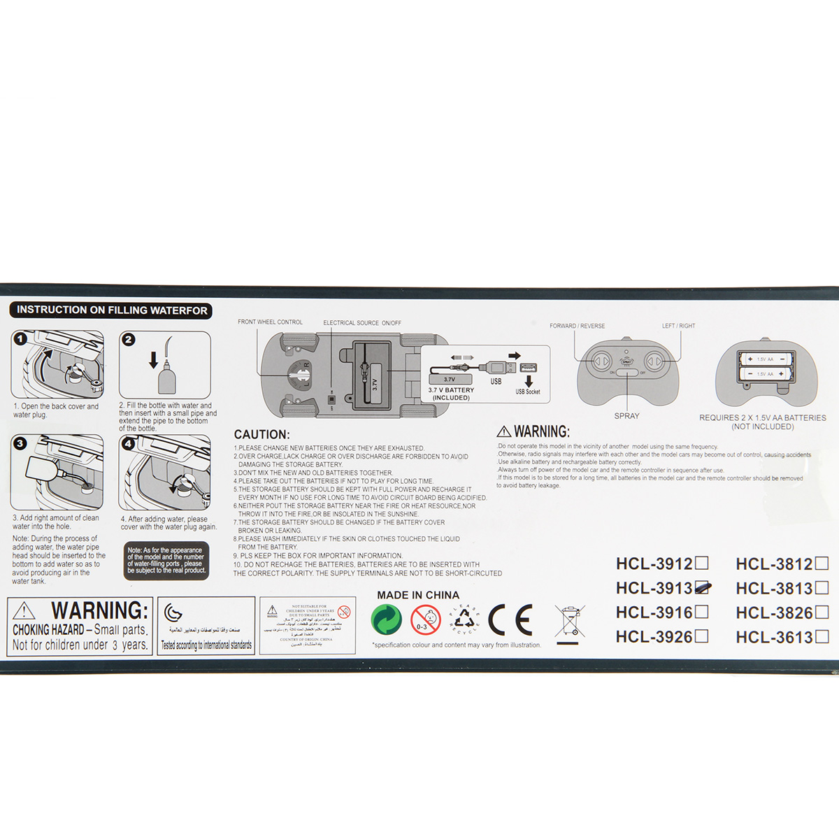 Машинка, пульт управления, бутылочка для воды, аккумулятор 3.7V, USB кабель.