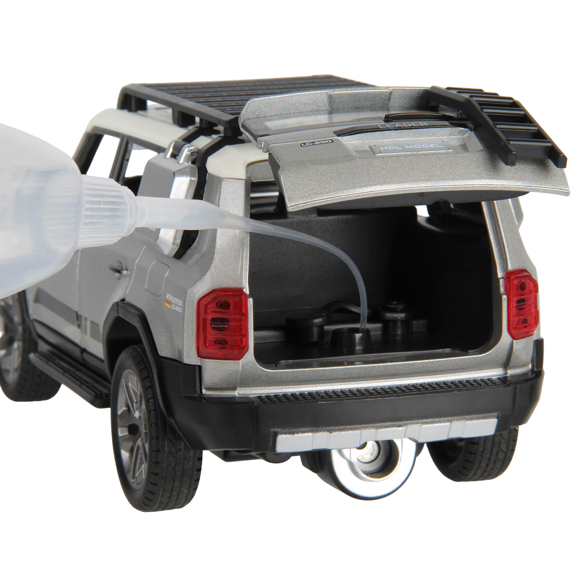 2. Функция пара. Откройте багажник, там находится отсек для заливки воды. Наберите воду в бутылочку, наденьте насадку на бутылочку, налейте воду в отсек. При нажатии на центральную кнопку на пульте из отверстия в задней части машинки пойдёт пар, отверстие будет подсвечиваться голубым.