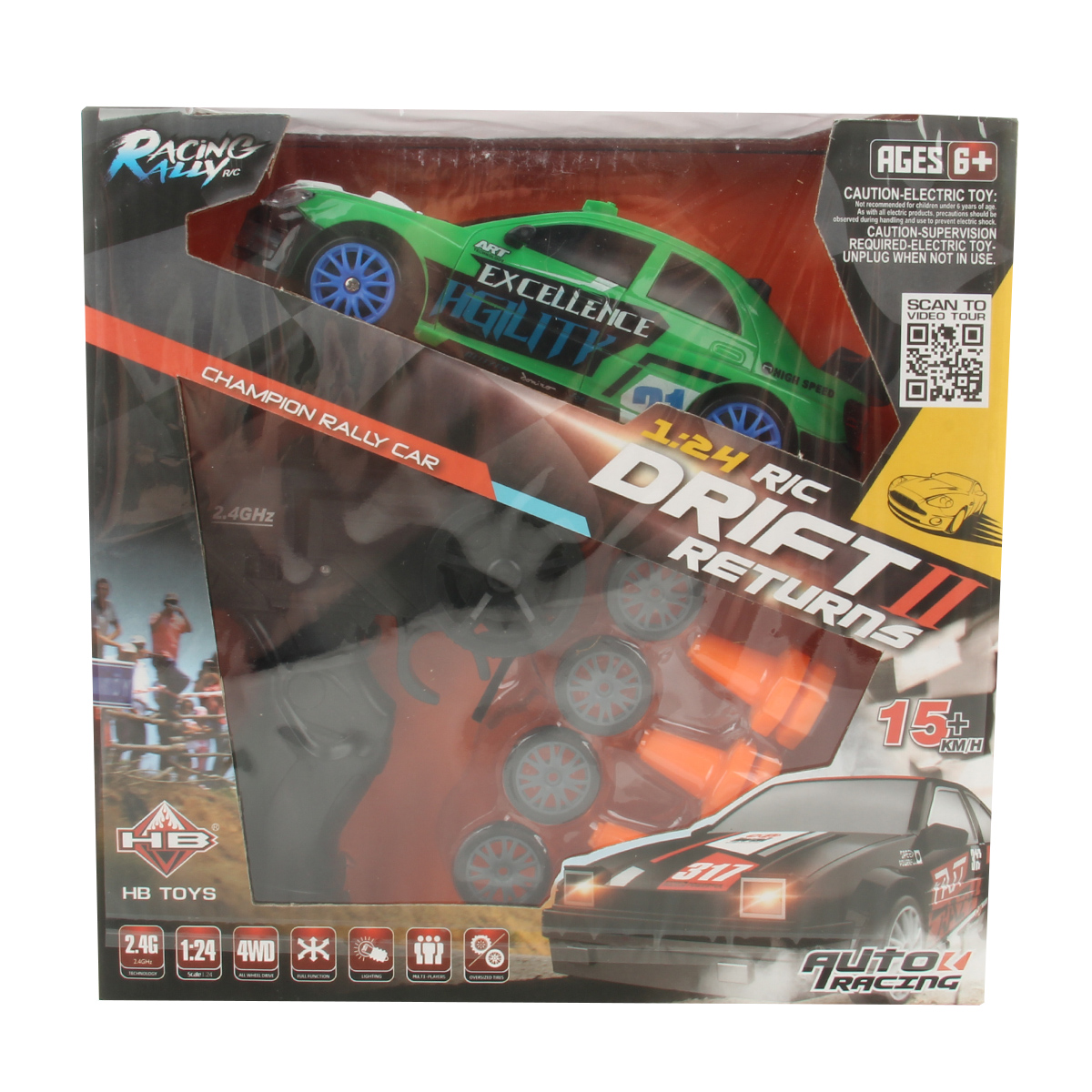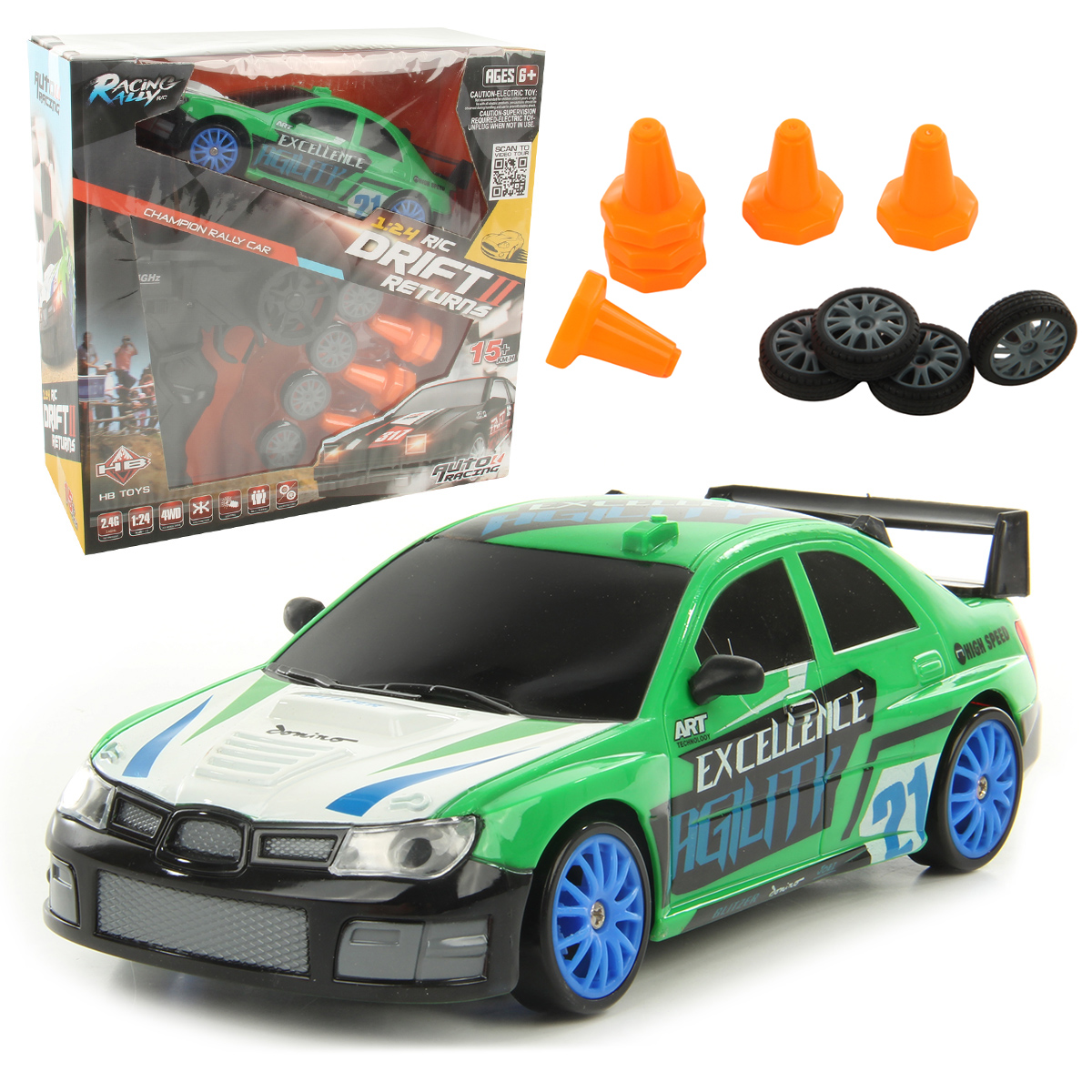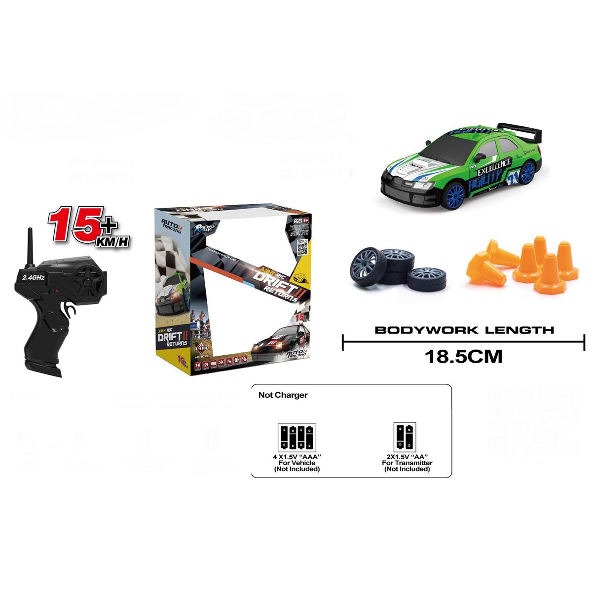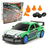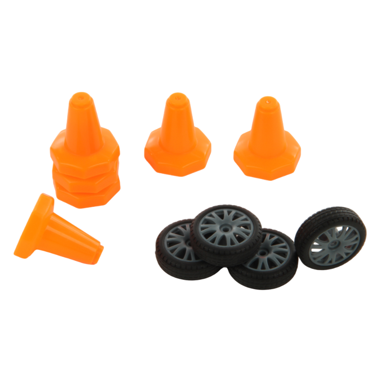 В наборе машинка, пульт управления, 4 прорезиненных колеса, 6 конусов, инструкция на английском и китайском языках.
