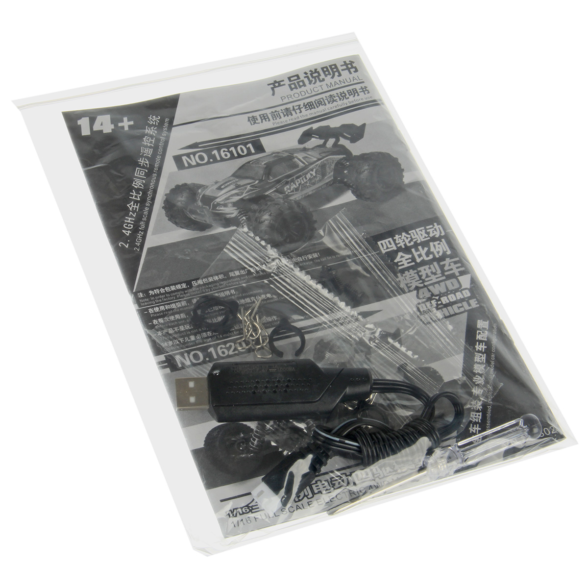 В наборе машинка, пульт управления, USB кабель в виде флешки, крестовая отвертка, подробная инструкция с каталогом запчастей на английском и китайском языках, пины для фиксации корпуса, элементы для регулировки жесткости амортизатора, болты.