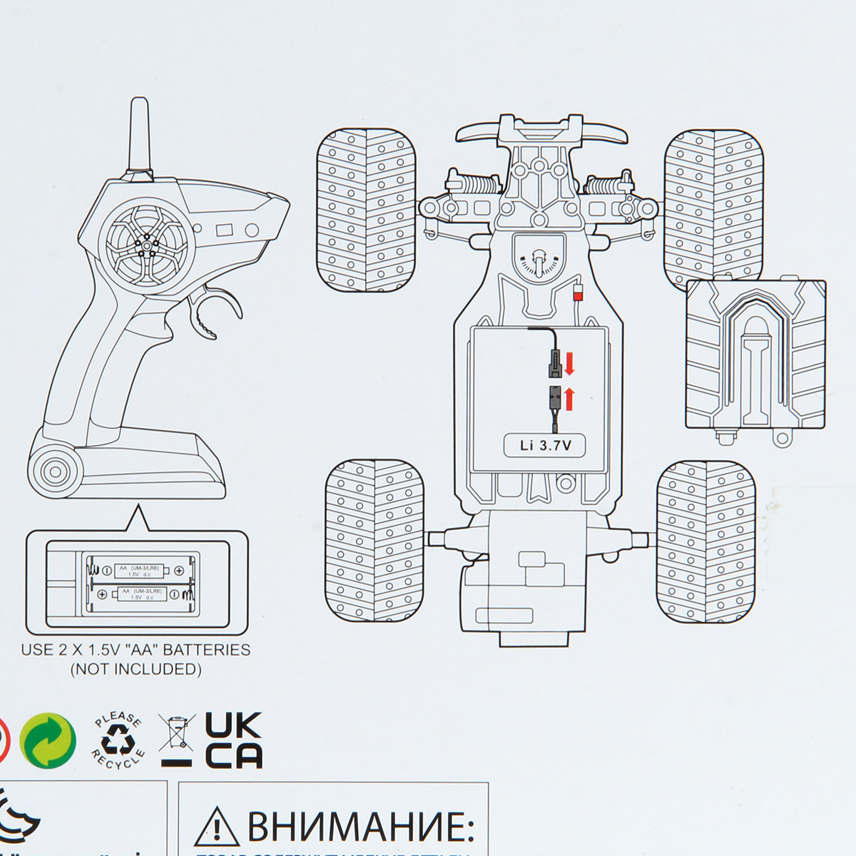 В наборе машинка, пульт управления, USB кабель, аккумулятор 3.7V.