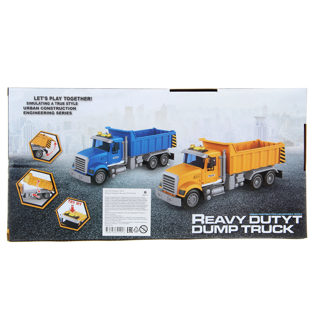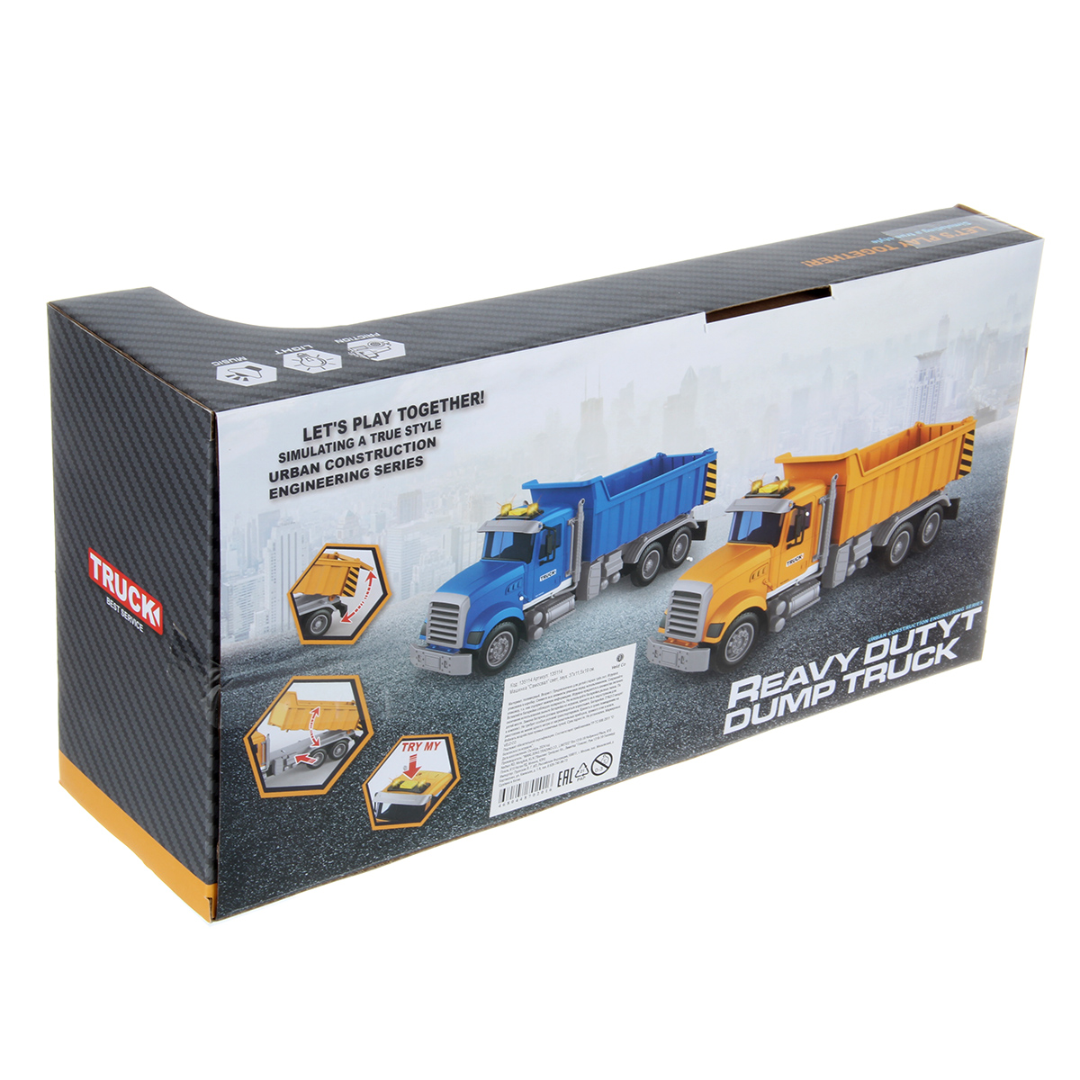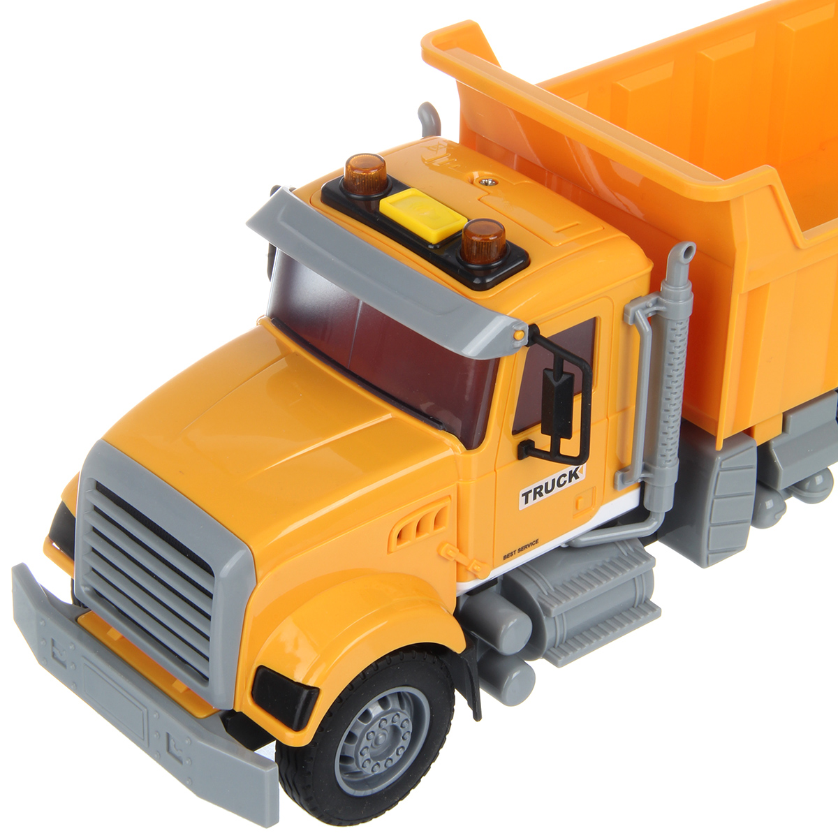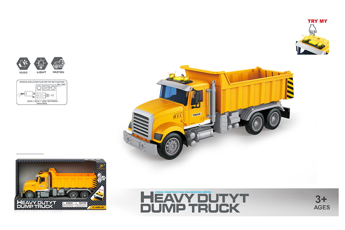 1. Самосвал катается вперед и назад, оснащен фрикционным механизмом, колеса прорезинены, боковые зеркала мягкие.