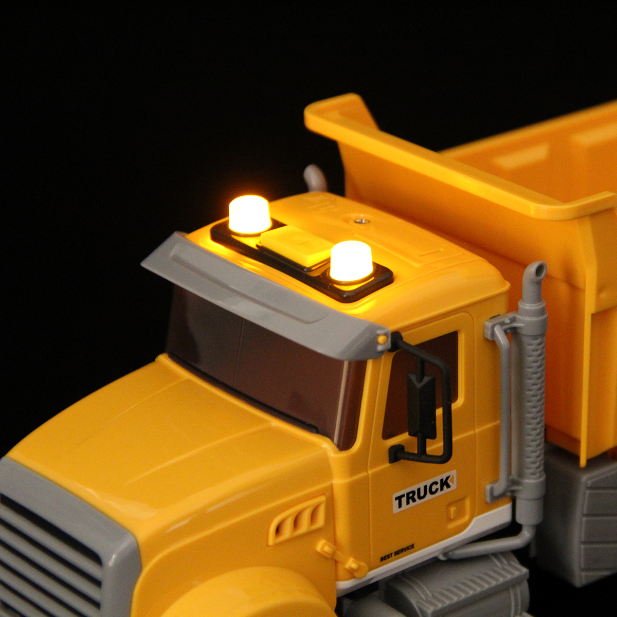 2. При нажатии кнопки на кабине издает звуки работающего транспорта, заднего хода, гудка, заводящегося двигателя, подсветка лампочек на кабине.