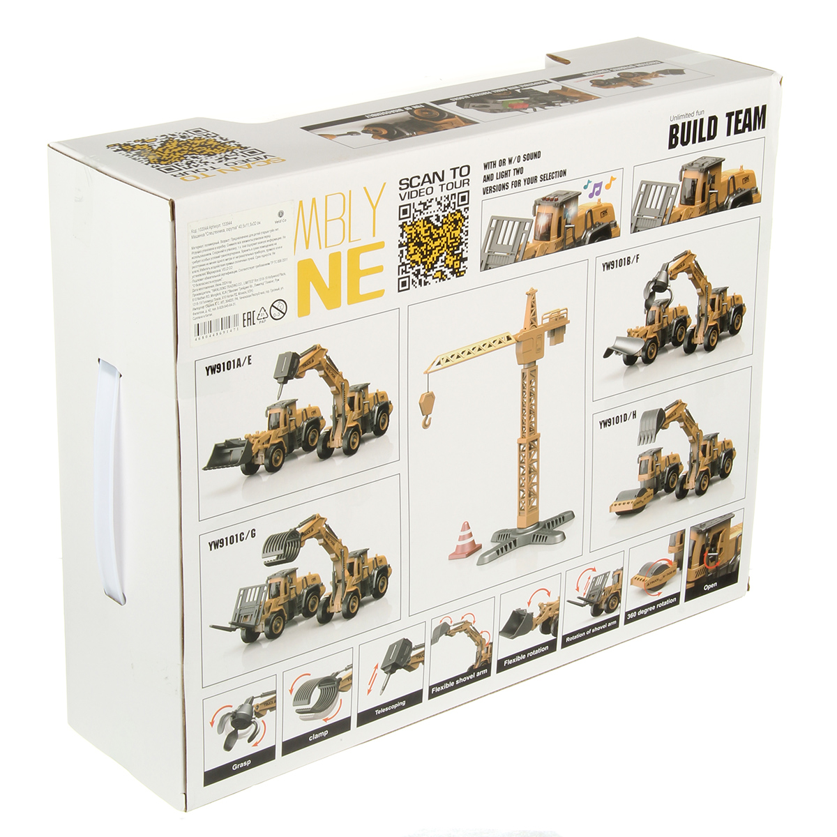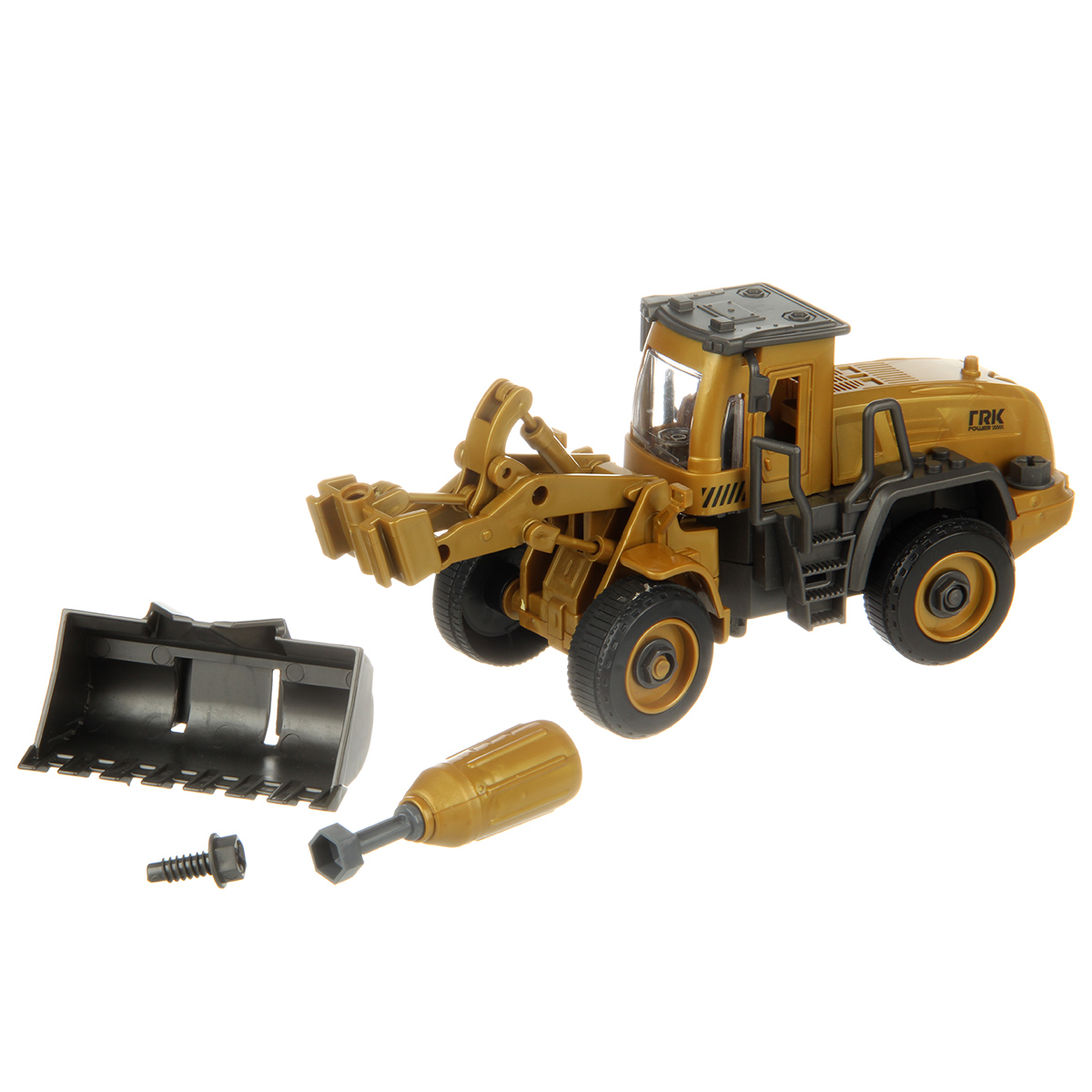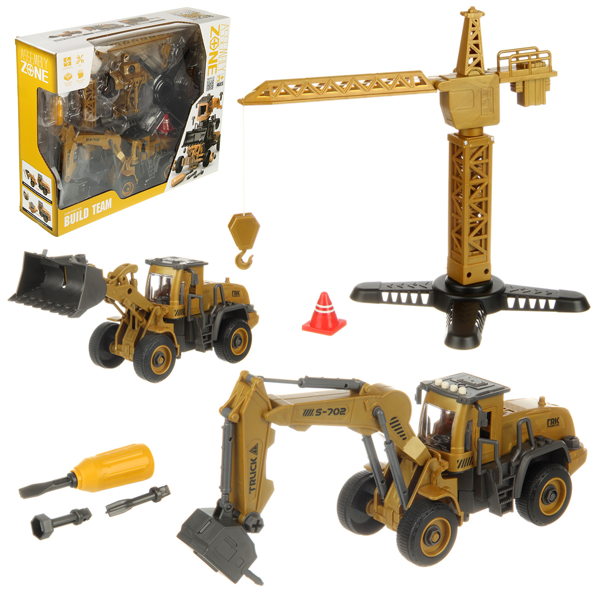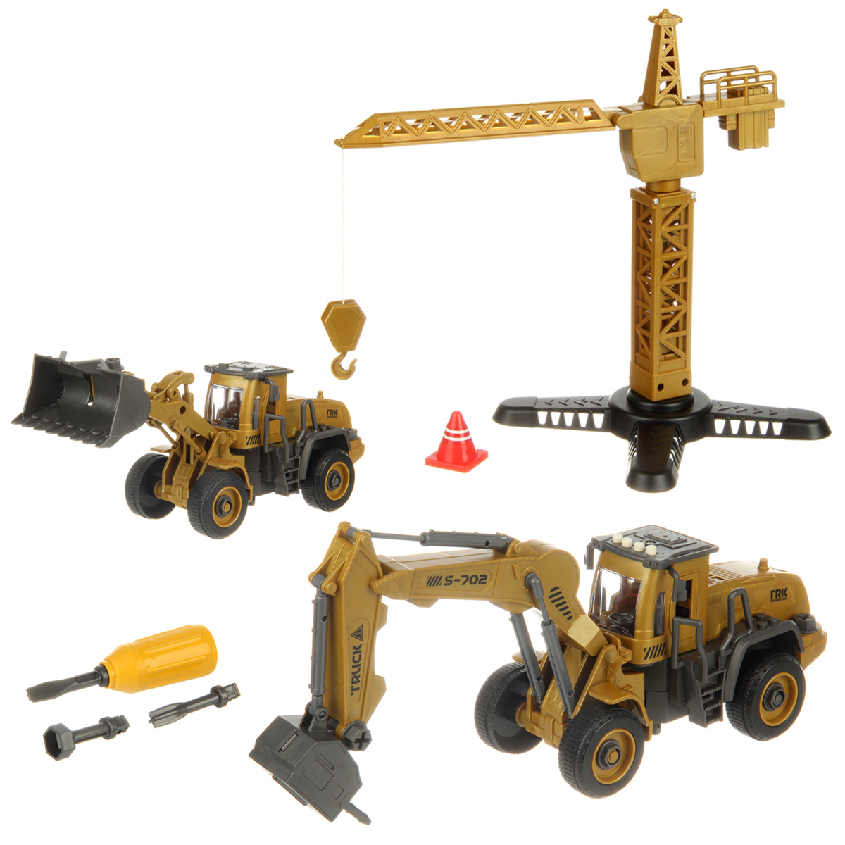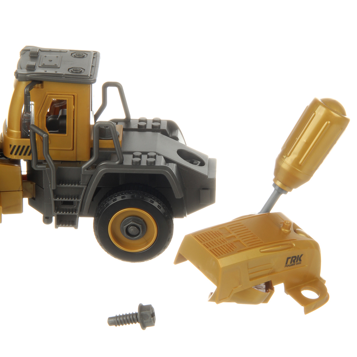 Отвертка, 2 насадки, трактор с гидромолотом, кабина с ковшом, подъемный кран, подставка под подъемный кран.