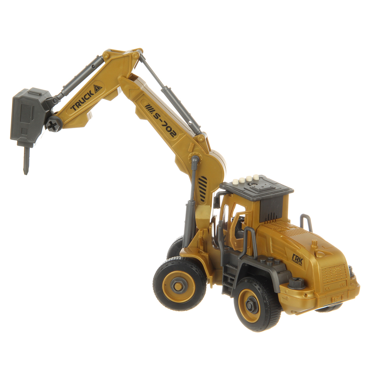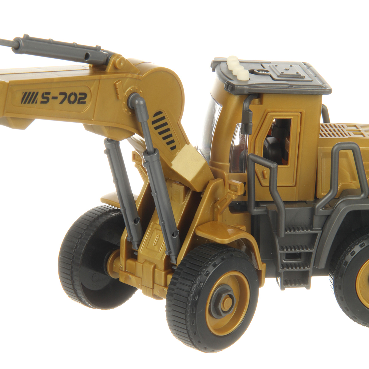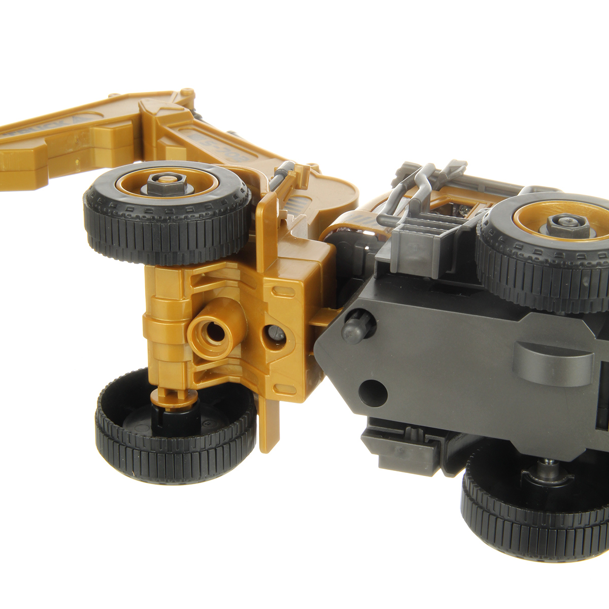 2. Трактор катается вперёд и назад, колёса прорезиненные, фрикционные. Передние тележки с ковшом и гидромолотом поворачивают налево и направо.