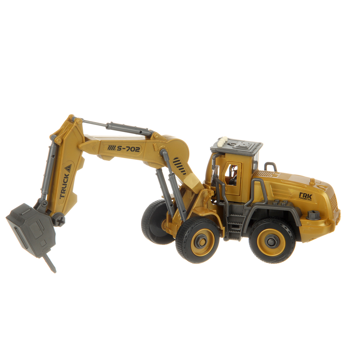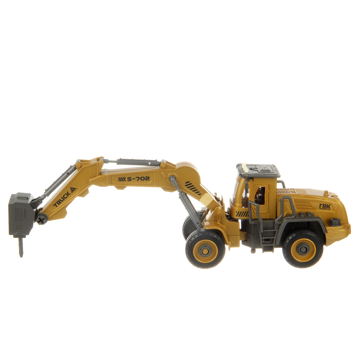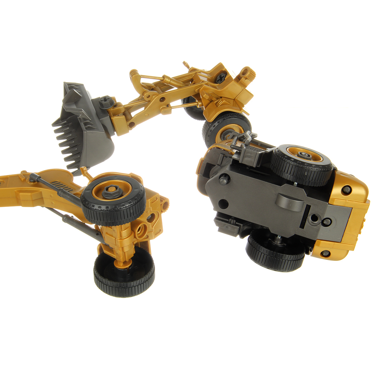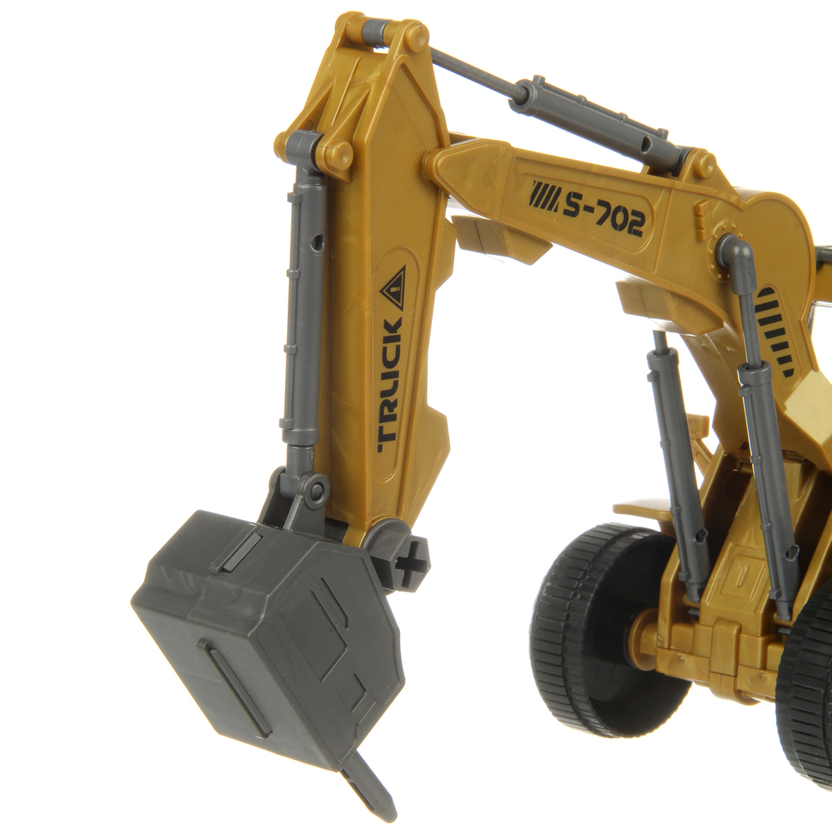 2. Трактор катается вперёд и назад, колёса прорезиненные, фрикционные. Передние тележки с ковшом и гидромолотом поворачивают налево и направо.