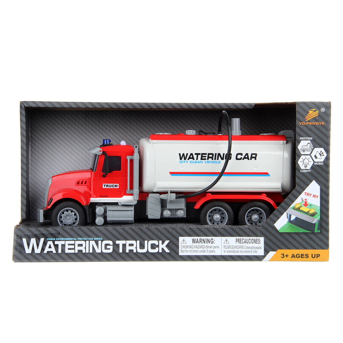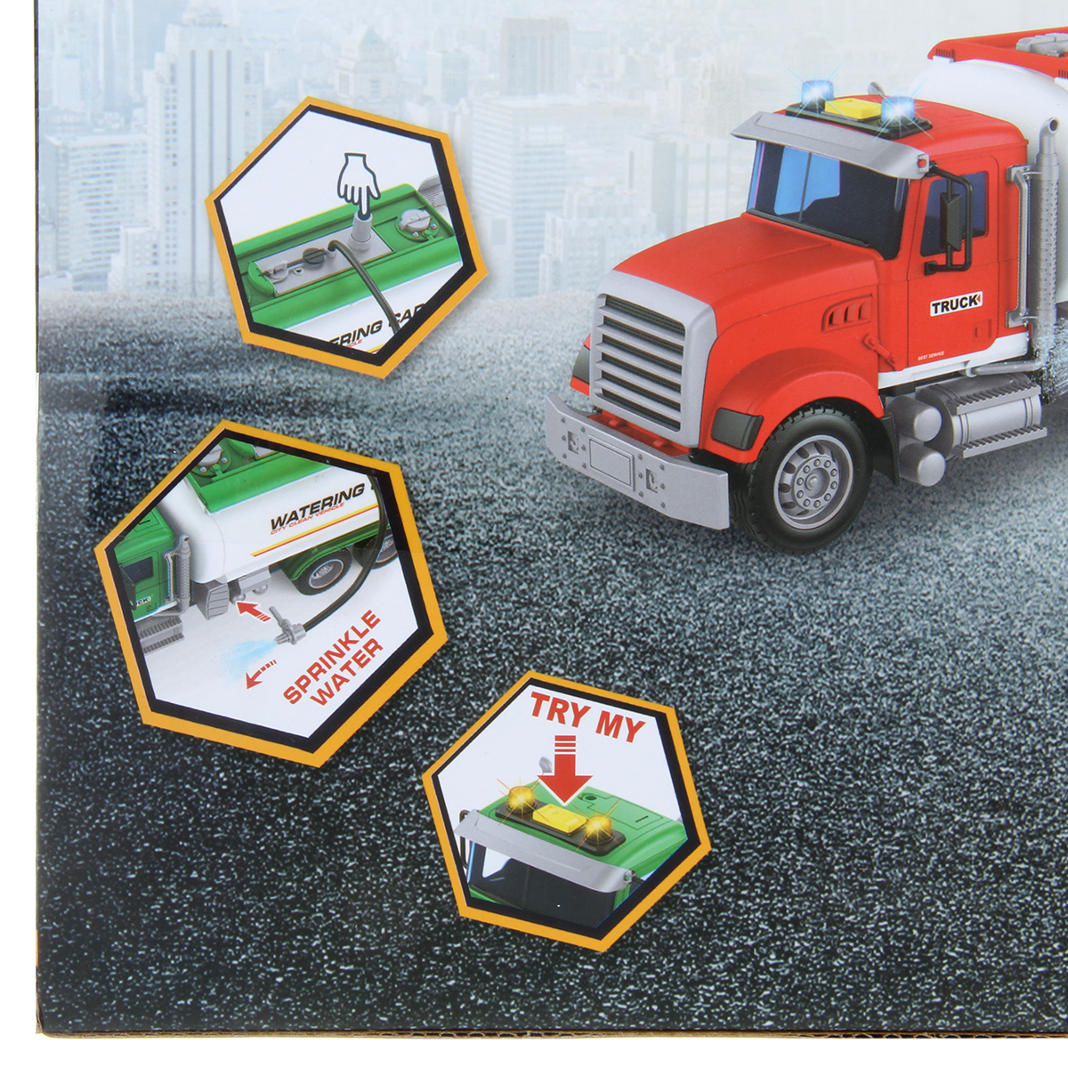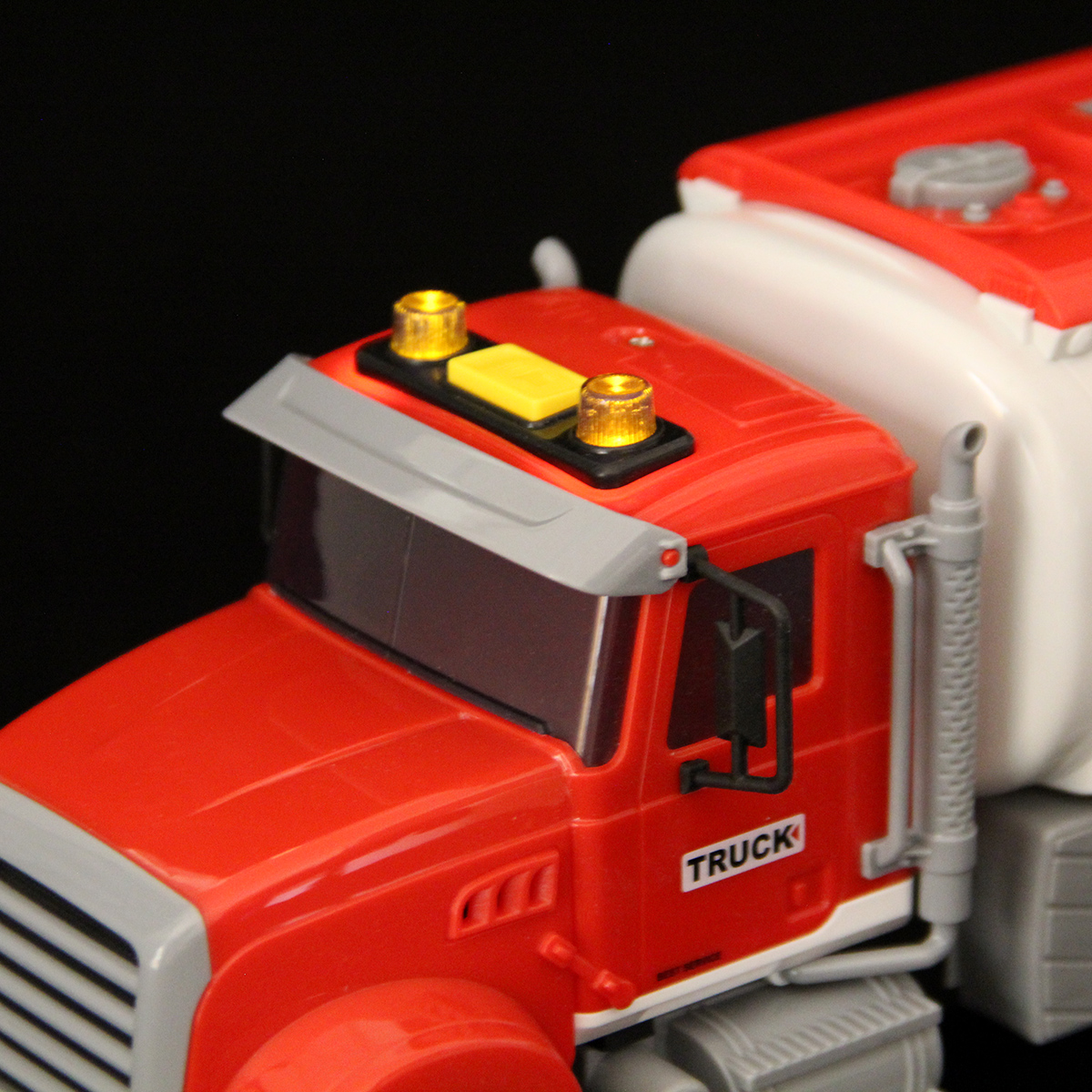 1. Катается вперед и назад, оснащена фрикционным механизмом, колеса прорезинены, боковые зеркала мягкие. При нажатии кнопки на кабине издает звуки работающего транспорта, заднего хода, гудка, заводящегося двигателя, подсветка лампочек на кабине.