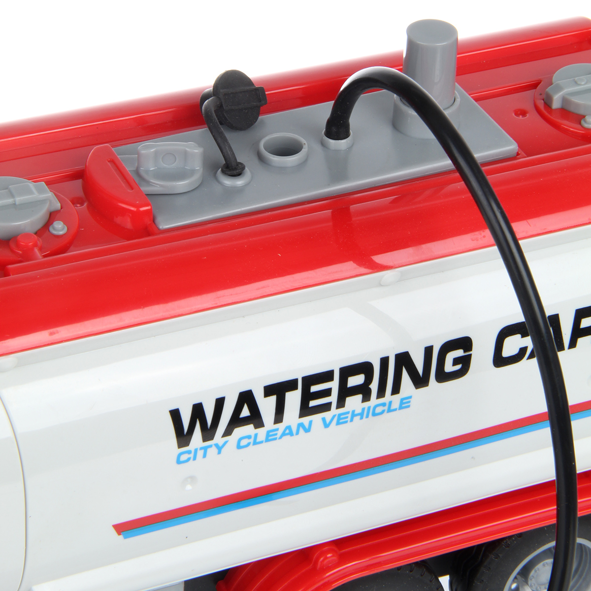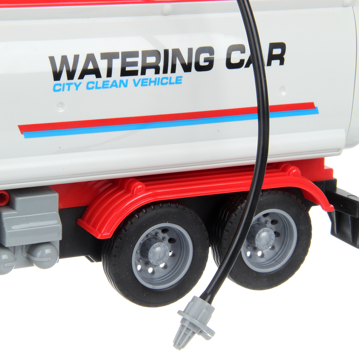 2. В цистерне располагается отсек для воды, отсек вынимается, внутрь заливается вода. При нажатии кнопки на отсеке шланг будет брызгаться струей воды. Пожарный вентиль снимается с держателя.