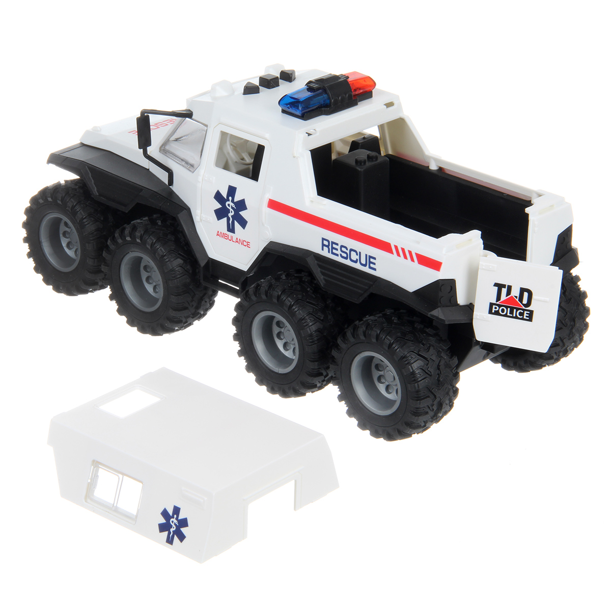 Большая игрушечная машина с открывающимися дверками и капотом, снимающимся кунгом и эффектной подсветкой фар дополнит автопарк ребенка. Качественное исполнение, надежное крепление деталей, подвижные элементы, широкий функционал.