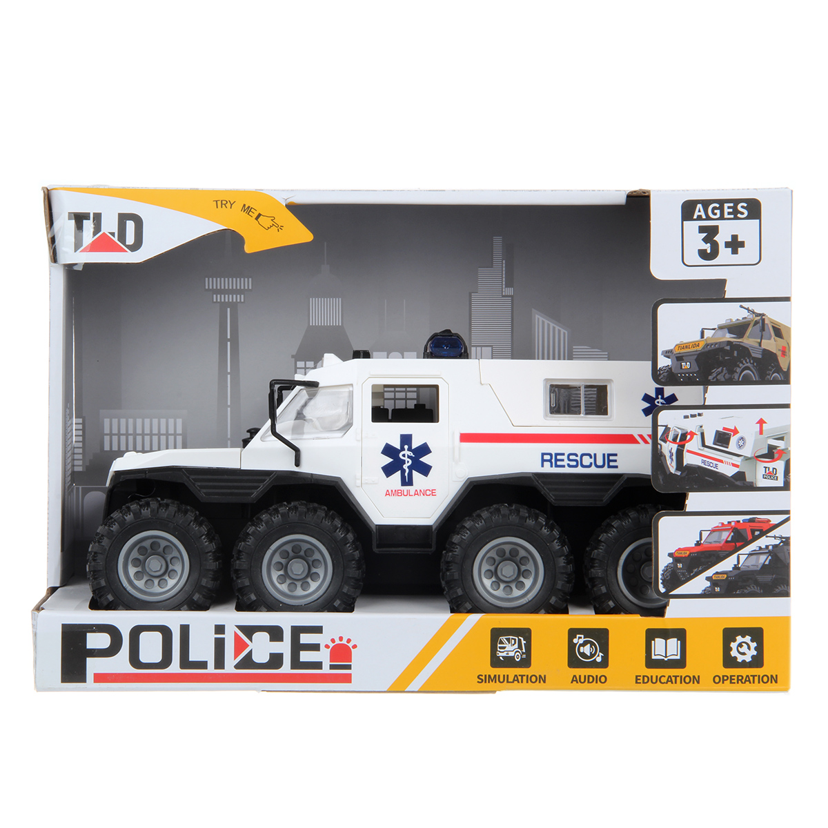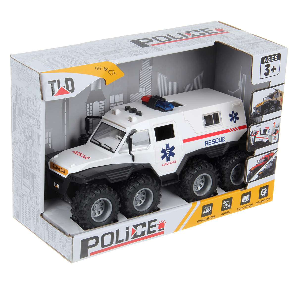 Машина на батарейках издает звуки гудка и заводящегося двигателя, имеет толстые прорезиненные колеса, гарантирующие лучшее сцепление с поверхностью.