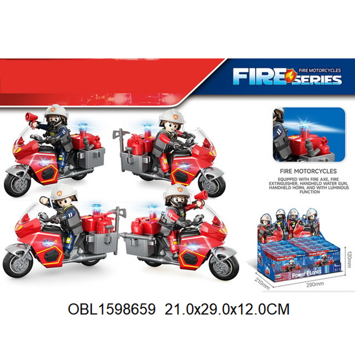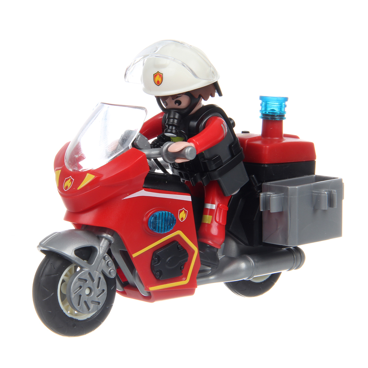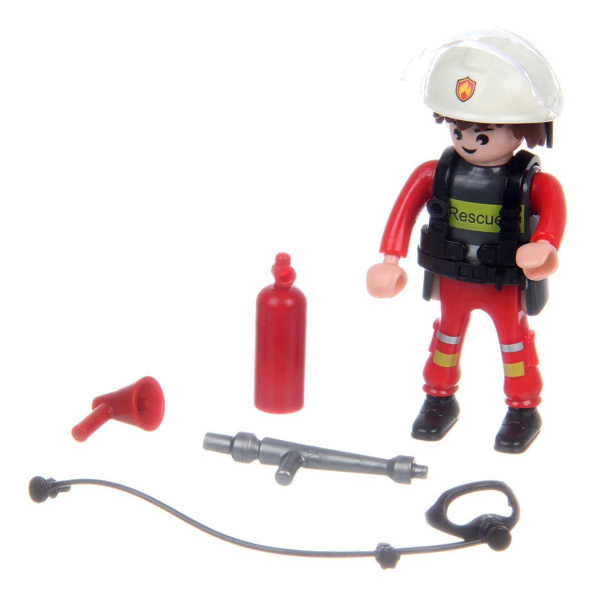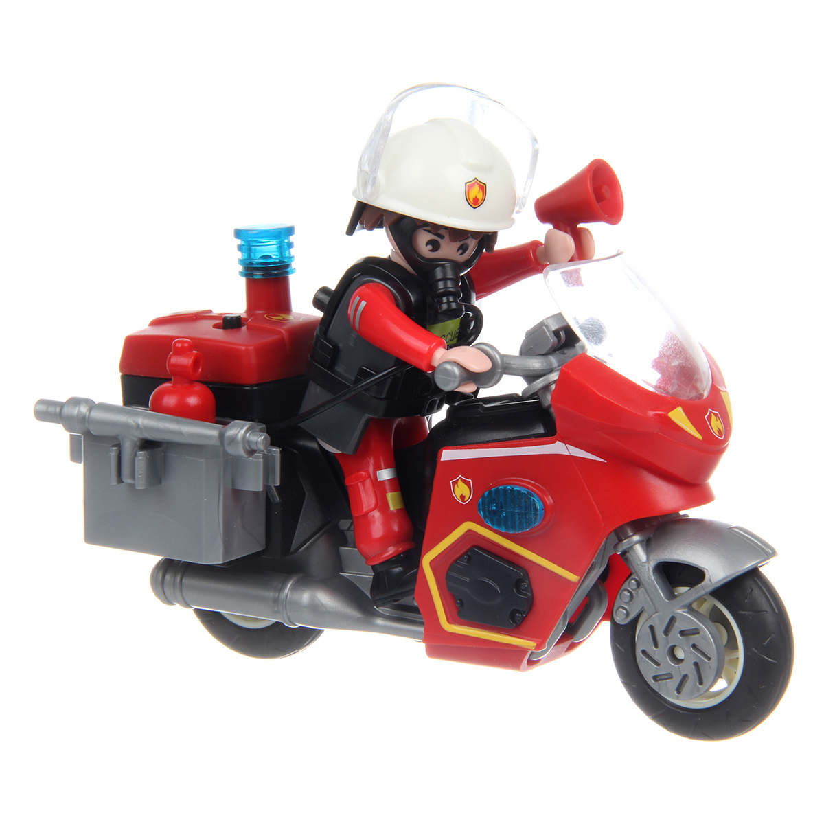 Аксессуары набора с синим и красным пожарным, 2 перчатки, маска, брандспойт, громкоговоритель, огнетушитель.