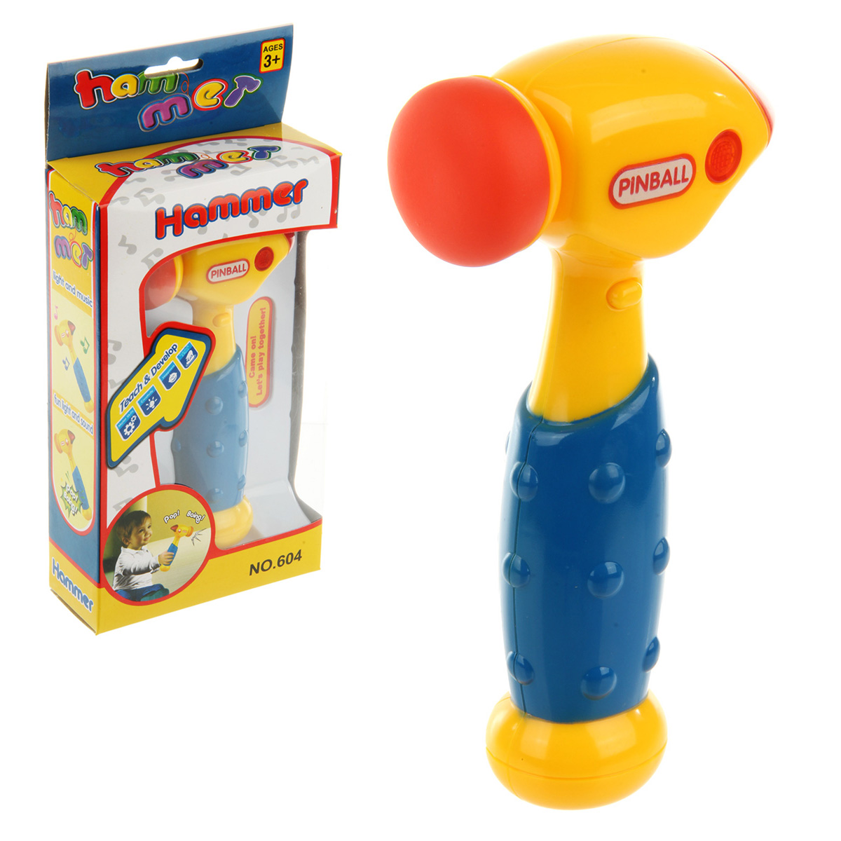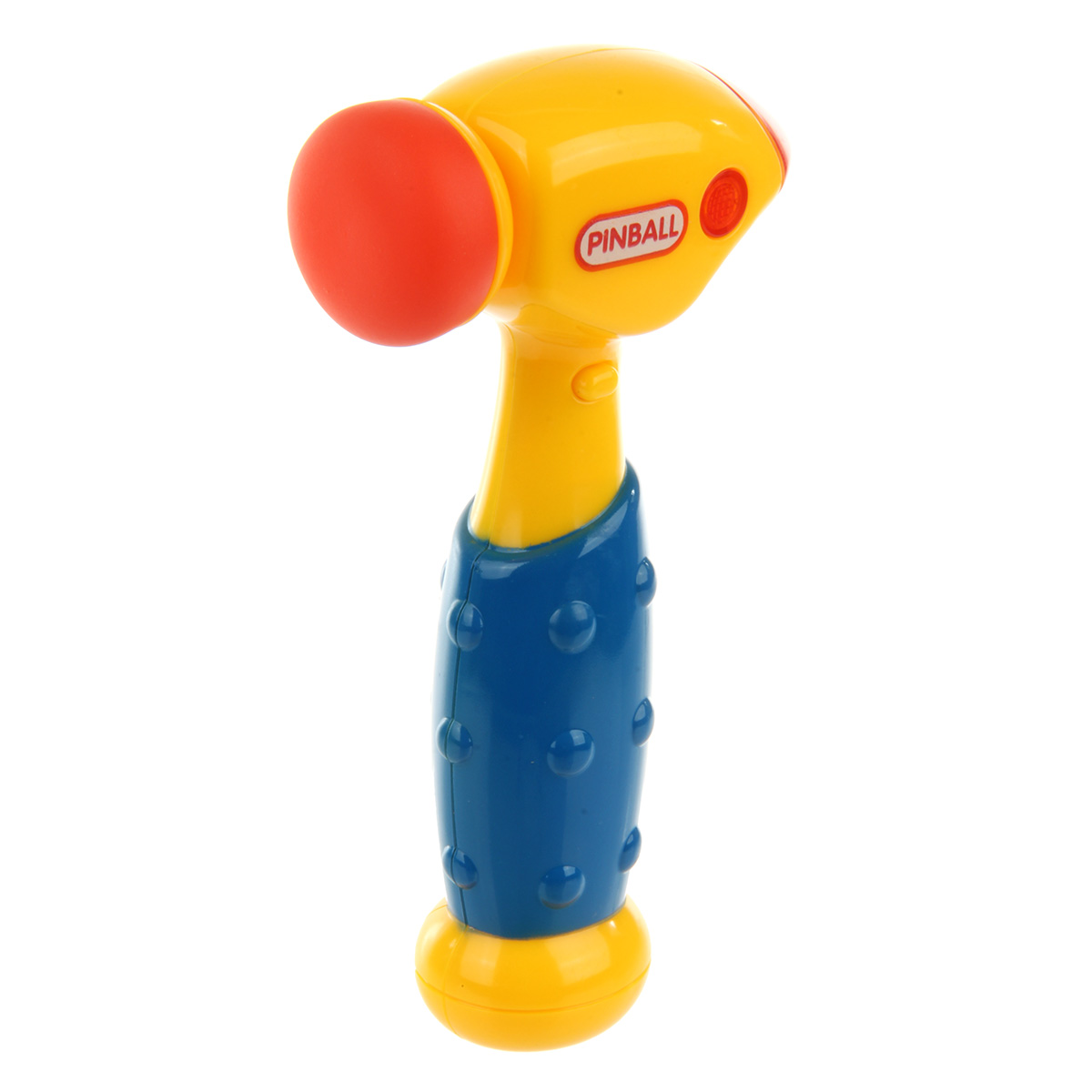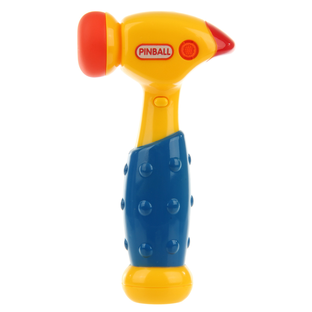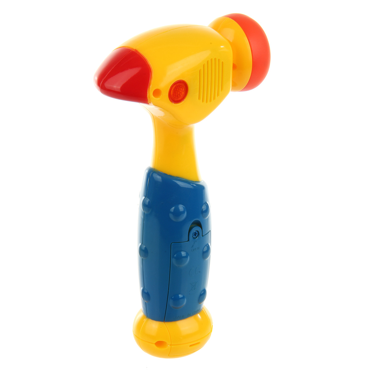 Кнопка включения находится на корпусе игрушки. При ударе головкой молотка по поверхности молоток издает разные звуки, как в мультяшных действиях, верхняя часть молотка подсвечивается красным. Часть, которой стучим, мягкая.