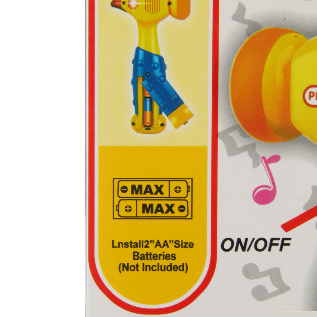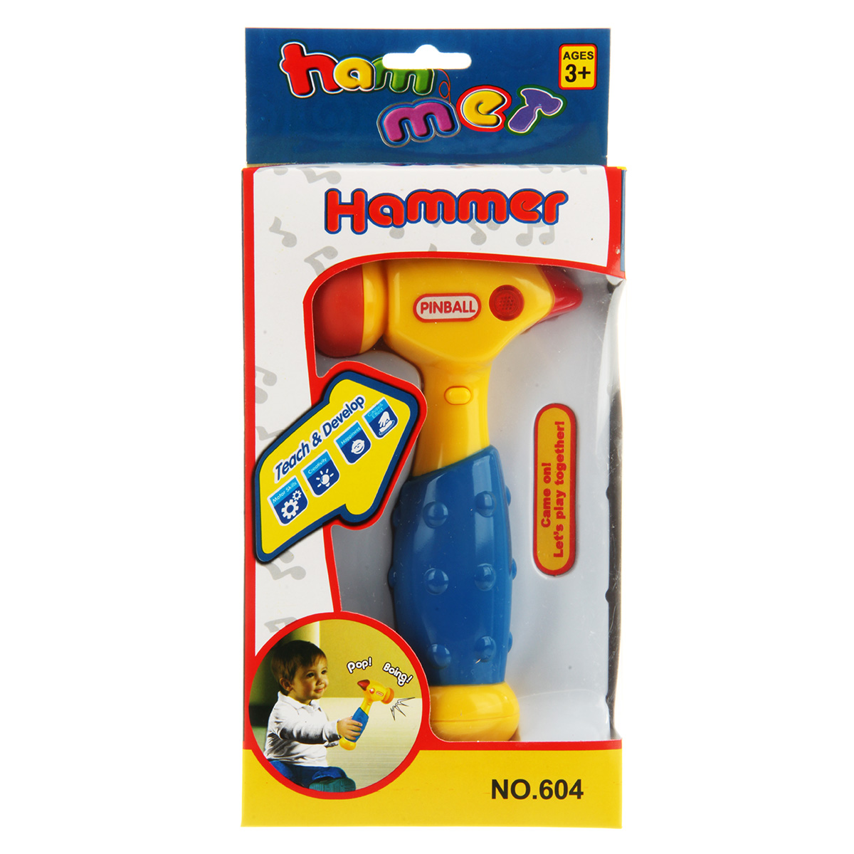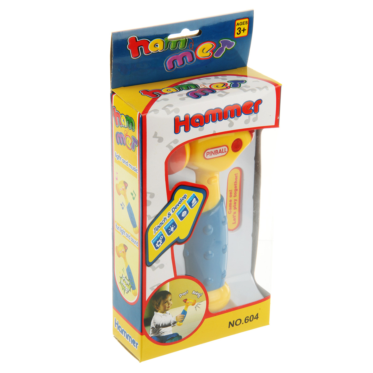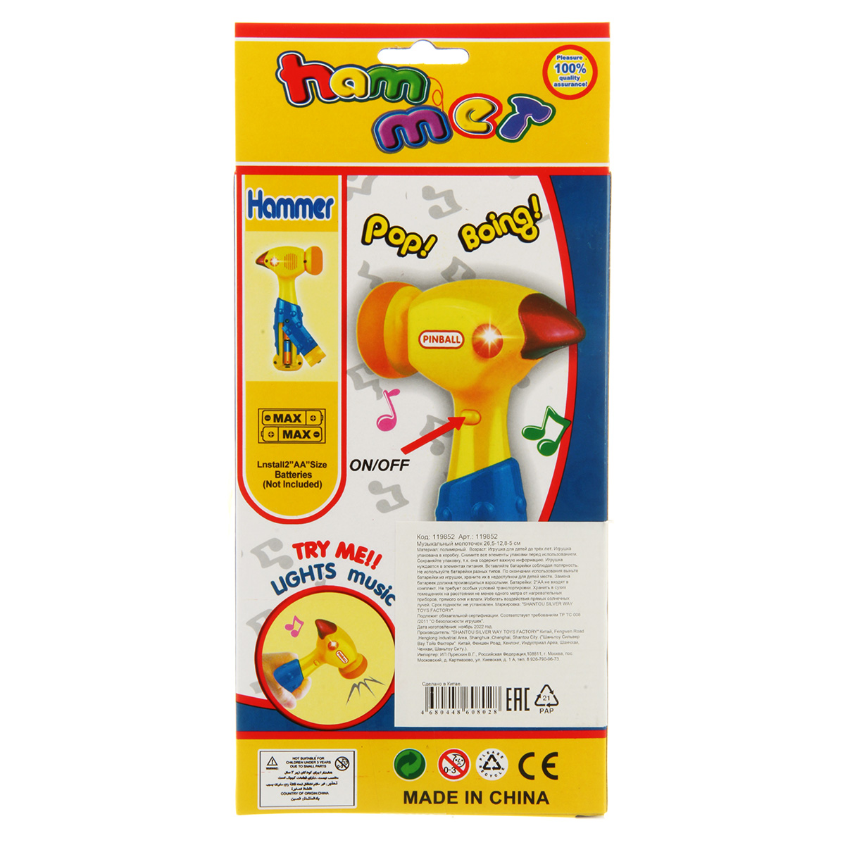 Кнопка включения находится на корпусе игрушки. При ударе головкой молотка по поверхности молоток издает разные звуки, как в мультяшных действиях, верхняя часть молотка подсвечивается красным. Часть, которой стучим, мягкая.