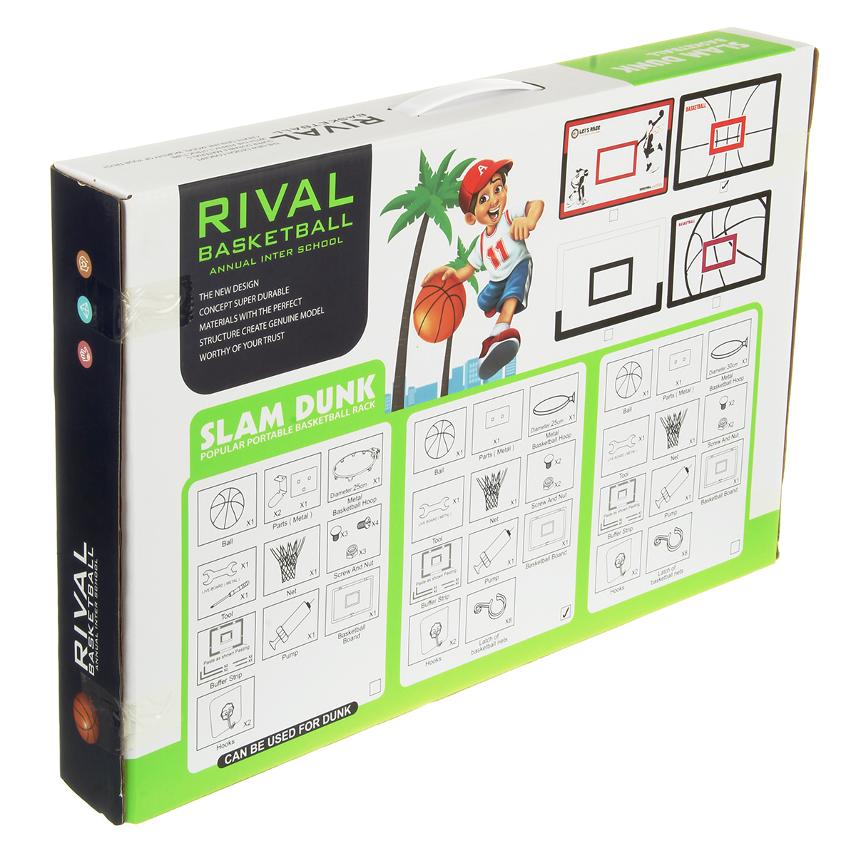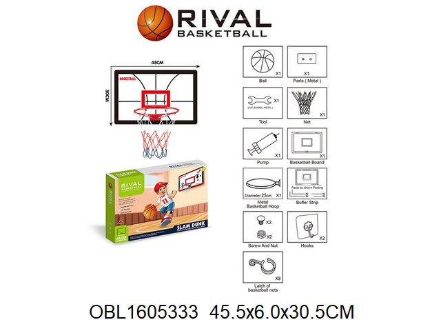 В комплекте прозрачный щит, металлическое баскетбольное кольцо, сетка, лист с самоклеящимися защитными полосками из пенопласта, уплотнитель, 2 крючка, 2 гайки, 2 винта, 8 защелок для баскетбольной сетки, гаечный ключ, мяч, насос, инструкция на английском языке.