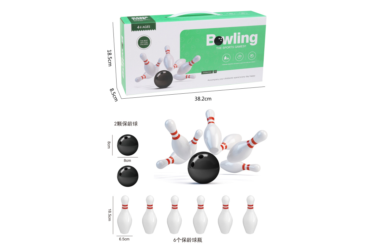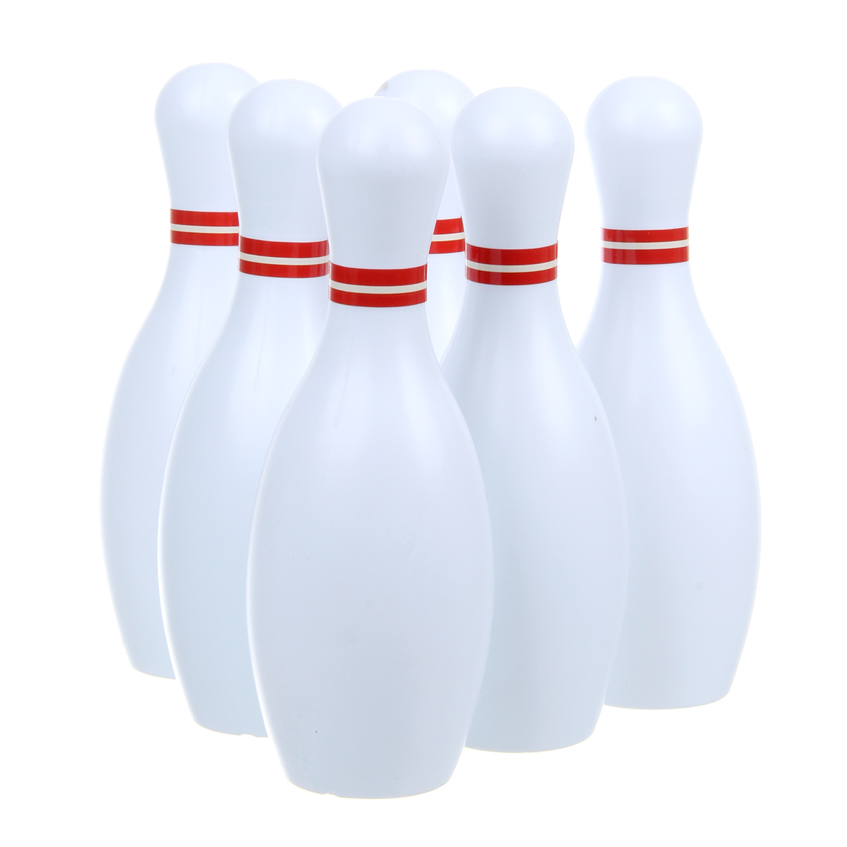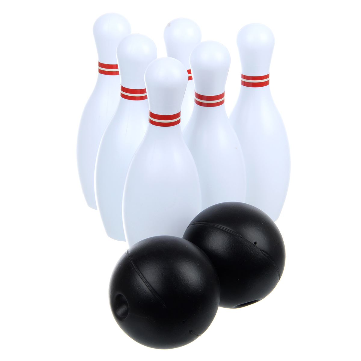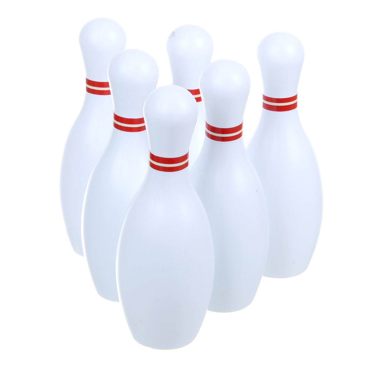 В наборе 6 кеглей, 2 шара, набор наклеек.