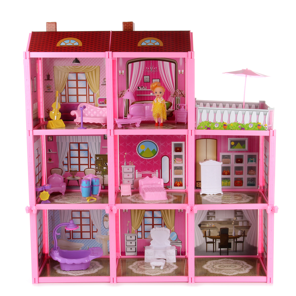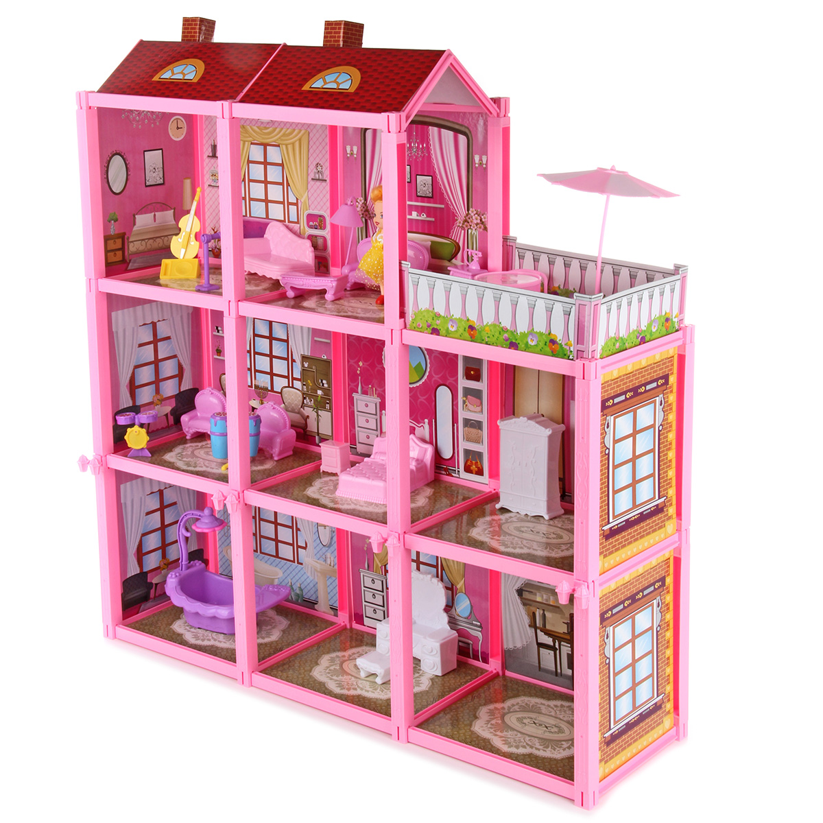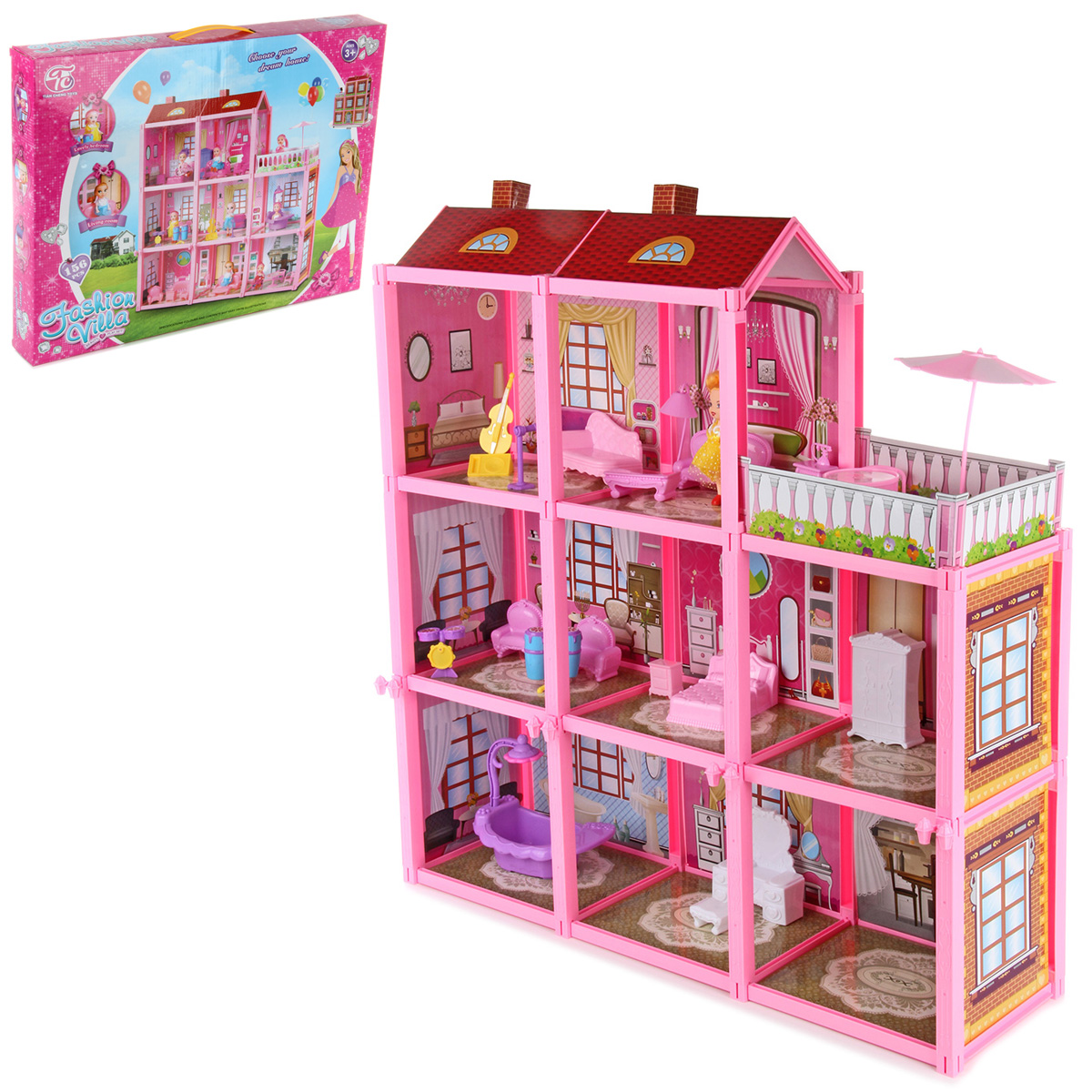 В комплект входят детали для постройки домика, картонные декорации, куколка, предметы интерьера (кроватка, диваны, туалетный столик, шкаф, кресла, виолончель, микрофон со стойкой, ударная установка, конги, тумба с телефоном, тумба, скамья, пуфик, напольный светильник), пляжная зона (столик, пляжный зонтик, пляжные кресла), ванна с душем и инструкция по сборке.