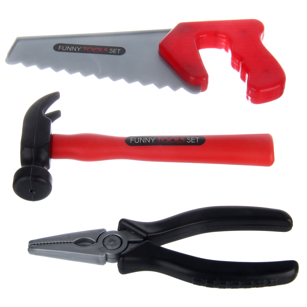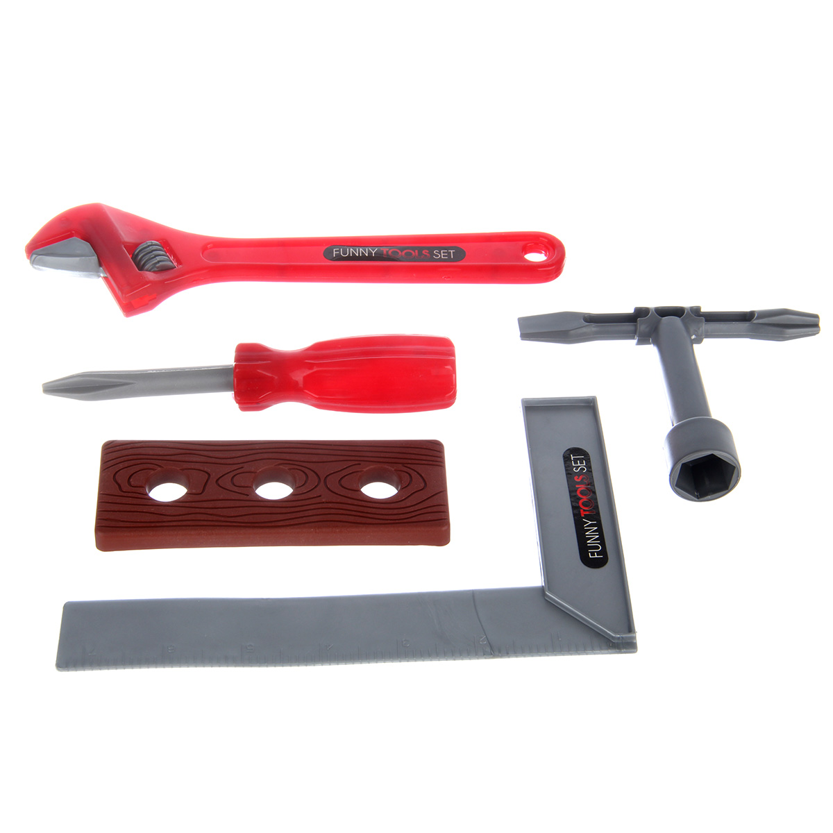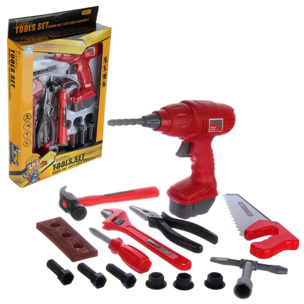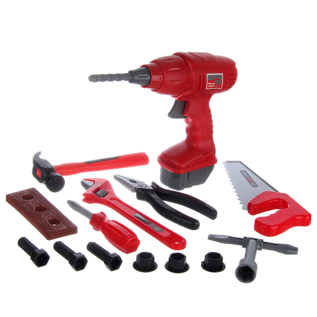 Шуруповерт, молоток, плоскогубцы, отвертка, ключ разводной, пила по дереву, угольник, элемент для скрутки, шестигранный ключ с т образной рукояткой, 3 гайки, 3 болта.