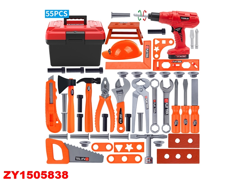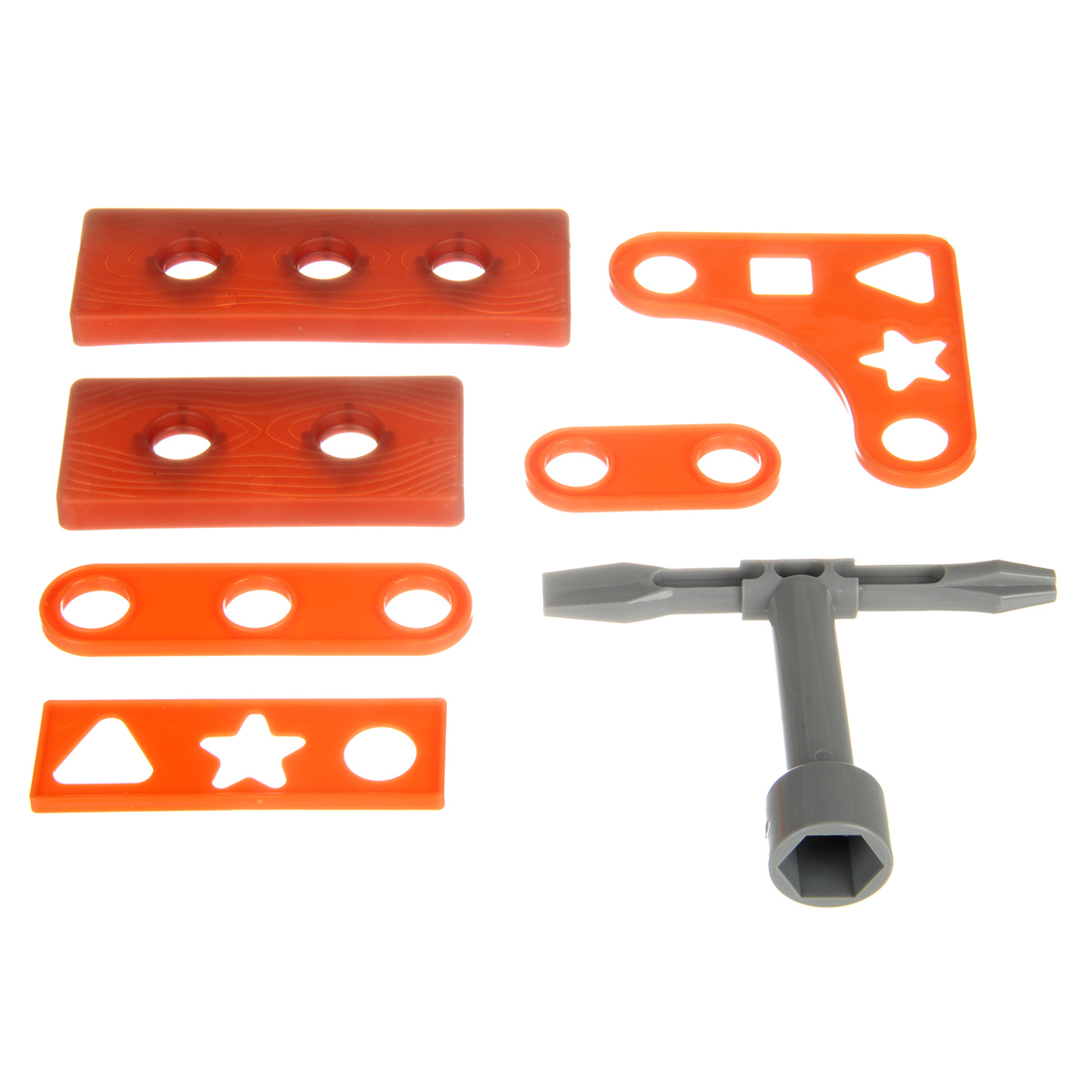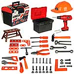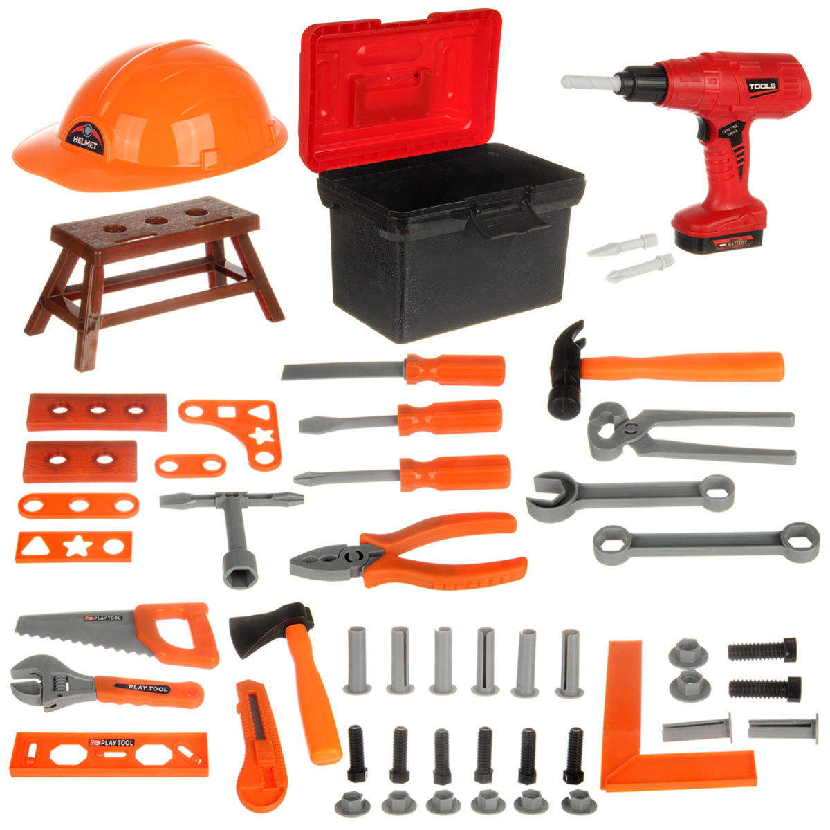 Комплектация. Шуруповерт, 3 насадки к нему, каска, пила, топорик, разводной ключ, молоток, пассатижи, нож канцелярский, клещи, 2 отвертки, комбинированный ключ, накидной ключ, торцевой ключ, угольник, стамеска, уровень, 5 деталей для сборки столика, 2 элемента для скрутки, 4 оранжевых элемента для скрутки, 8 гвоздей, 8 болтов, 8 гаек, чемоданчик упаковка, набор наклеек.