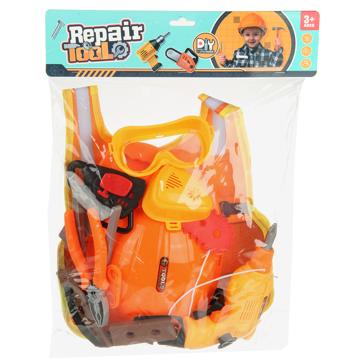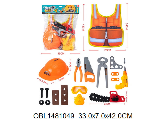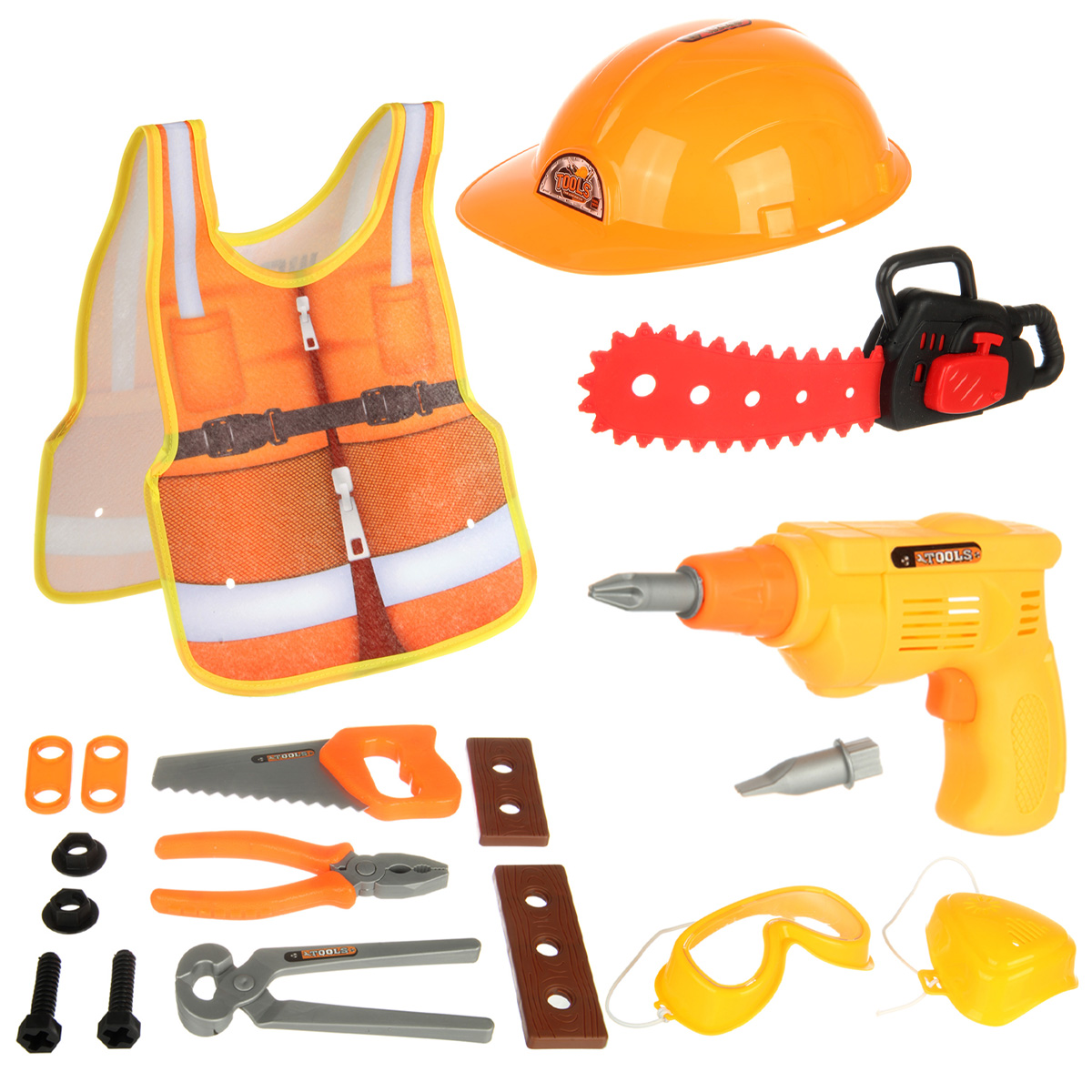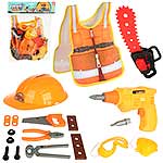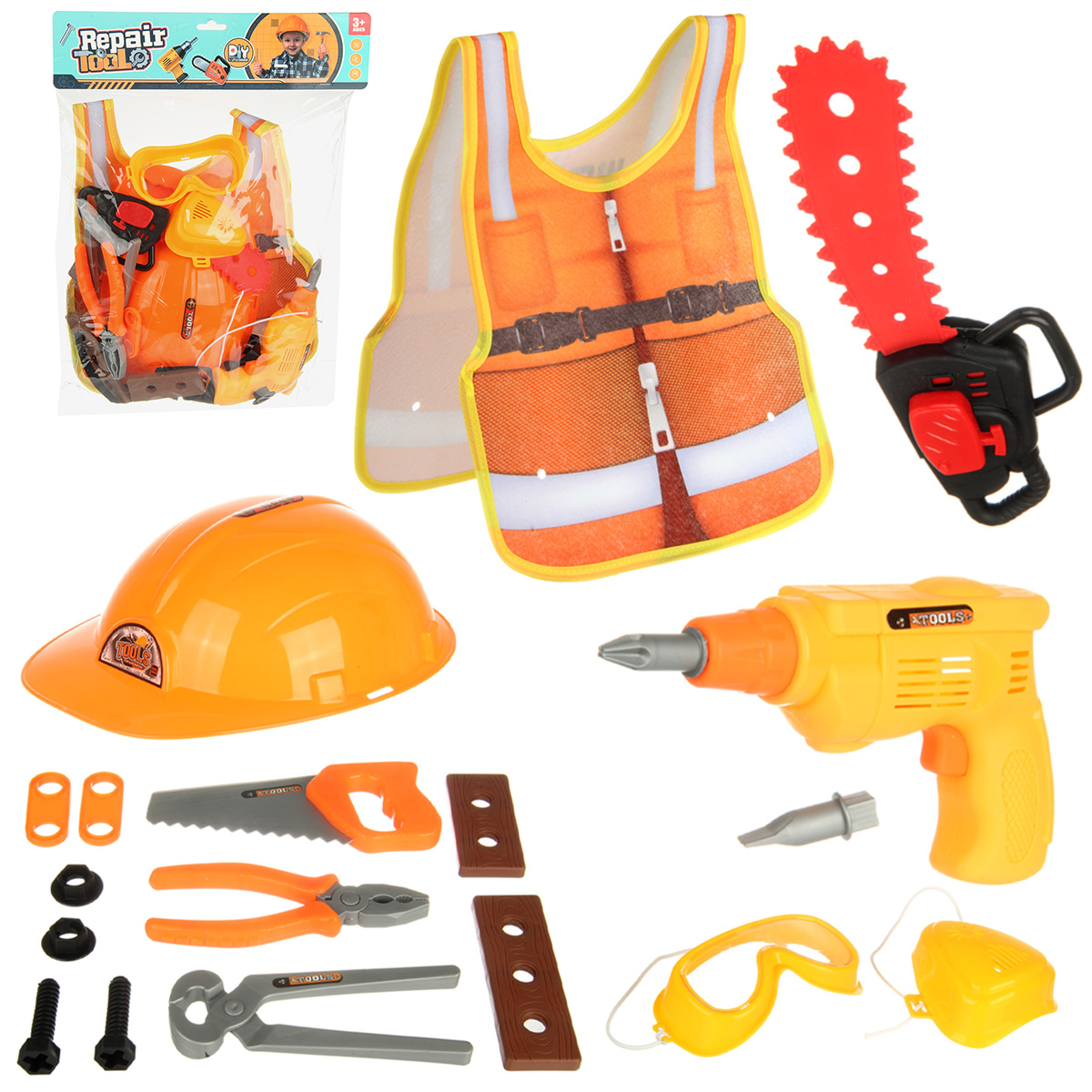 В комплекте жилет, игрушка шуруповерт с 2 насадками, игрушка бензопила, респиратор, очки, пассатижи, пила, клещи, 4 элемента для скрутки, 2 болта, 2 гайки, 2 ленты, каска.