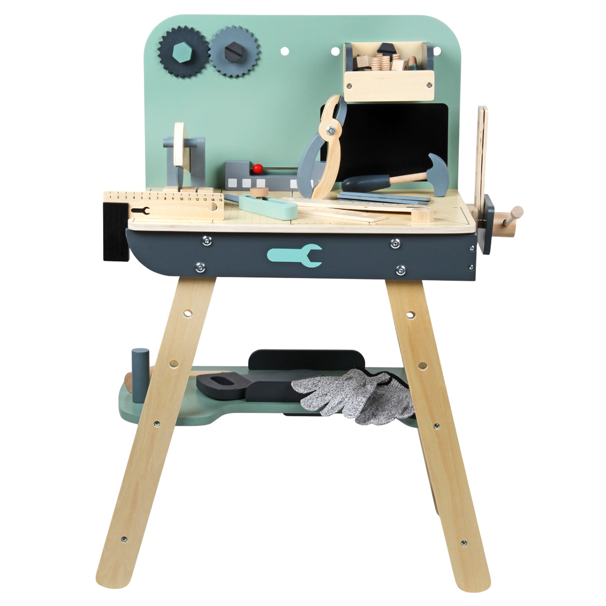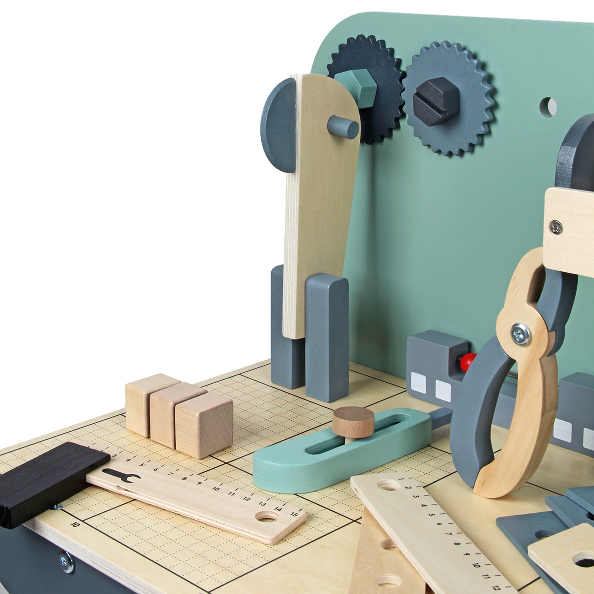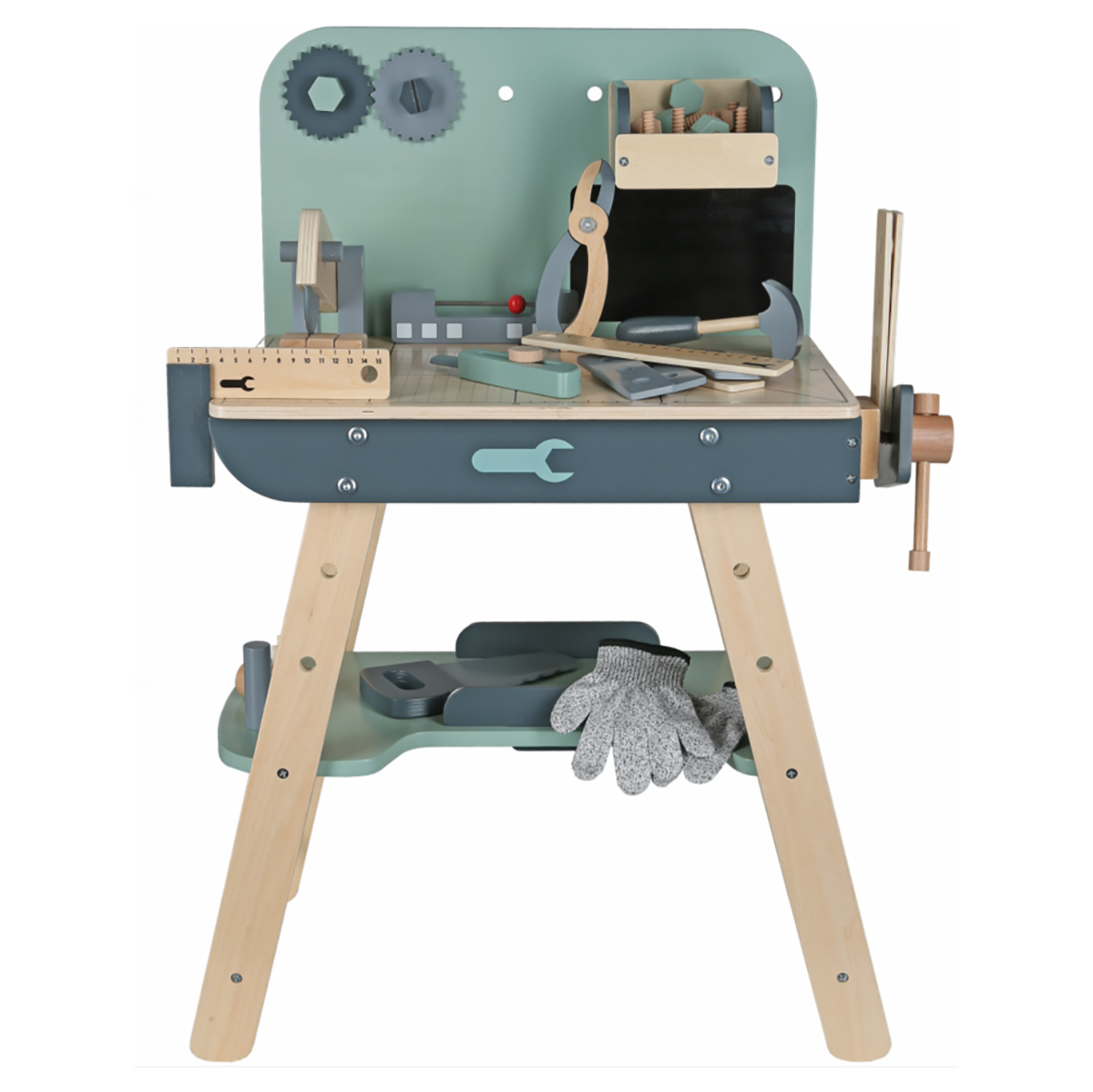 Роскошный детский верстак с большим количеством предметов. Инструменты с подвижными деталями и комфортными для хвата ручками, вкручиваем и откручиваем болты и гайки в элементы для скрутки, имитация маятниковой пилы, тисков и уровня, перчатки на резинке.