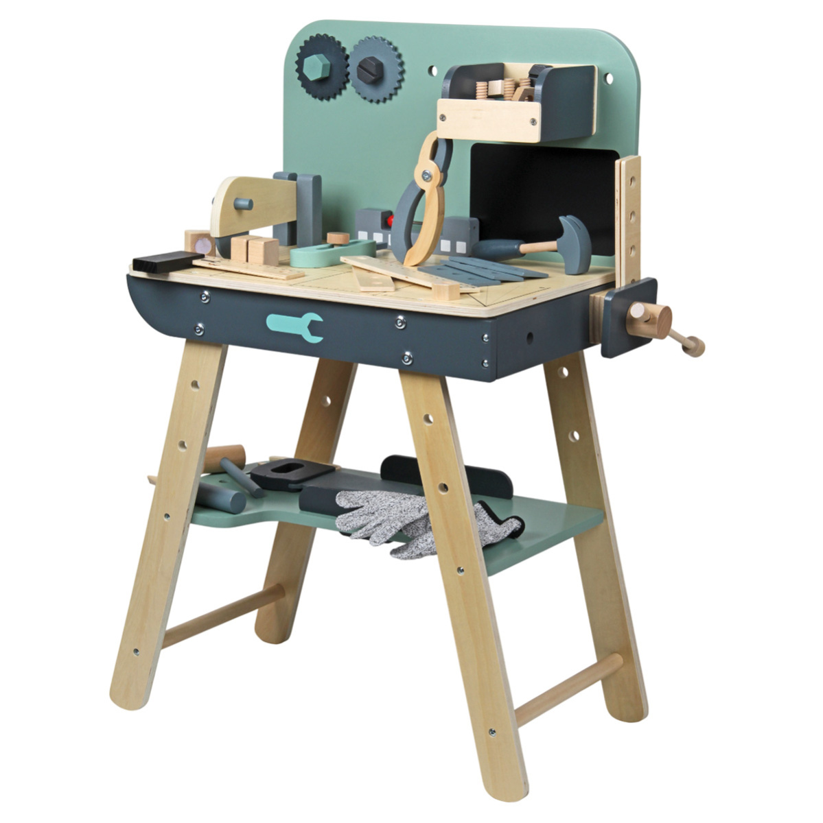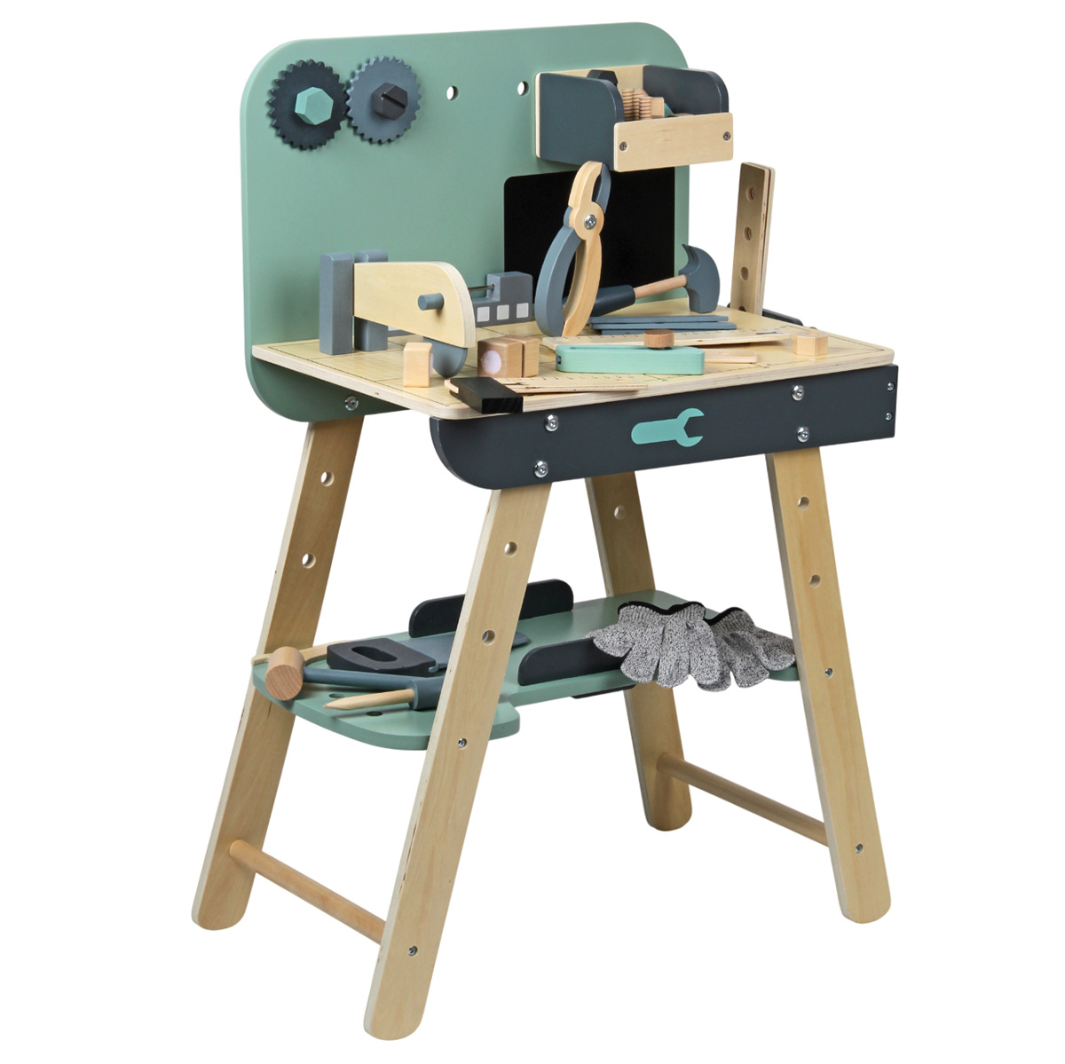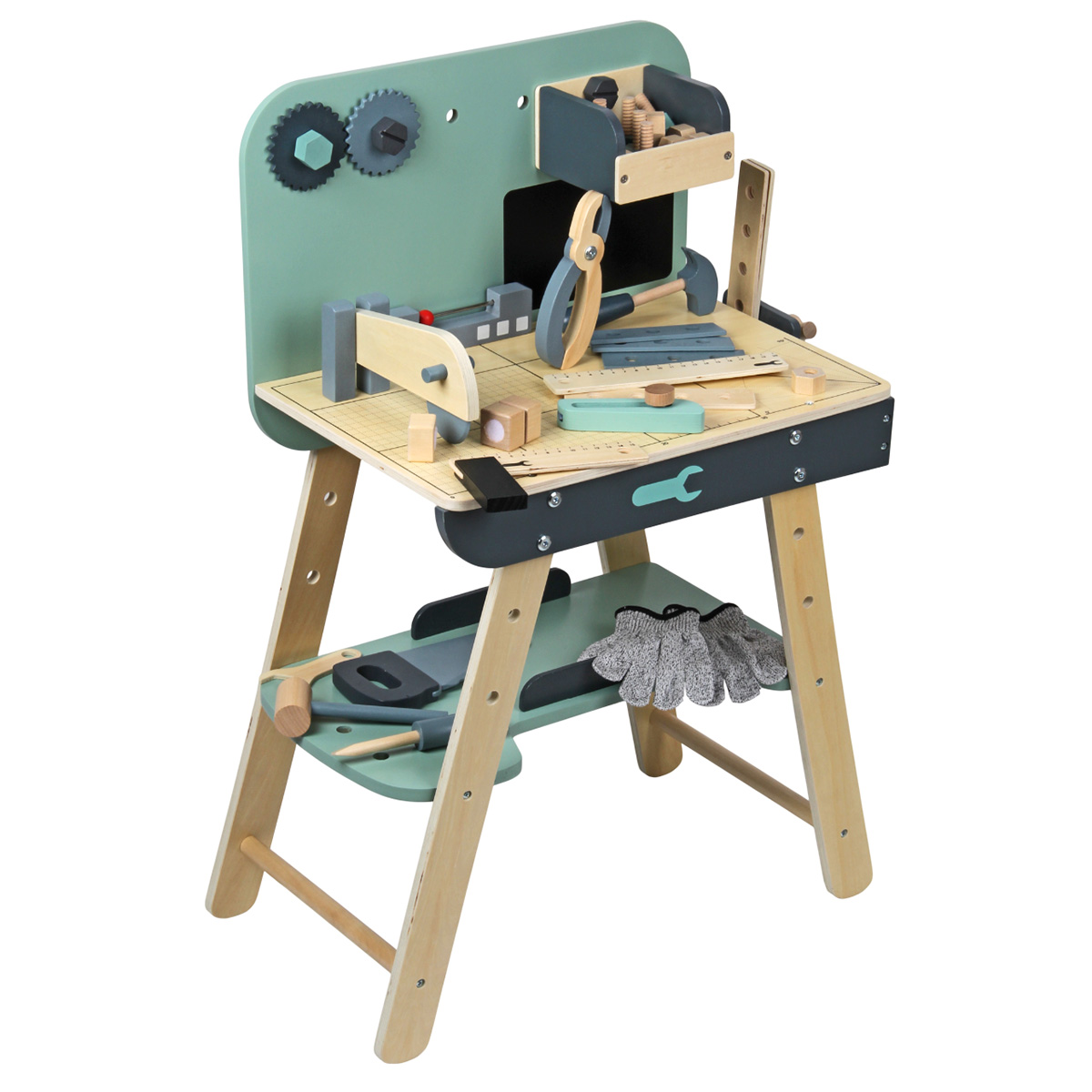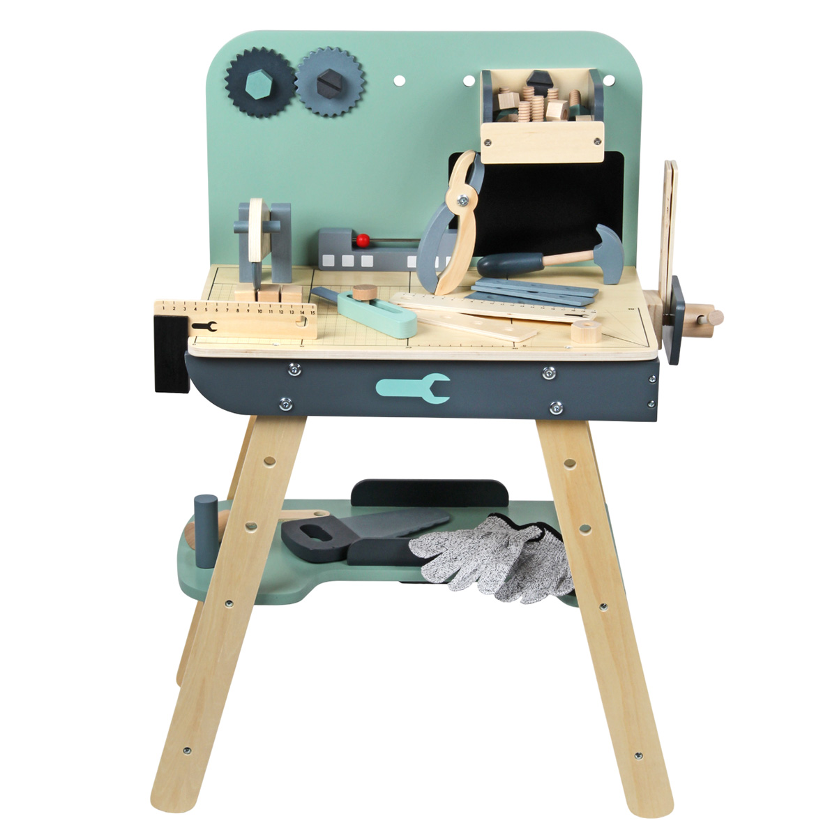 Роскошный детский верстак с большим количеством предметов. Инструменты с подвижными деталями и комфортными для хвата ручками, вкручиваем и откручиваем болты и гайки в элементы для скрутки, имитация маятниковой пилы, тисков и уровня, перчатки на резинке.