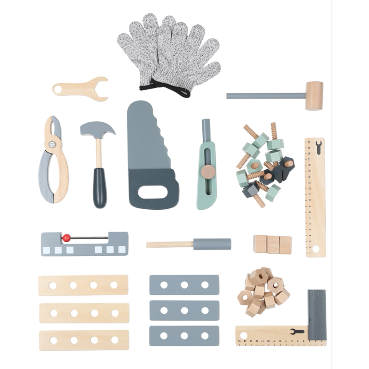 В наборе детали для сборки верстака, детали для сборки маятниковой пилы, детали для сборки тисков, детали для сборки ящичка для мелких предметов, пила, угольник, канцелярский нож, уровень, киянка, пассатижи, молоток, гаечный ключ, отвертка, линейка, 6 элементов для скрутки, 3 элемента на липучках для имитации работы маятниковой пилы, пара перчаток, 2 шестеренки, 10 болтов, 10 гаек, инструкция по сборке на русском языке.