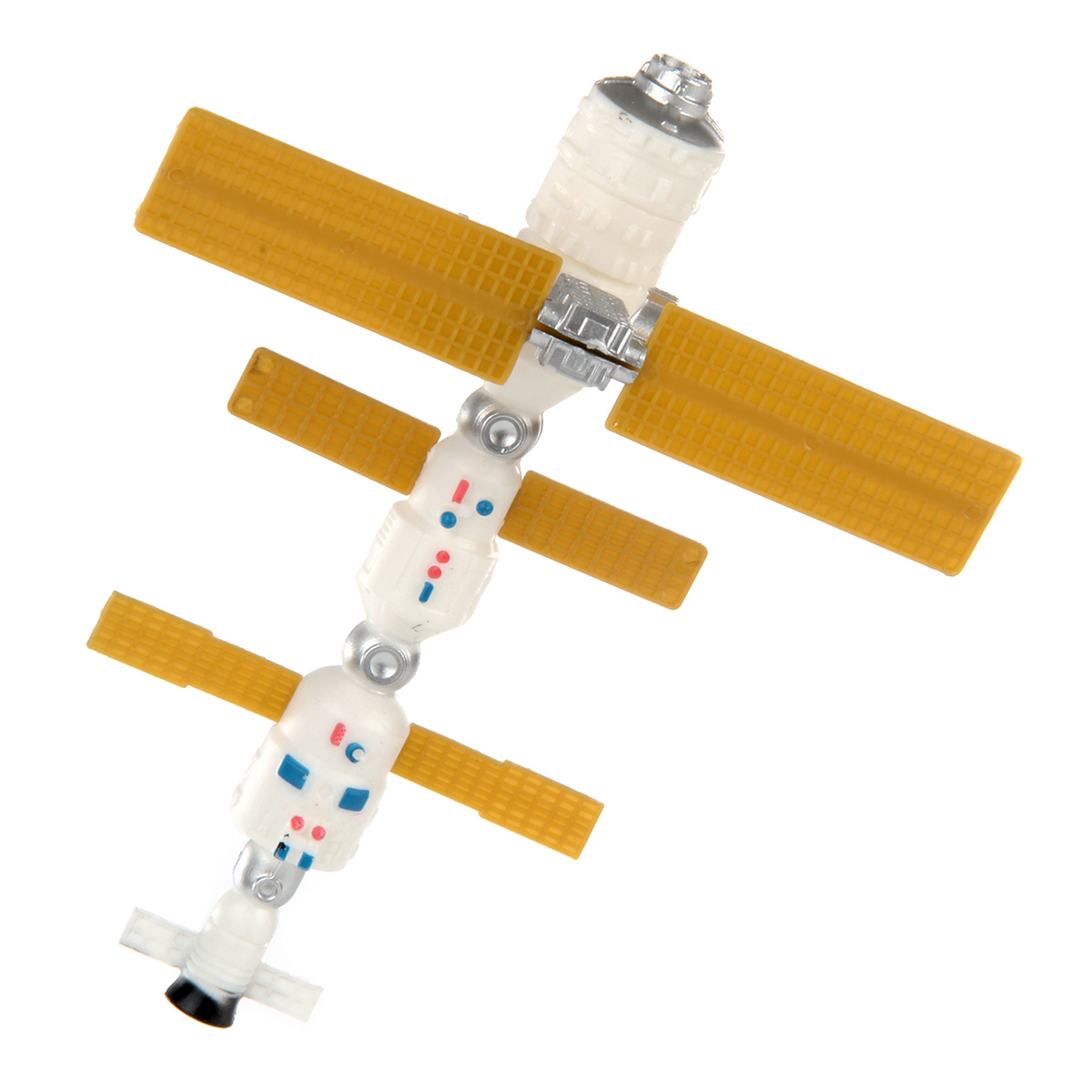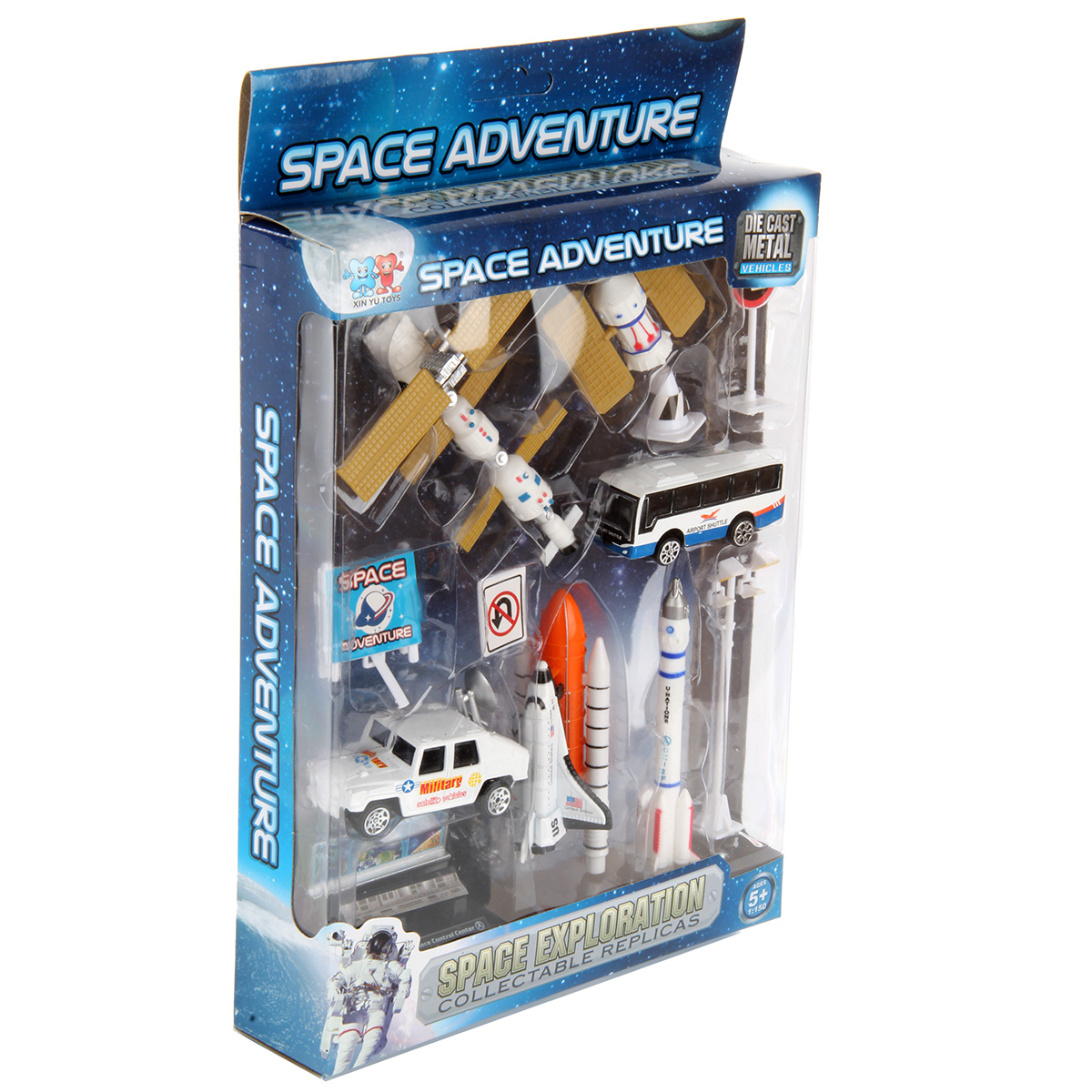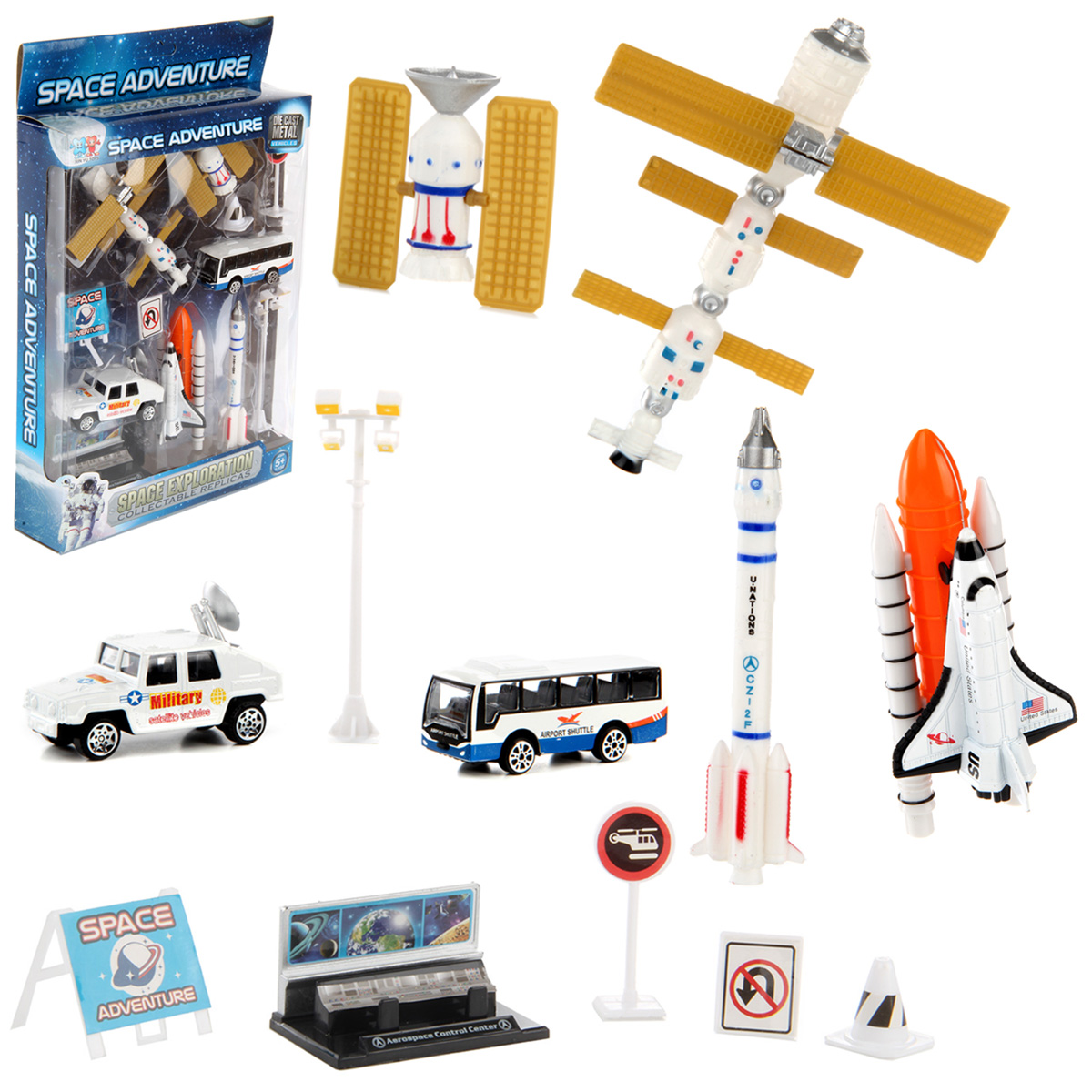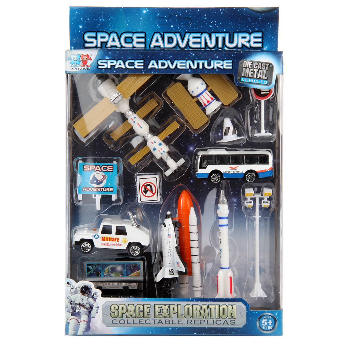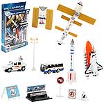Удивительная игрушка для всех маленьких любителей космоса. Игрушка имеет яркий, реалистичный дизайн, множество подвижных элементов. В комплект входит космическая станция, космический телескоп, ракета, шаттл, панель управления, автобус, джип, фонарь, 4 дорожных знака. Функционал игрушки: -машинки и шаттл двигаются вперёд назад; -солнечные панели телескопа поворачиваются; -тарелка на джипе подвижна; -шаттл отсоединяется от топливного бака. Размеры упаковки: 12*5*32 см. Размеры шаттла: 7*5*3 см. Размеры космической станции: 12*10*3 см. Размеры автобуса: 8*3*3 см. Размеры панели управления: 6*4*4 см. Изготовлено из пластика, металла.