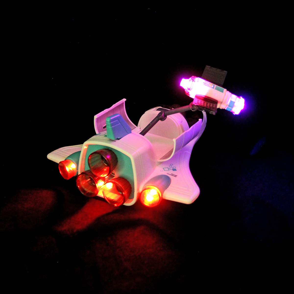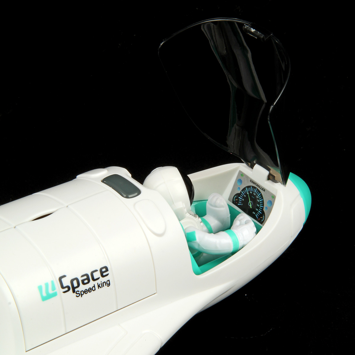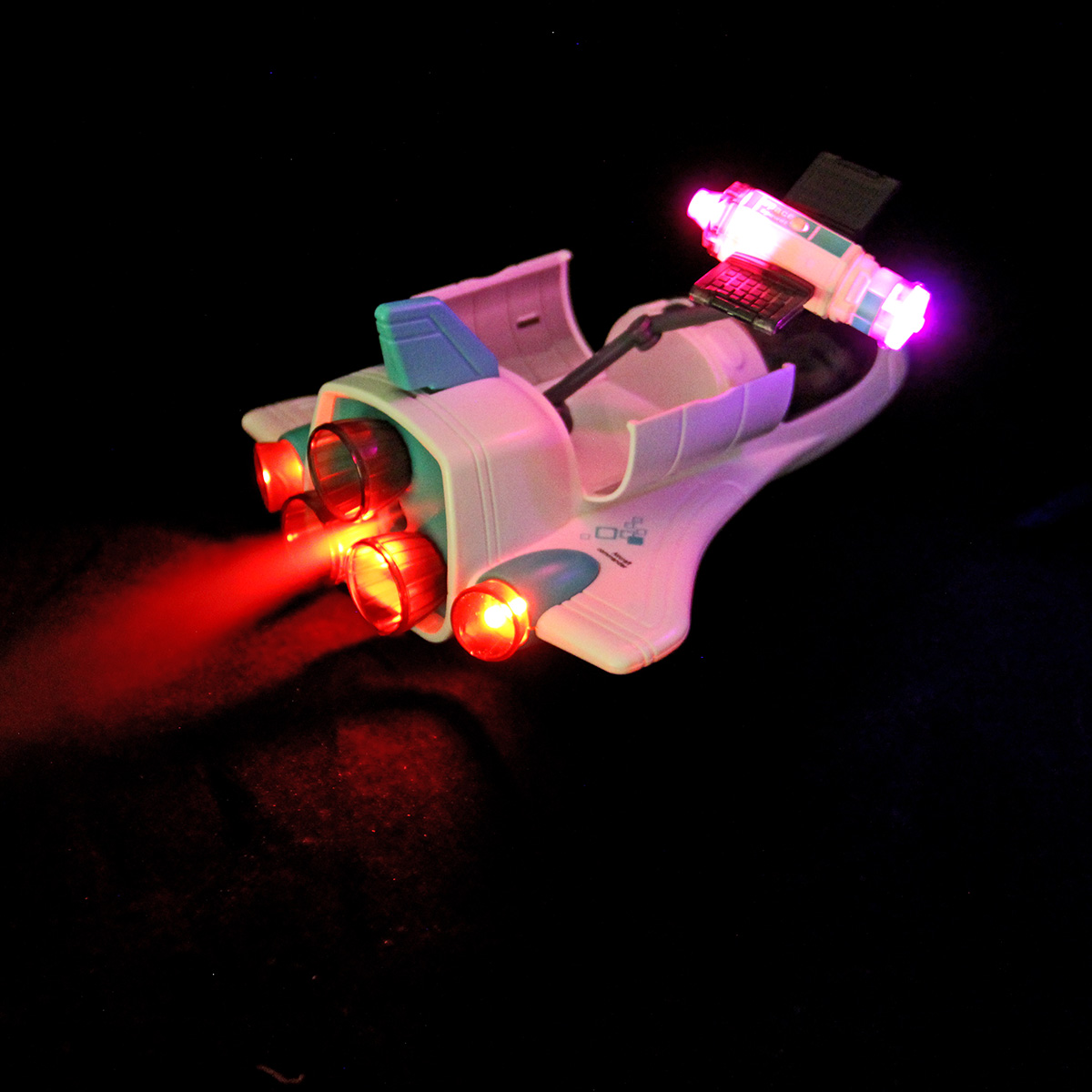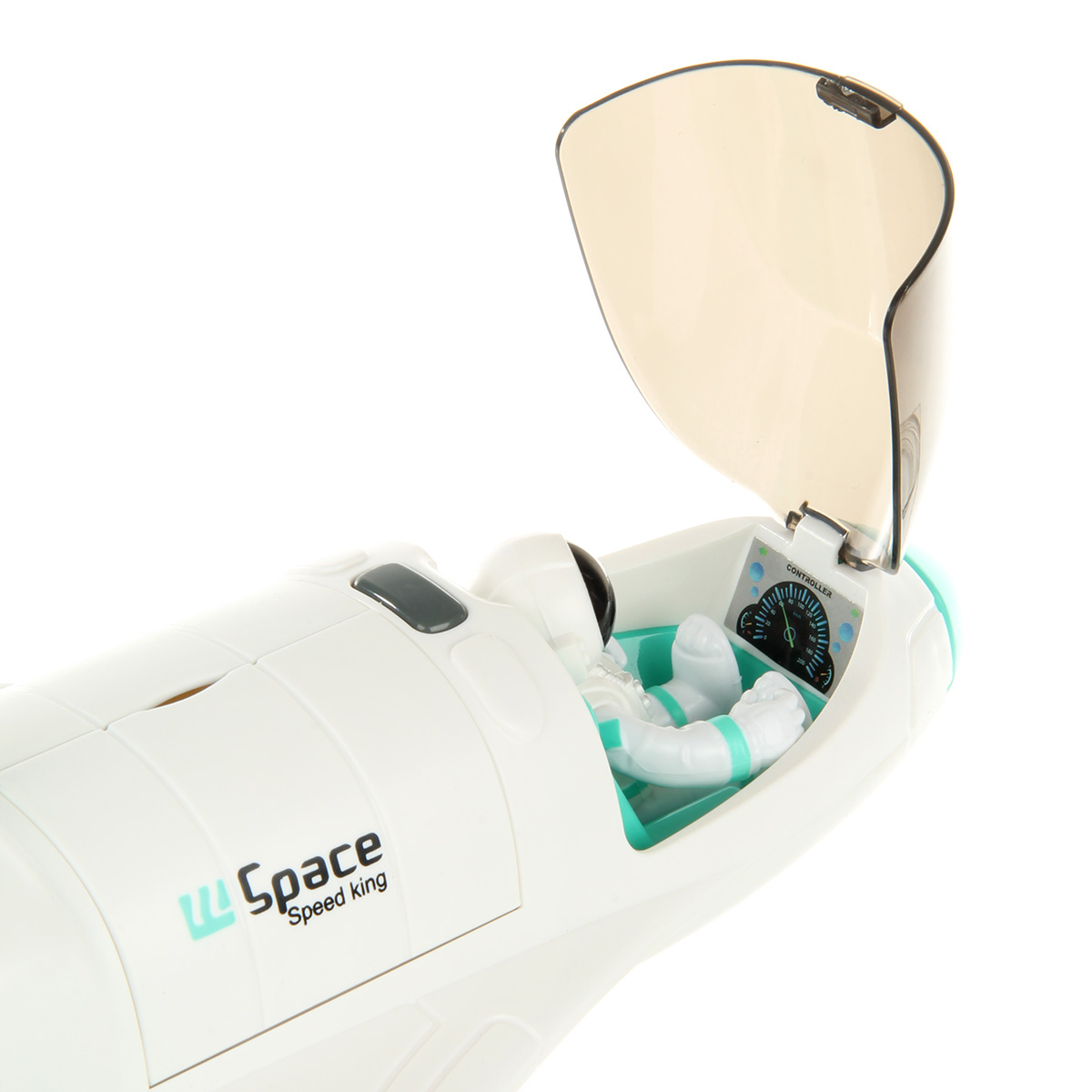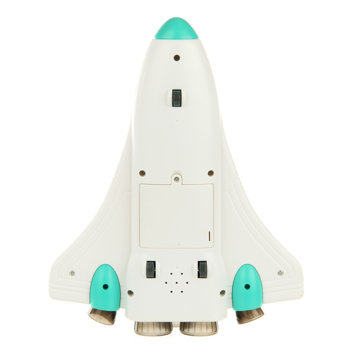 Функционал ракеты. При нажатии кнопки на корпусе ракета издает звук взлета, 3 лампочки в задней части, где сопла, подсвечиваются красным, из отверстия с металлическим фрагментом идет пар, катается вперед и назад, кабина открывается, можно посадить внутрь космонавта. Открываются двери отсека на корпусе, поднимается и раскладывается манипулятор, манипулятор крутится. На манипуляторе можно закрепить космонавта.