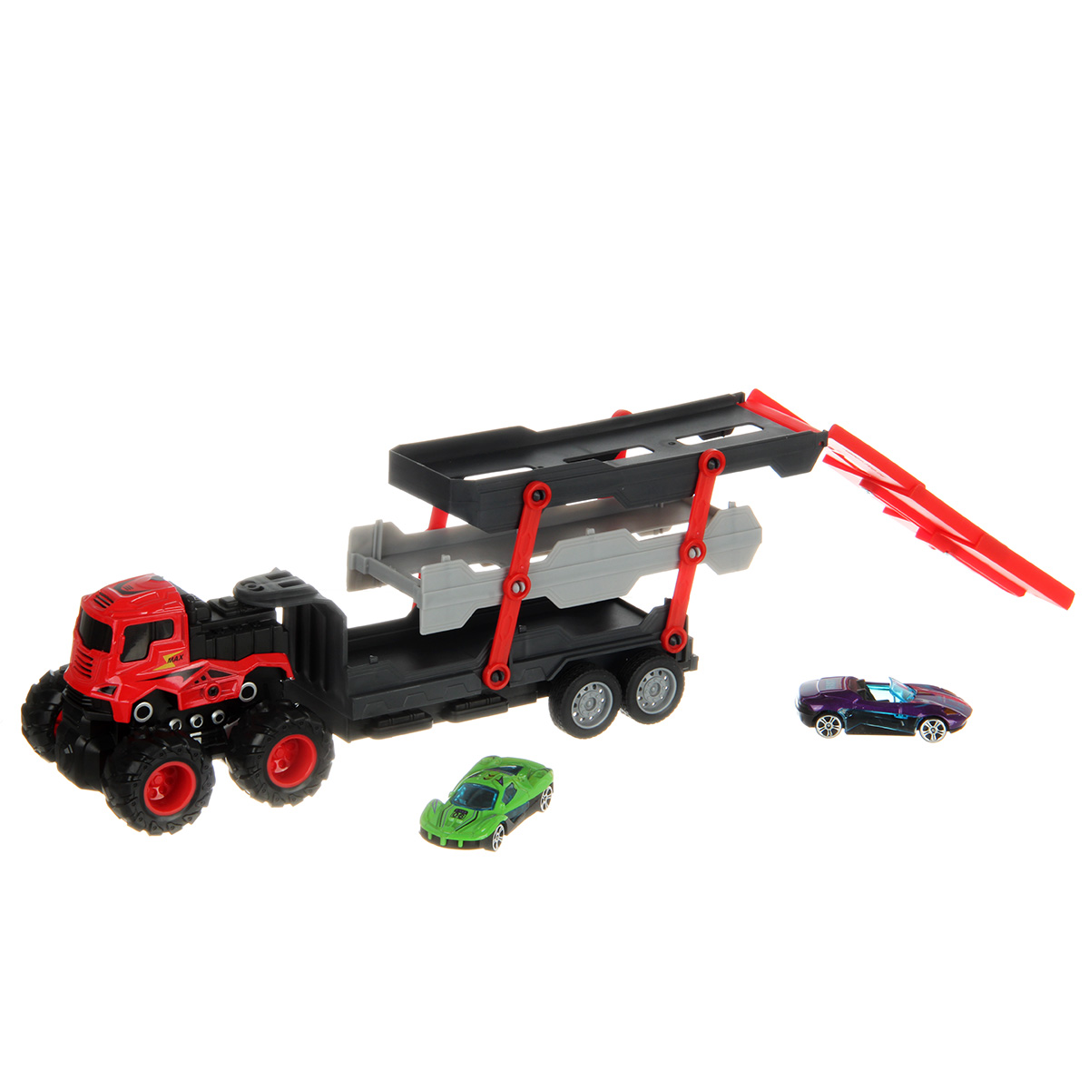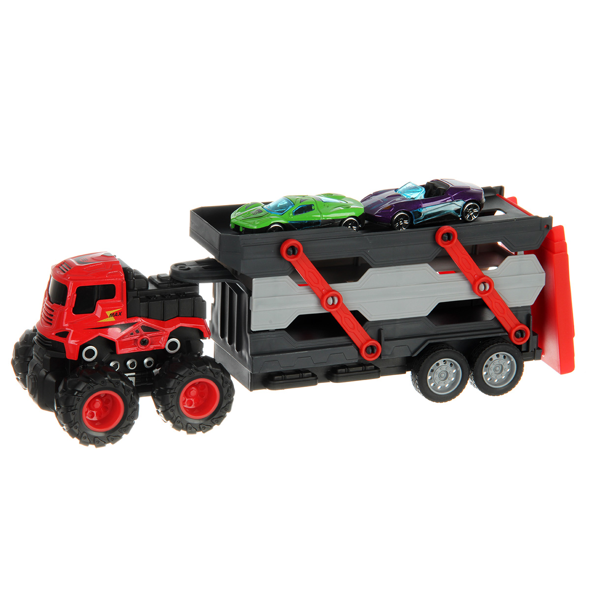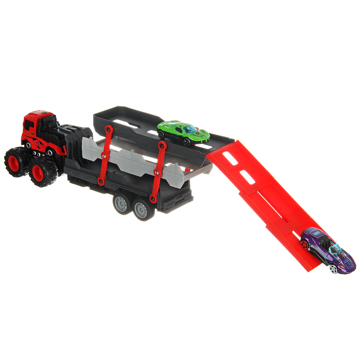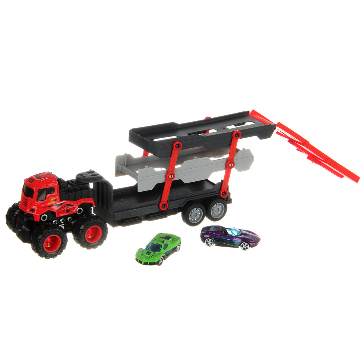 Игровой набор автовоз с фрикционным механизмом и металлическими гоночными машинками. Весь игрушечный транспорт катается вперёд и назад, платформа автовоза выдвигается, аппарель раскладывается. Детский трек для машинок изготовлен из прочных и долговечных материалов с вниманием к деталям. Оформлен в приятной расцветке.