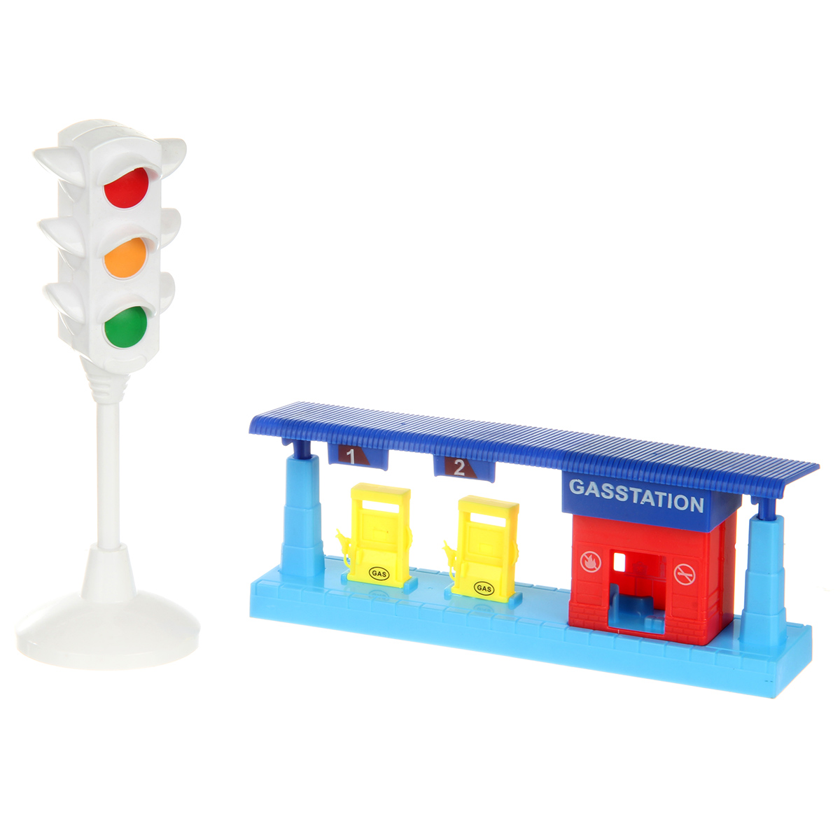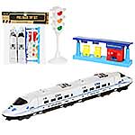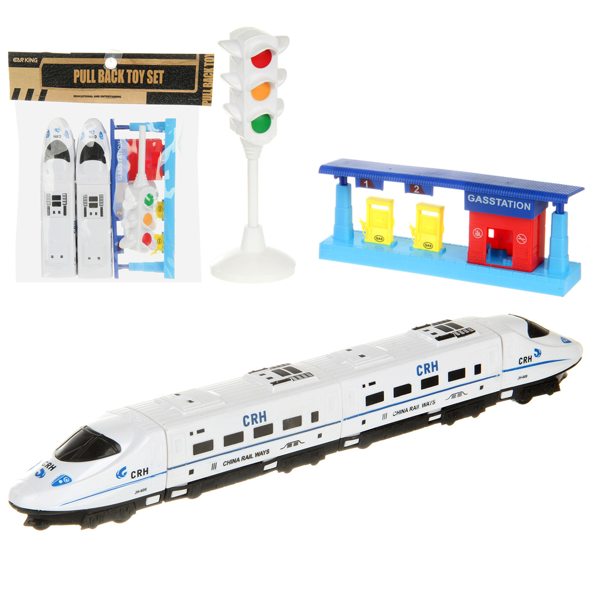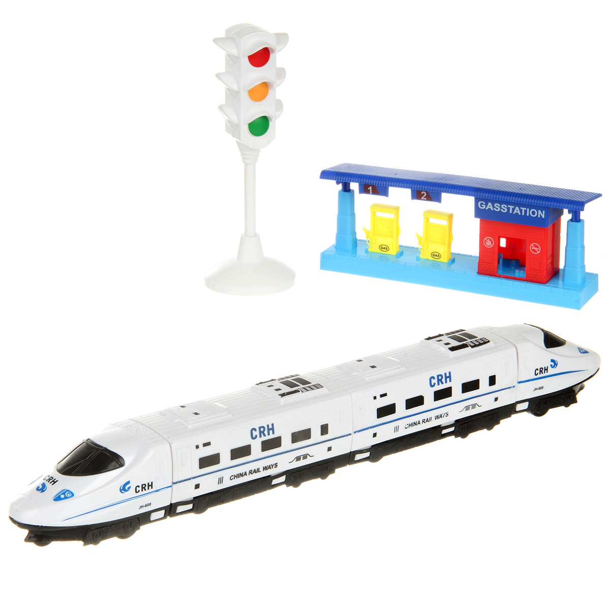 В наборе 2 локомотива, 2 вагона, подставка для светофора, светофор, бензоколонка. Локомотивы катаются вперед и назад, оснащены инерционным механизмом.