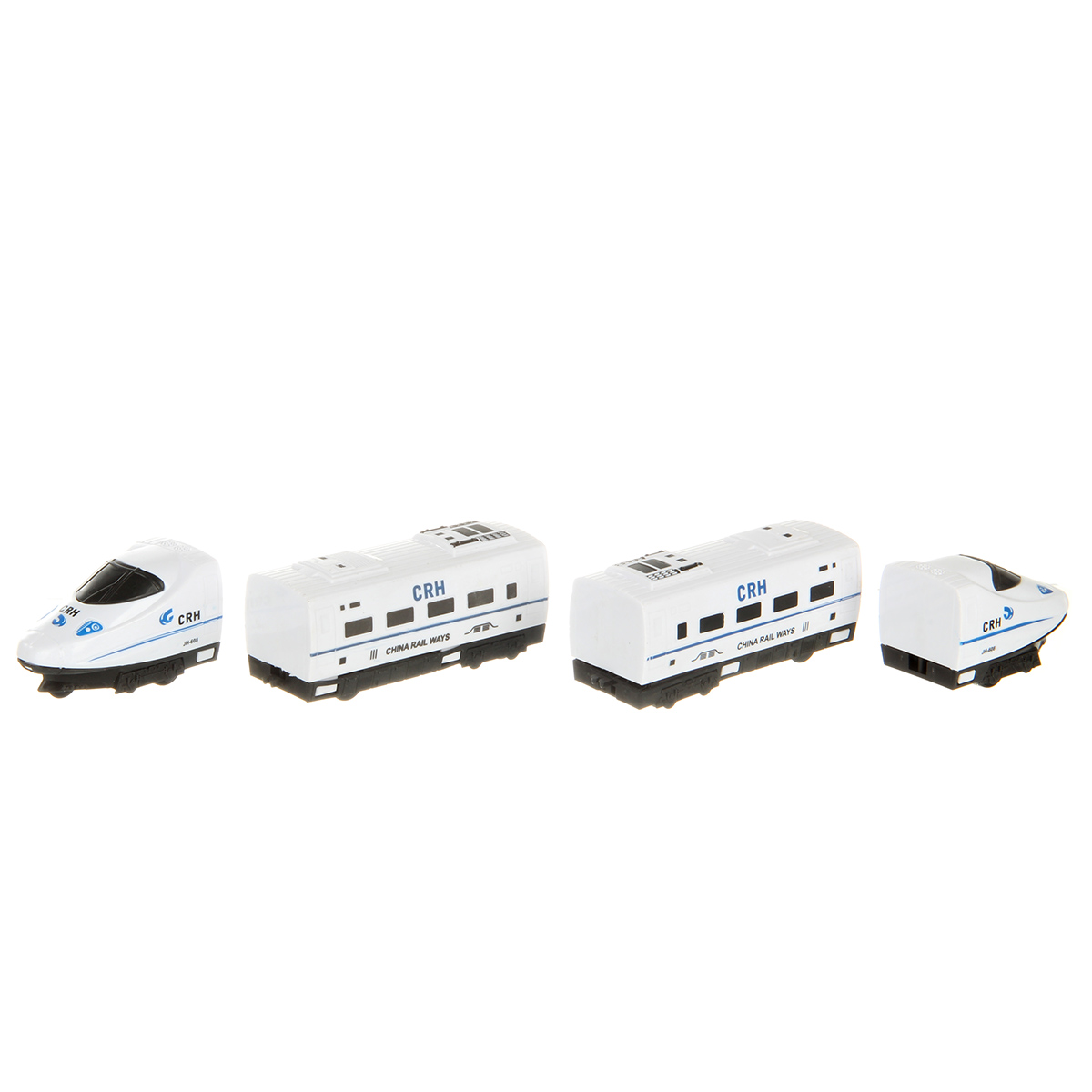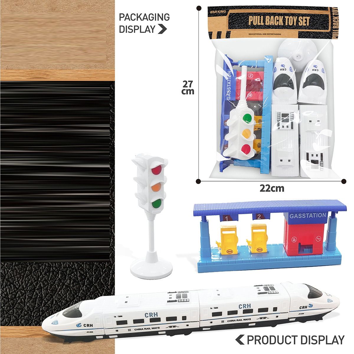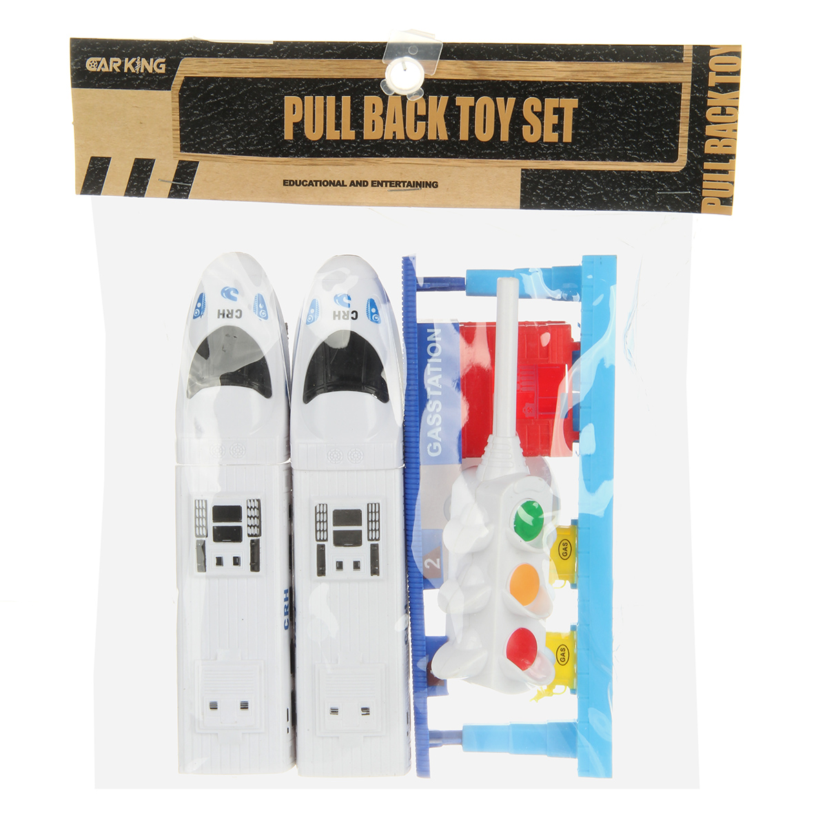 В наборе 2 локомотива, 2 вагона, подставка для светофора, светофор, бензоколонка. Локомотивы катаются вперед и назад, оснащены инерционным механизмом.