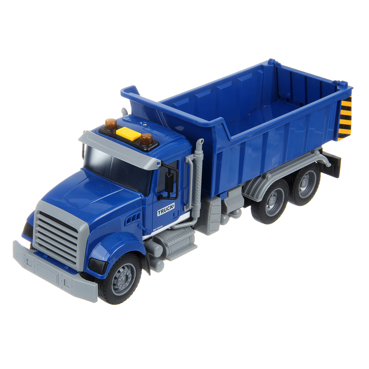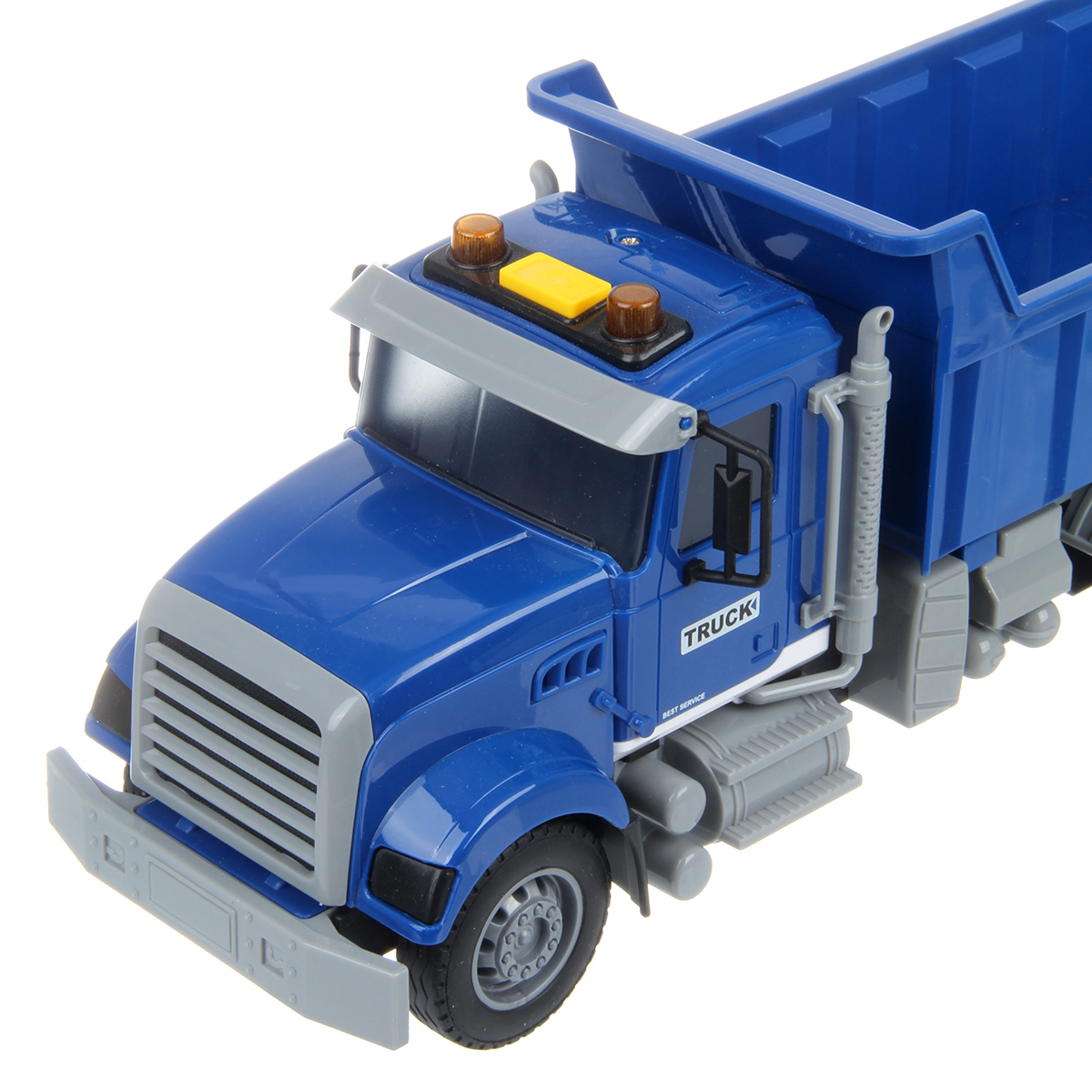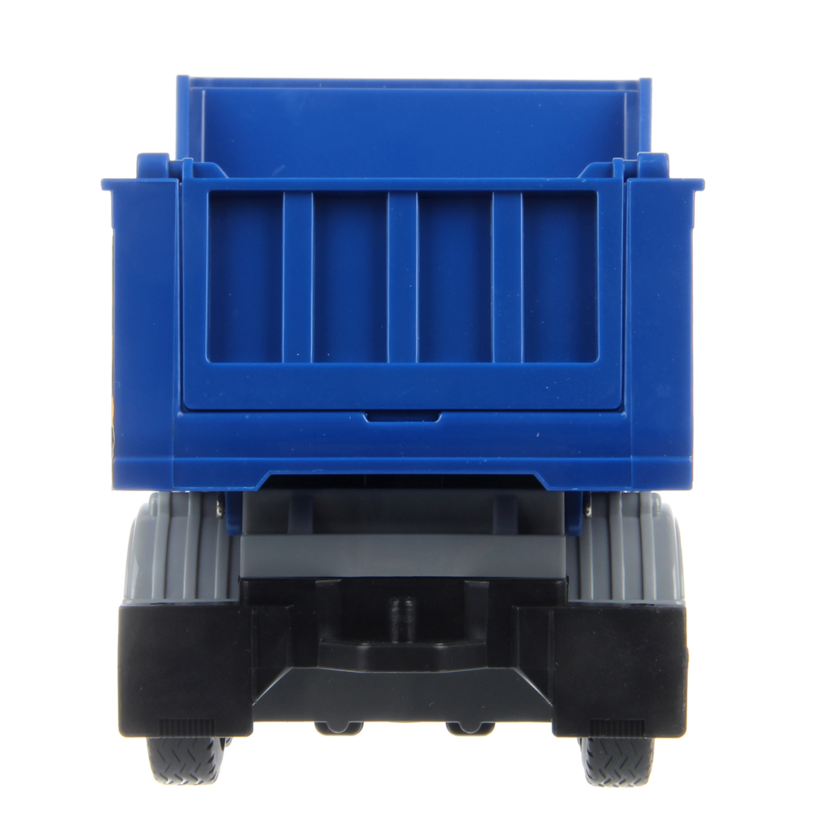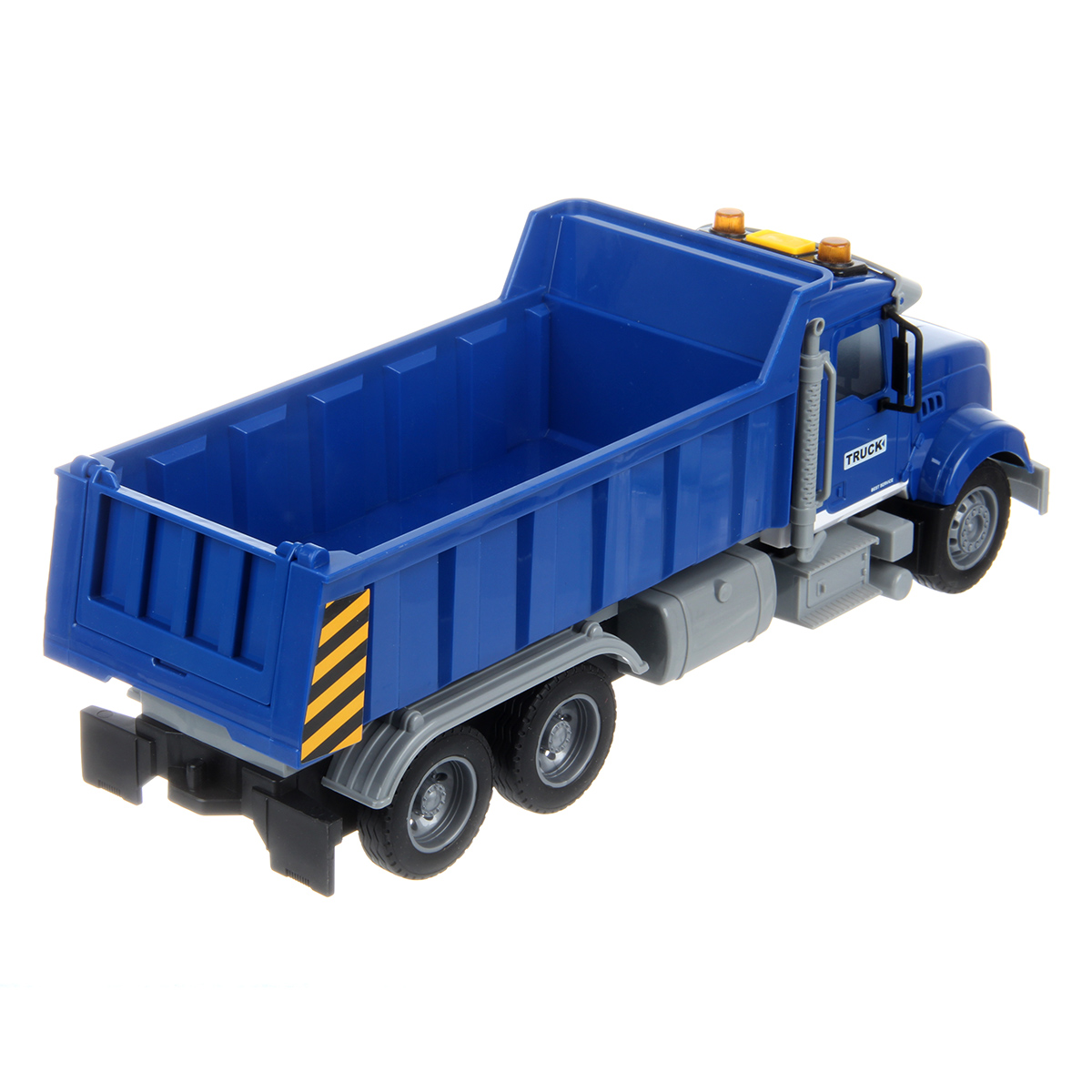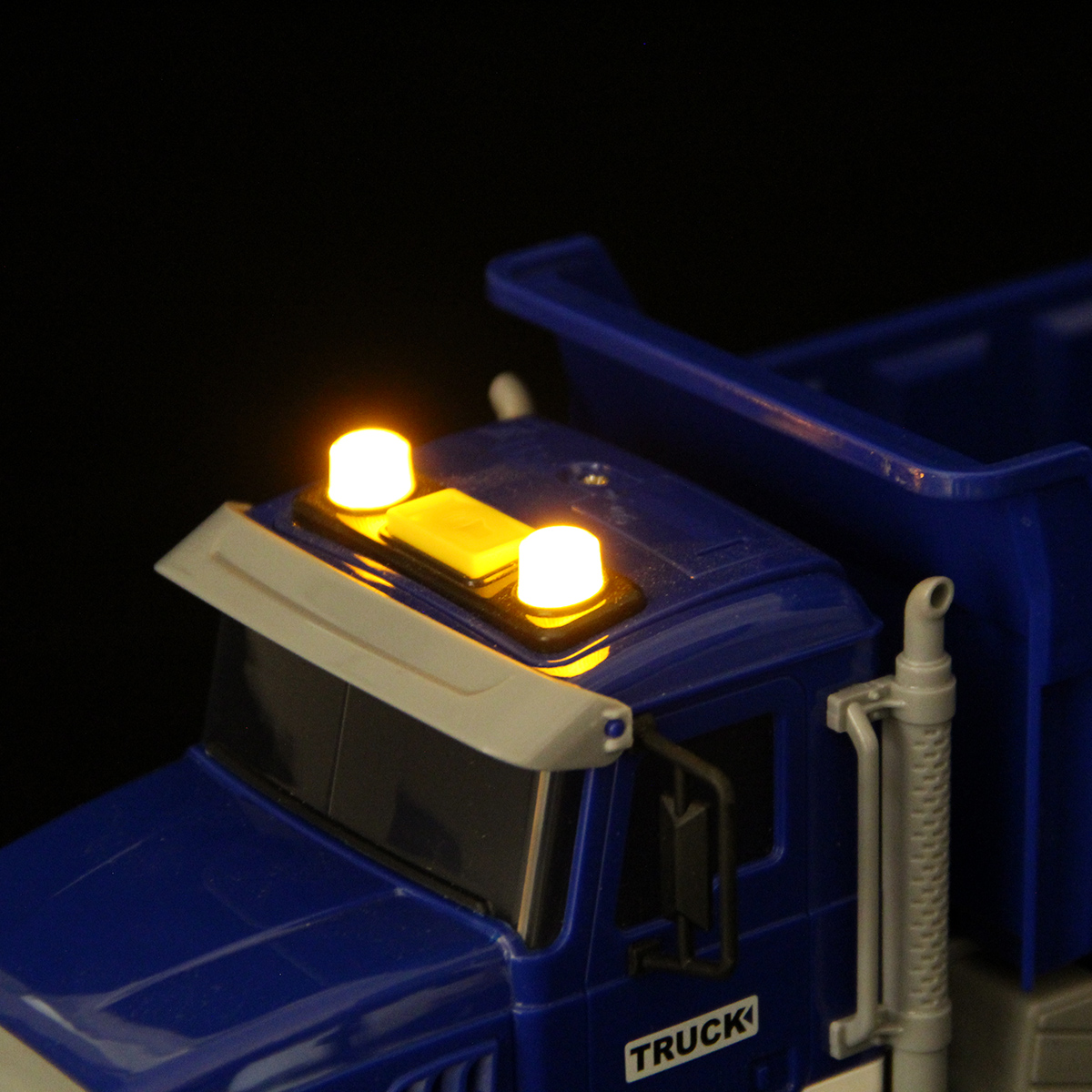 1. Самосвал катается вперед и назад, оснащен фрикционным механизмом, колеса прорезинены, боковые зеркала мягкие. При нажатии кнопки на кабине издает звуки работающего транспорта, заднего хода, гудка, заводящегося двигателя, подсветка лампочек на кабине. При нажатии бокового рычажка поднимается кузов.