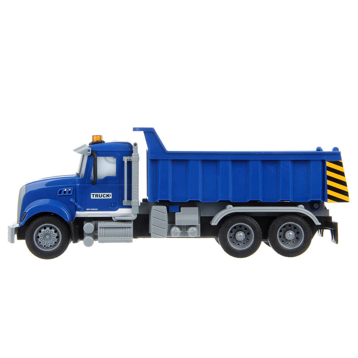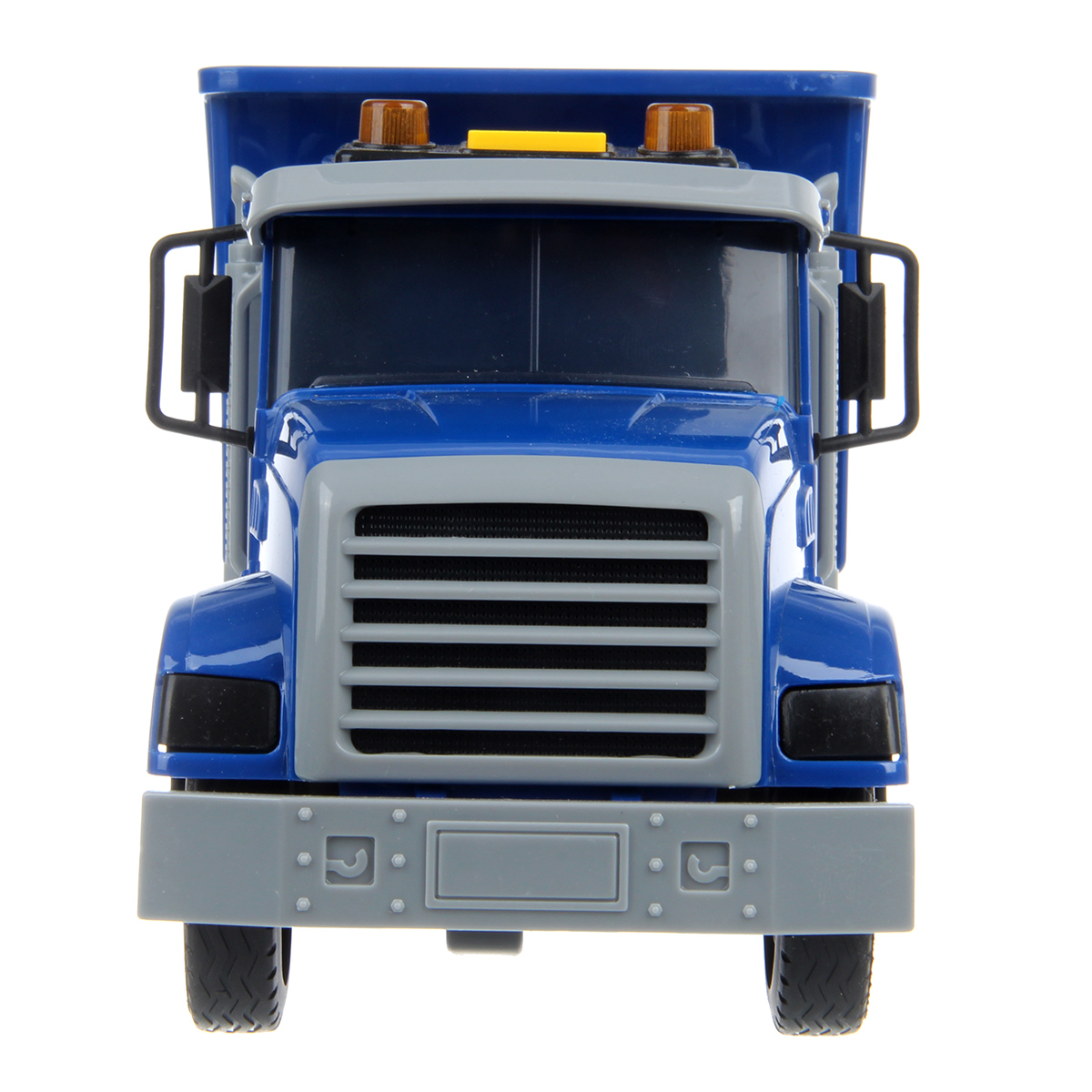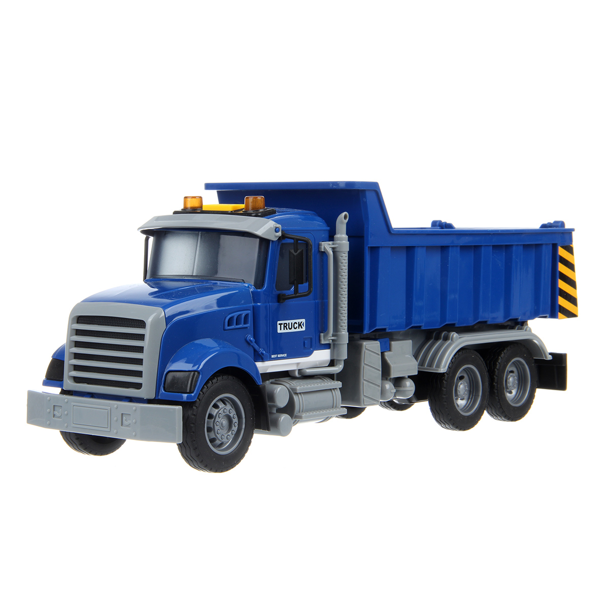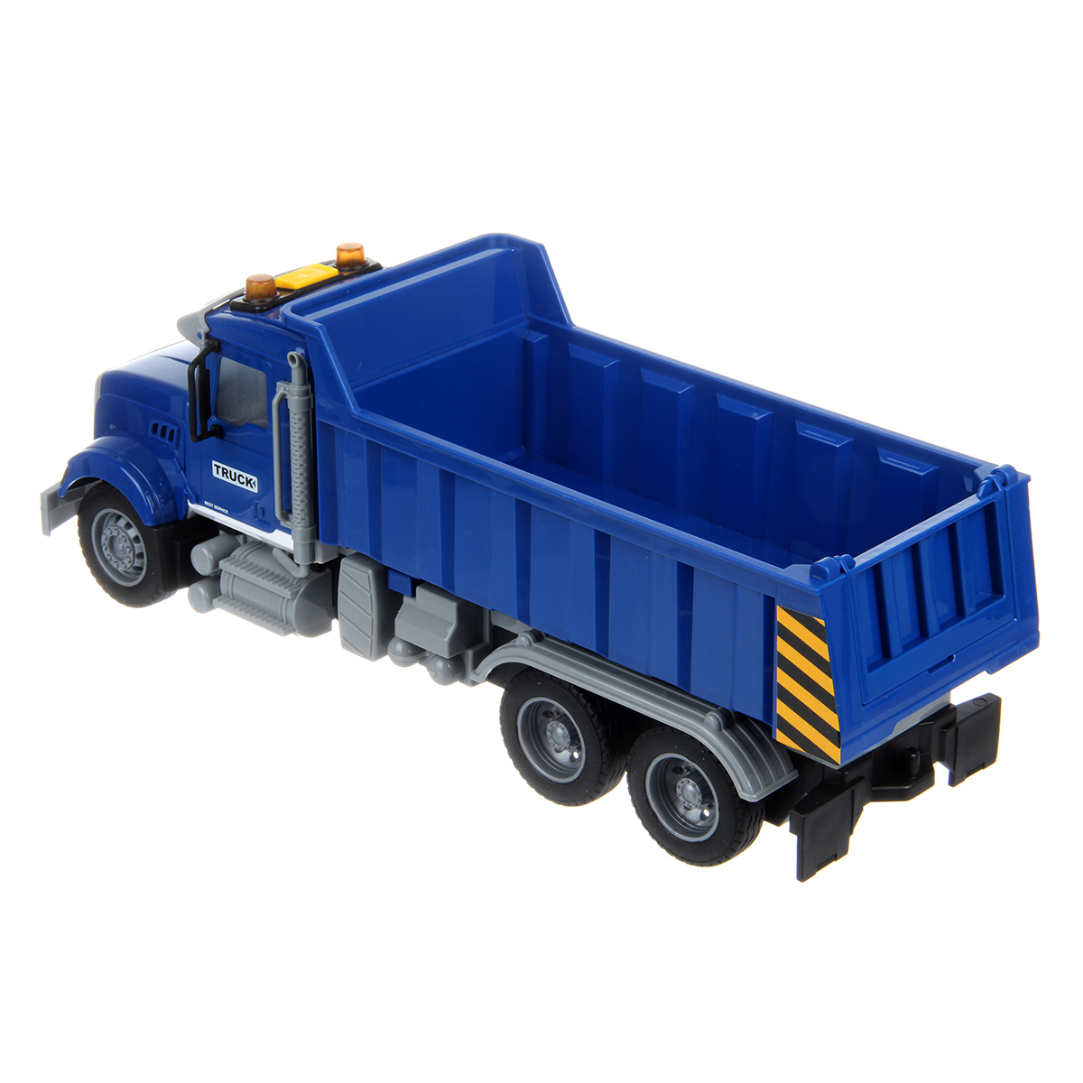1. Самосвал катается вперед и назад, оснащен фрикционным механизмом, колеса прорезинены, боковые зеркала мягкие. При нажатии кнопки на кабине издает звуки работающего транспорта, заднего хода, гудка, заводящегося двигателя, подсветка лампочек на кабине. При нажатии бокового рычажка поднимается кузов.