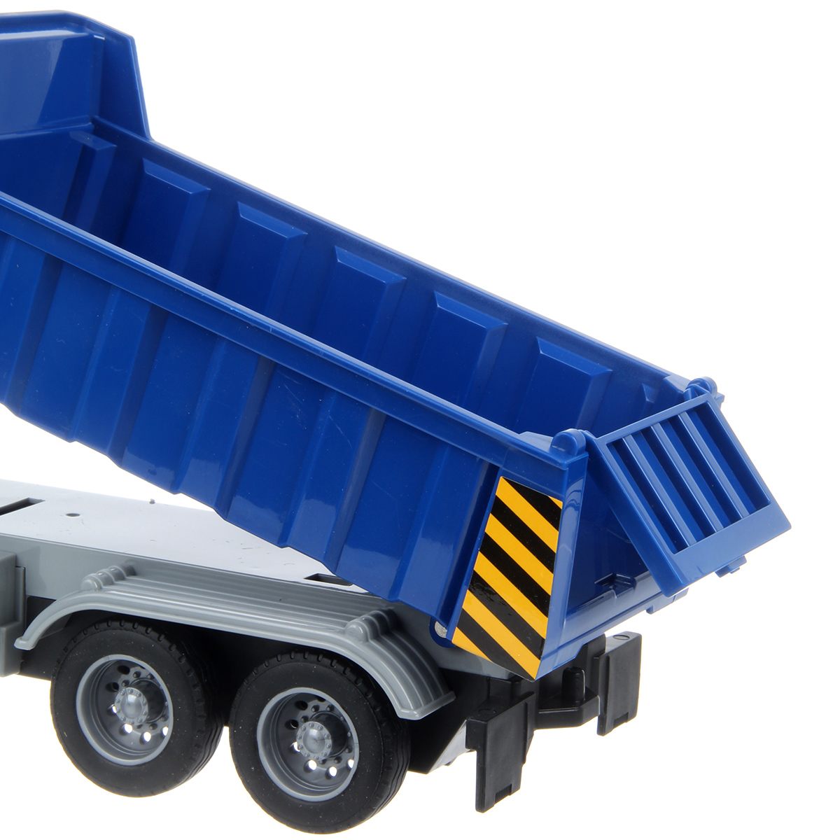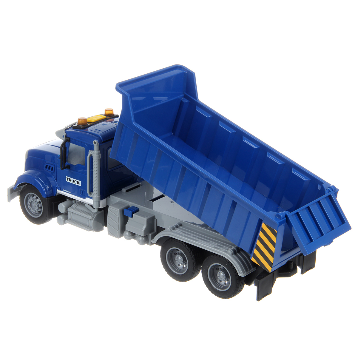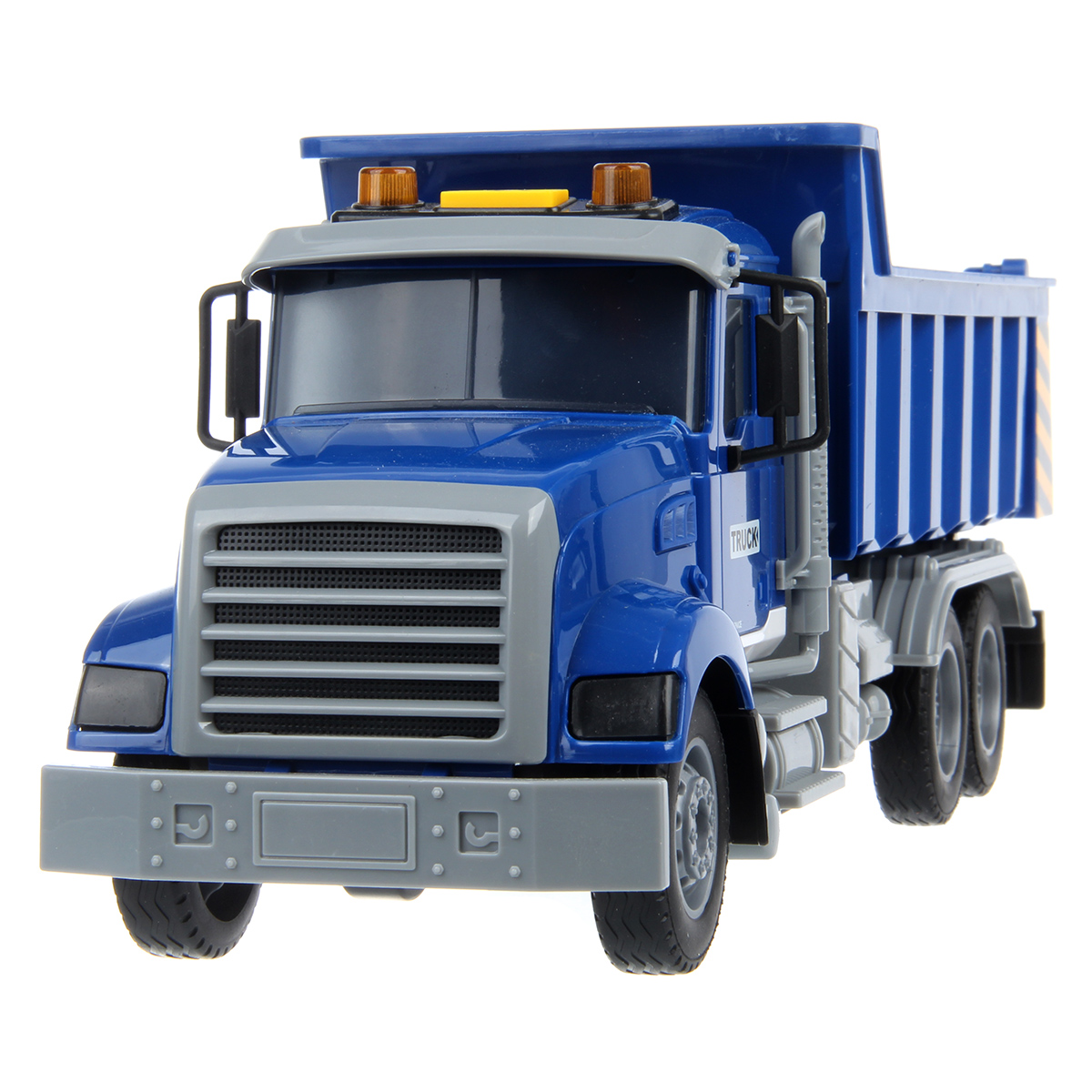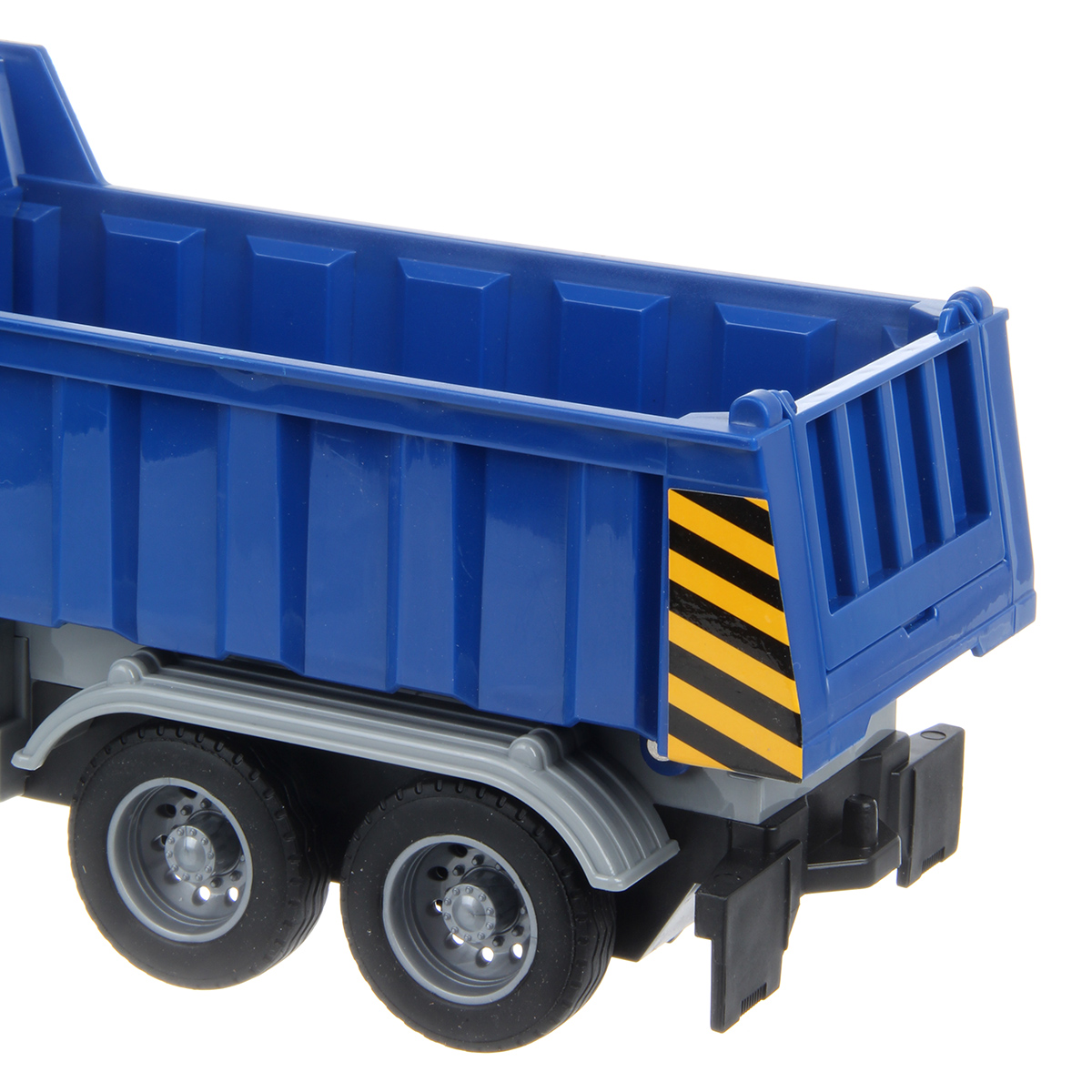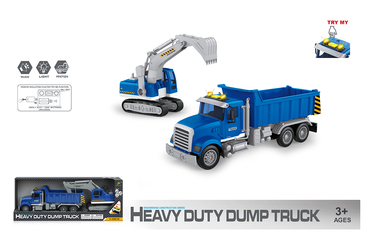 1. Самосвал катается вперед и назад, оснащен фрикционным механизмом, колеса прорезинены, боковые зеркала мягкие. При нажатии кнопки на кабине издает звуки работающего транспорта, заднего хода, гудка, заводящегося двигателя, подсветка лампочек на кабине. При нажатии бокового рычажка поднимается кузов.