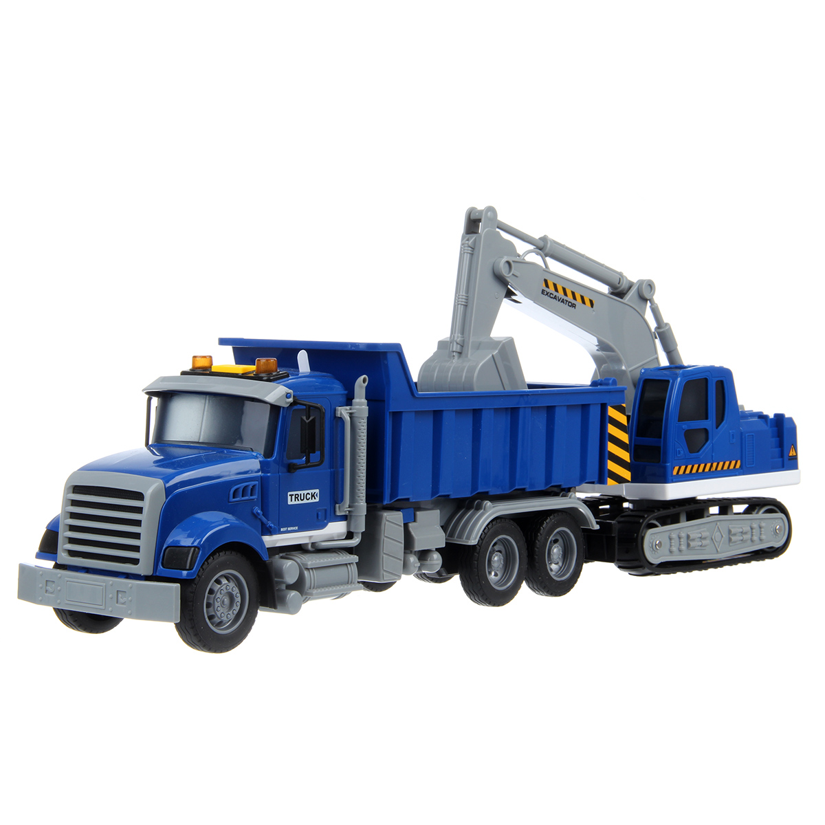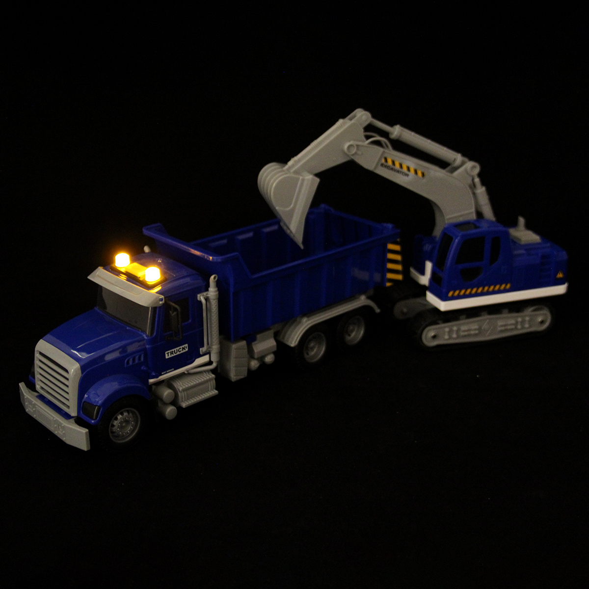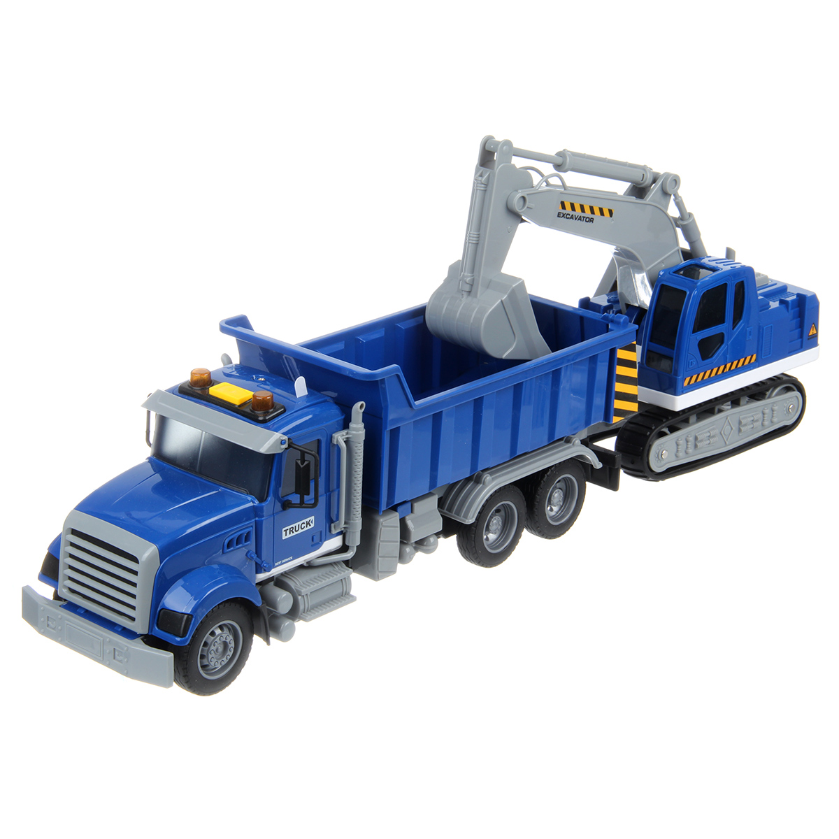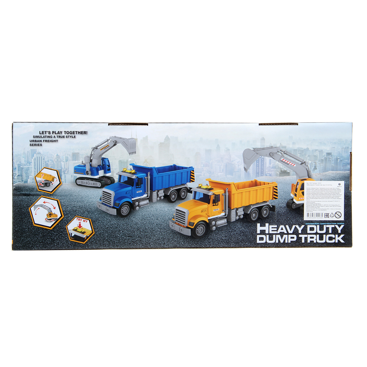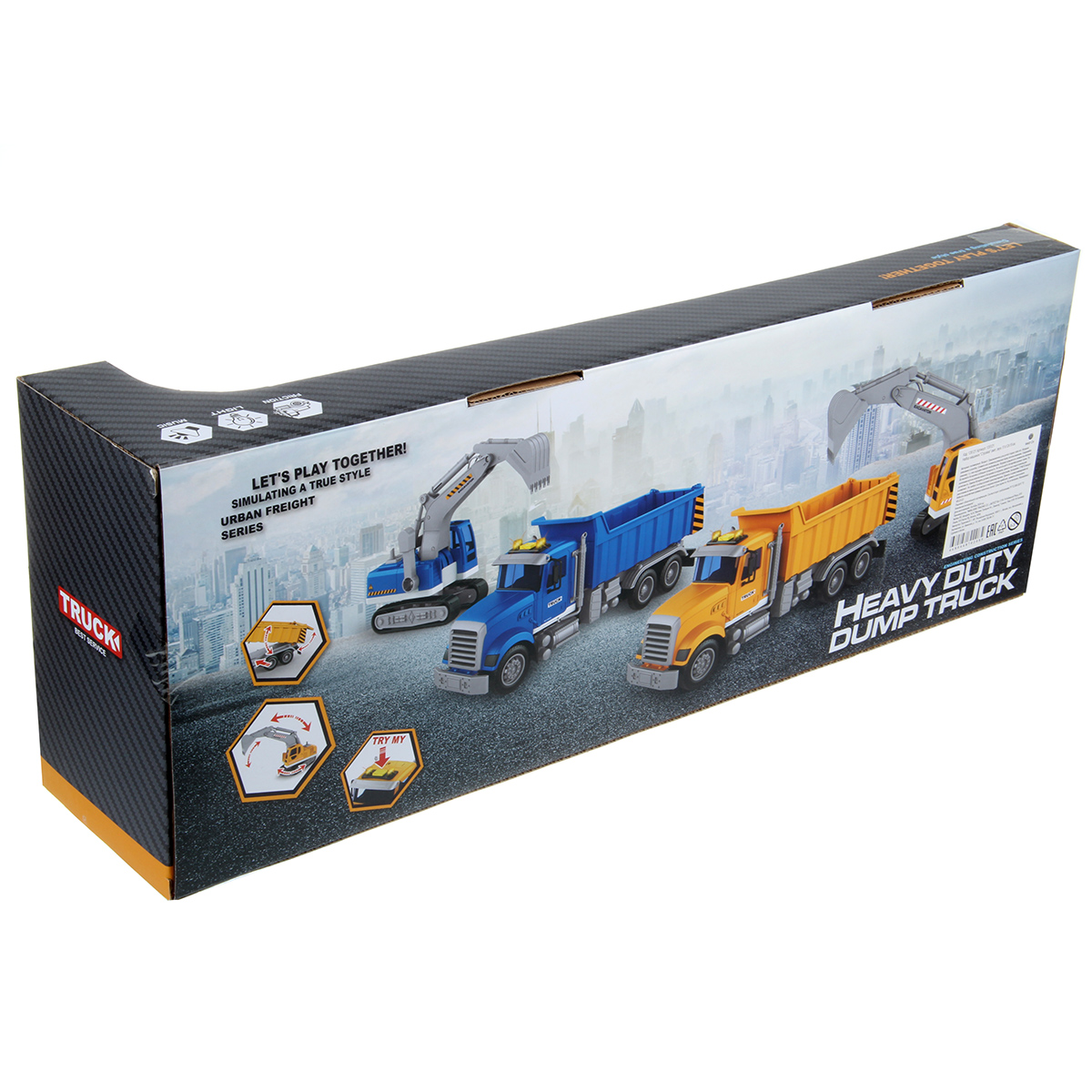 Большая машинка самосвал с подвижными деталями, звуковыми и световыми эффектами. Игрушка самосвал издает звуки заднего хода и гудка, имеет подсветку лампочек на кабине, можно играть в темное время суток. Фрикционная игрушечная машина с поднимающимся кузовом, экскаватор с крутящейся кабиной и раскладывающейся стрелой. Игрушка на батарейках изготовлена из прочных и долговечных материалов. Игрушечный самосвал станет замечательным подарком для детей на Новый год и День рождения, ребенок узнает больше о работе спецтехники.