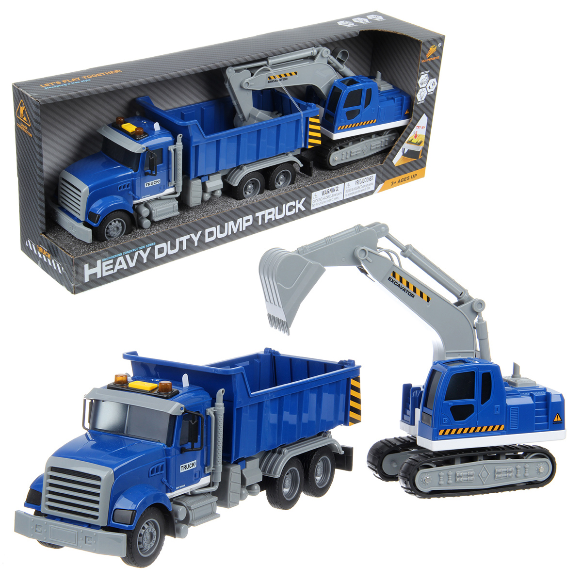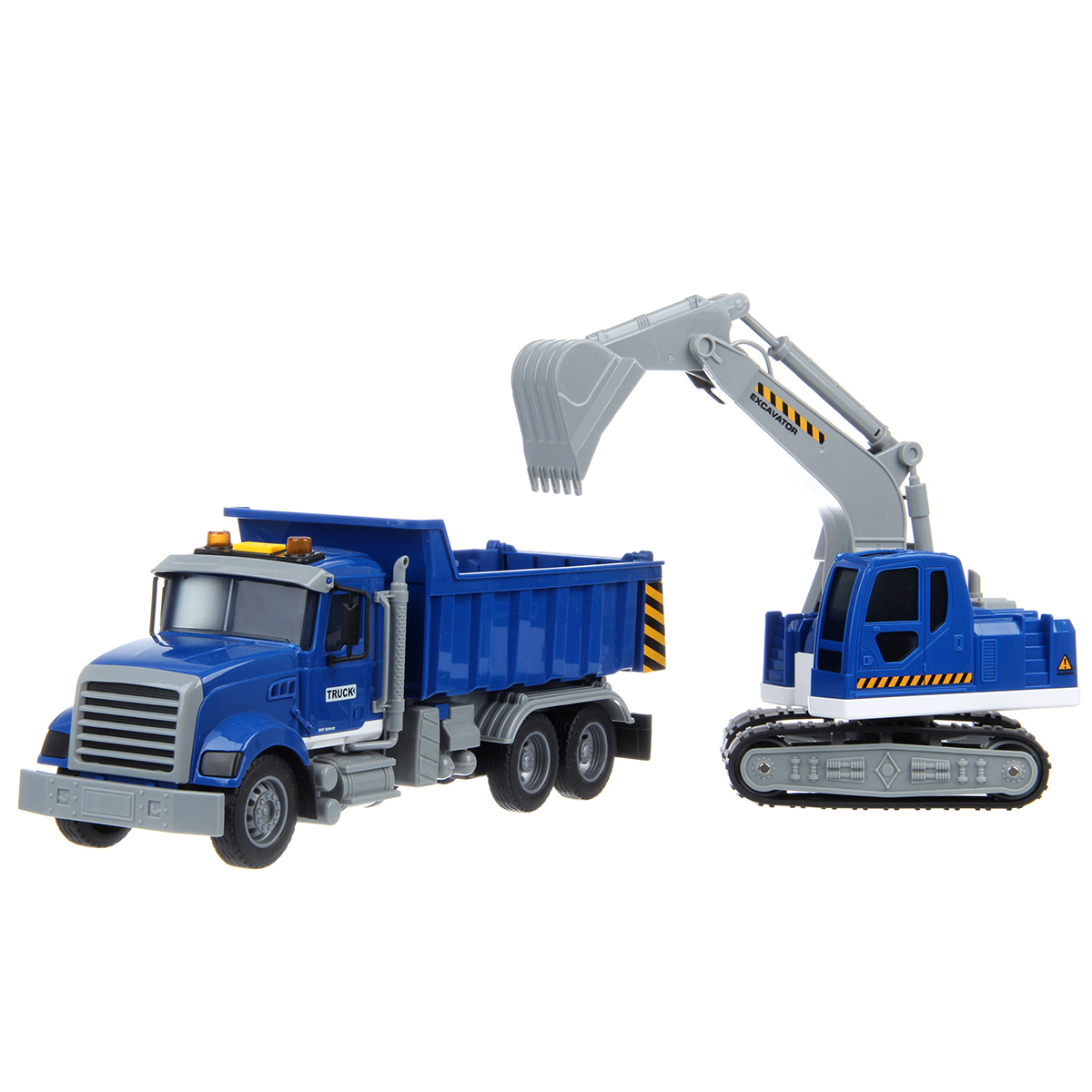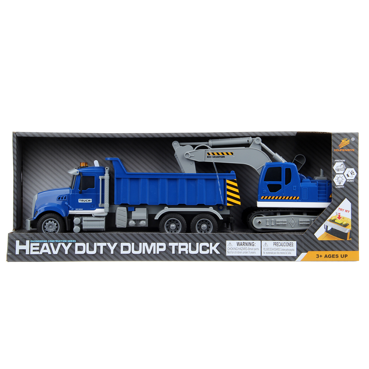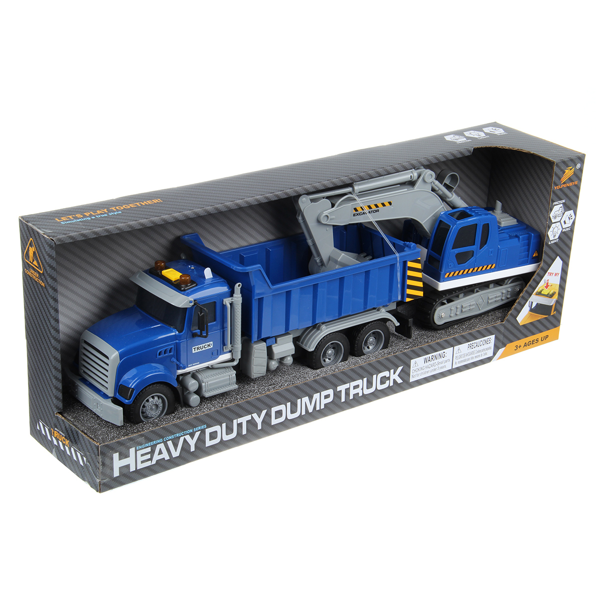 Большая машинка самосвал с подвижными деталями, звуковыми и световыми эффектами. Игрушка самосвал издает звуки заднего хода и гудка, имеет подсветку лампочек на кабине, можно играть в темное время суток. Фрикционная игрушечная машина с поднимающимся кузовом, экскаватор с крутящейся кабиной и раскладывающейся стрелой. Игрушка на батарейках изготовлена из прочных и долговечных материалов. Игрушечный самосвал станет замечательным подарком для детей на Новый год и День рождения, ребенок узнает больше о работе спецтехники.