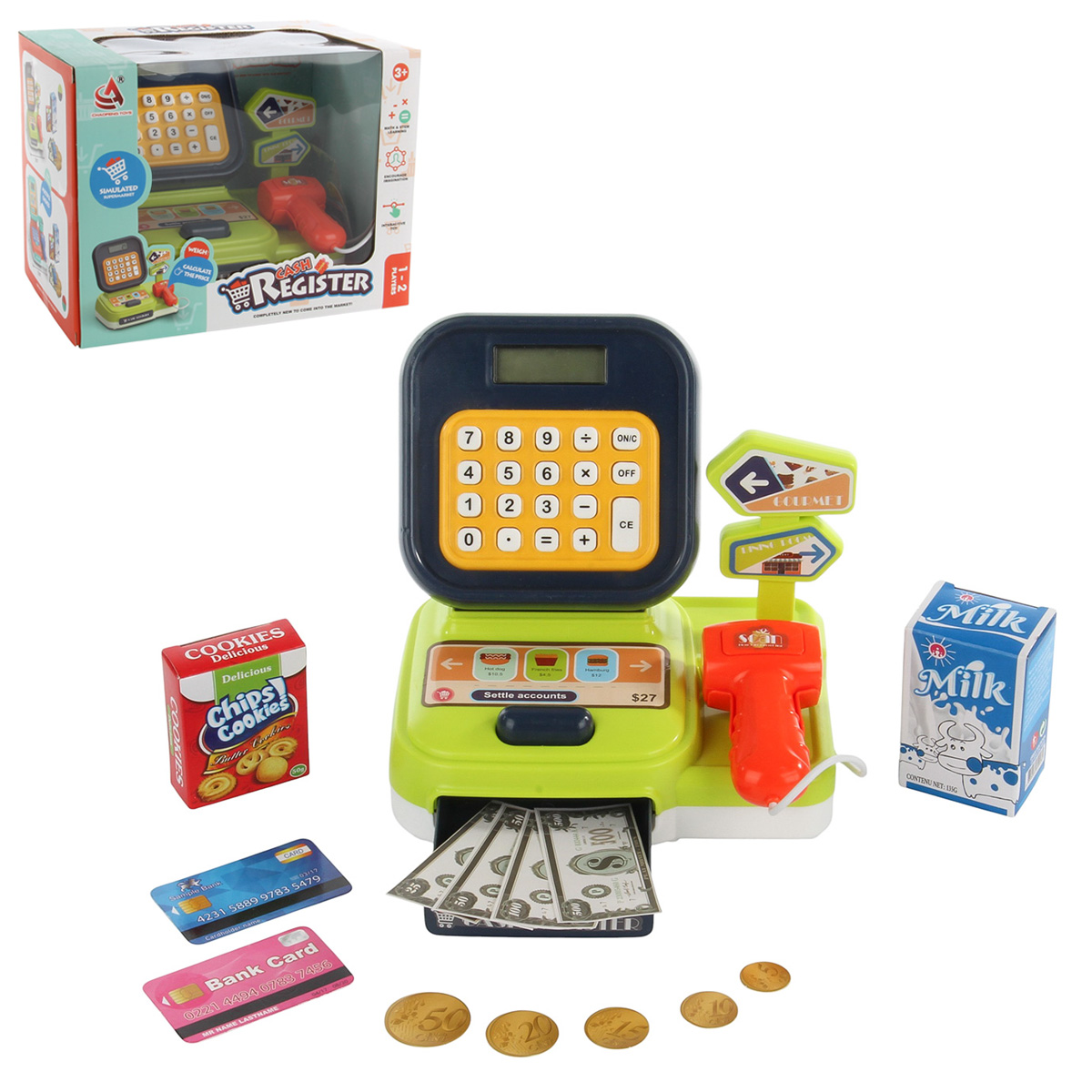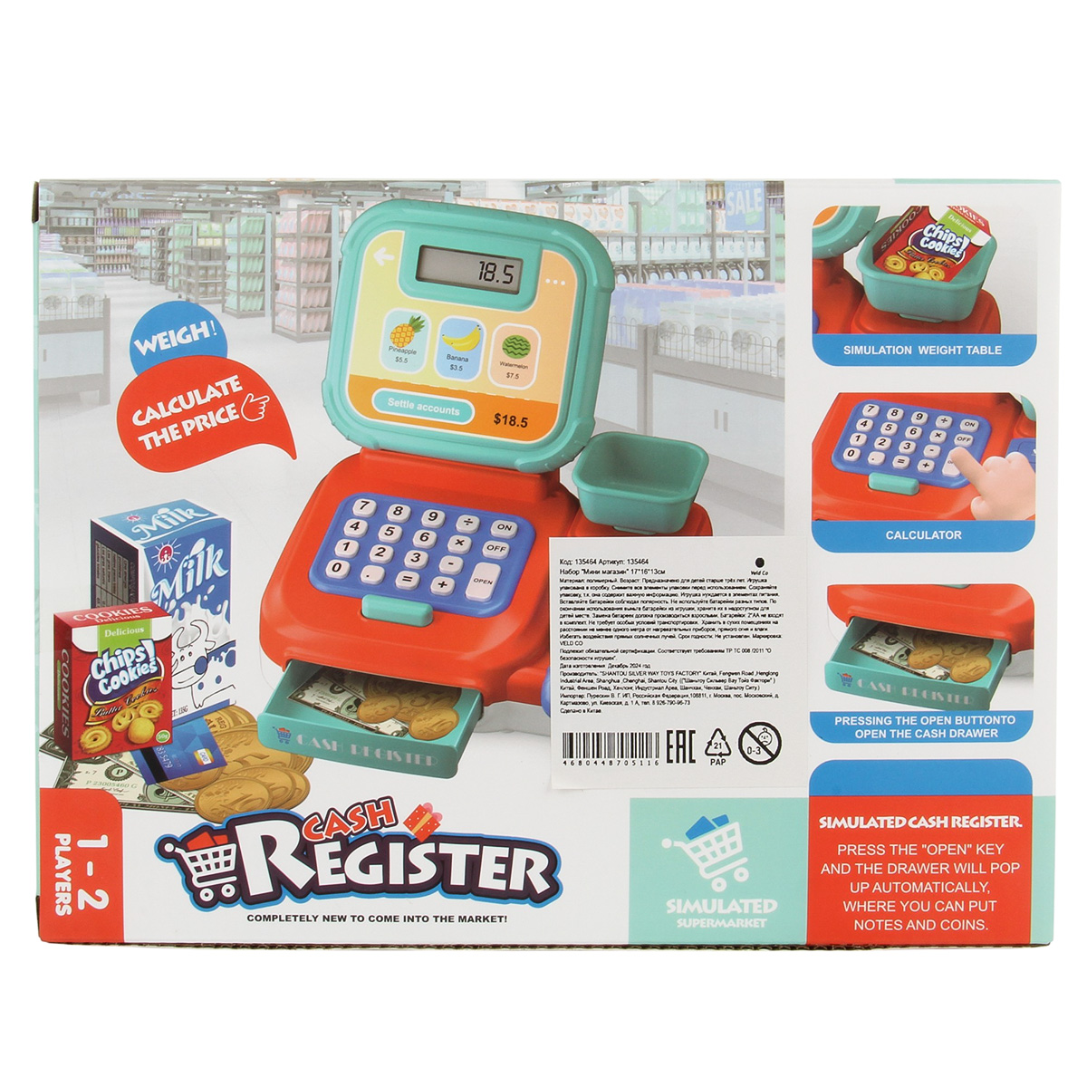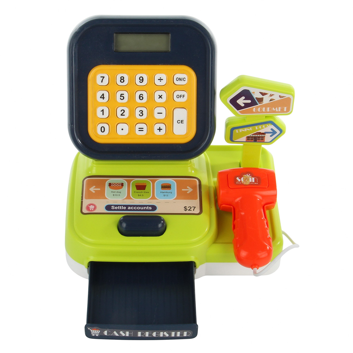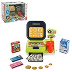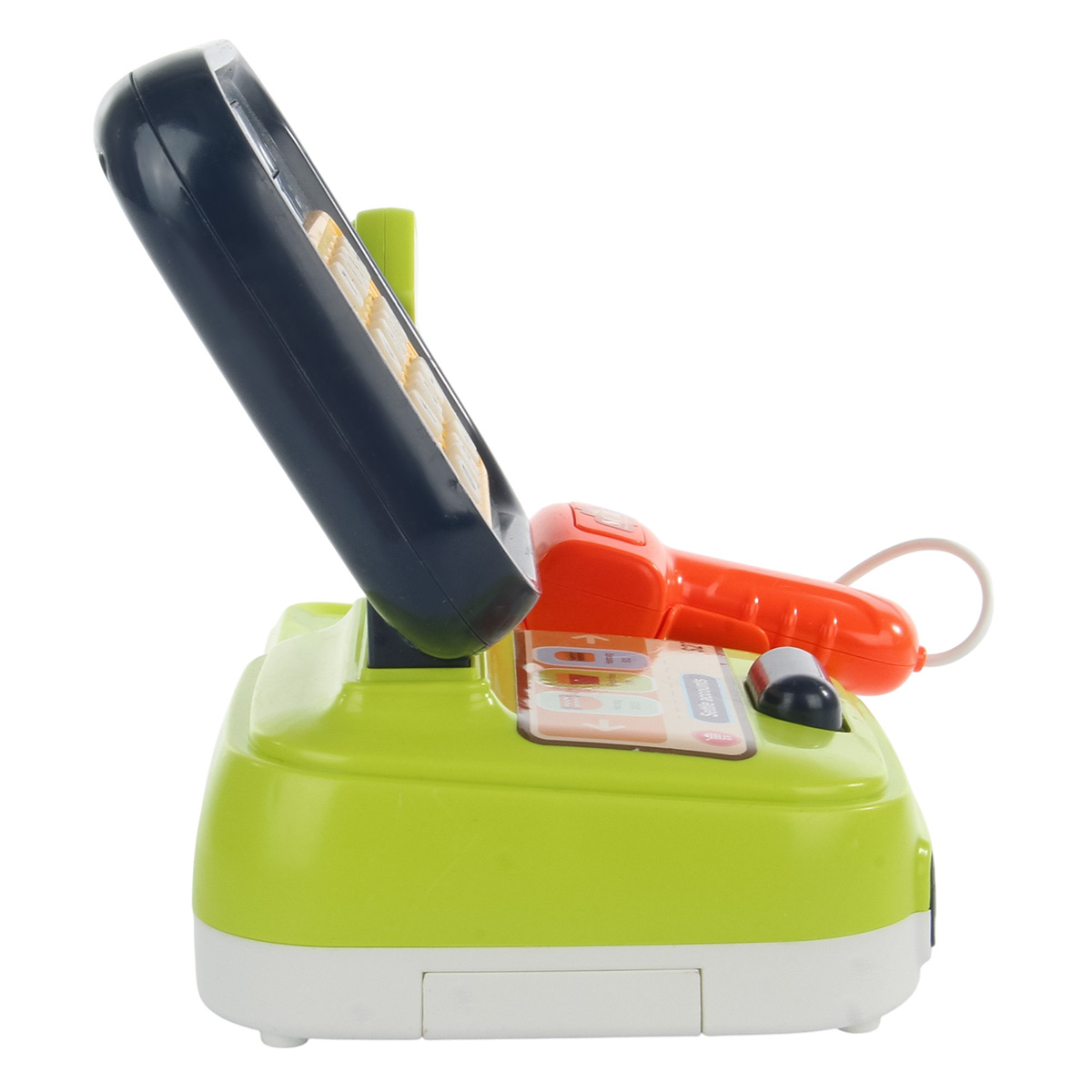 Детская игровая касса со сканером, световыми и звуковыми эффектами, калькулятором, выдвижным ящиком и множеством аксессуаров отлично подойдет для сюжетных игр в супермаркет. Изготовлена из прочных и безопасных материалов, прослужит много лет. Детский магазинчик оформлен в стилизованном дизайне и яркой расцветке. Обладает компактными размерами. В комплект игрового набора входят игрушка кассовый аппарат, 2 пустые коробочки игрушечной еды, 2 банковские карты, 4 банкноты и 5 монеток игрушечных денег. Чтобы использовать игрушку в качестве калькулятора, необходимо ввести пример на клавиатуре. Цифры отображаются на экране, все арифметические действия озвучиваются. При нажатии на кнопки с изображениями продуктов аппарат называет их, при этом на экране высветится цена продукта. Если нажать на кнопку с ладошками, издаст звук аплодисментов, приветствия, пожелает приятных покупок. При проведении картой по слоту, устройство произносит фразу об успешной оплате. Сканер устанавливается на держателе. При нажатии на кнопку сканер издает писк, лампочка подсвечивается красным. Чаша весов прогибается при нажатии. При прокрутке бокового рычага выдвигается фрагмент ленты. Отсек для денег выдвигается при нажатии на соответствующую кнопку. Такая игрушечная касса со звуком станет замечательным подарком детям, мальчику, девочке, на новый год, день рождения и на любой другой повод. С такой детской игрушкой ребёнок в игровой форме обучится основам финансовой грамотности. Озвучка английская. 14 предметов. Работает от 2 батареек АА, не входят в комплект. Детский супермаркет с кассой изготовлен из высококачественного полимера. Размер кассового аппарата 29х16х21 см. Размер сканера 4х3х10 см. Размер коробочки имитации продуктов 5х2х6 см. Размер банковской карты 6х4 см. Размер банкноты имитации денег 9х4 см. Диаметр большой монетки 3 см. Диаметр маленькой монетки 2 см. Размер коробки 35х18х25 см.