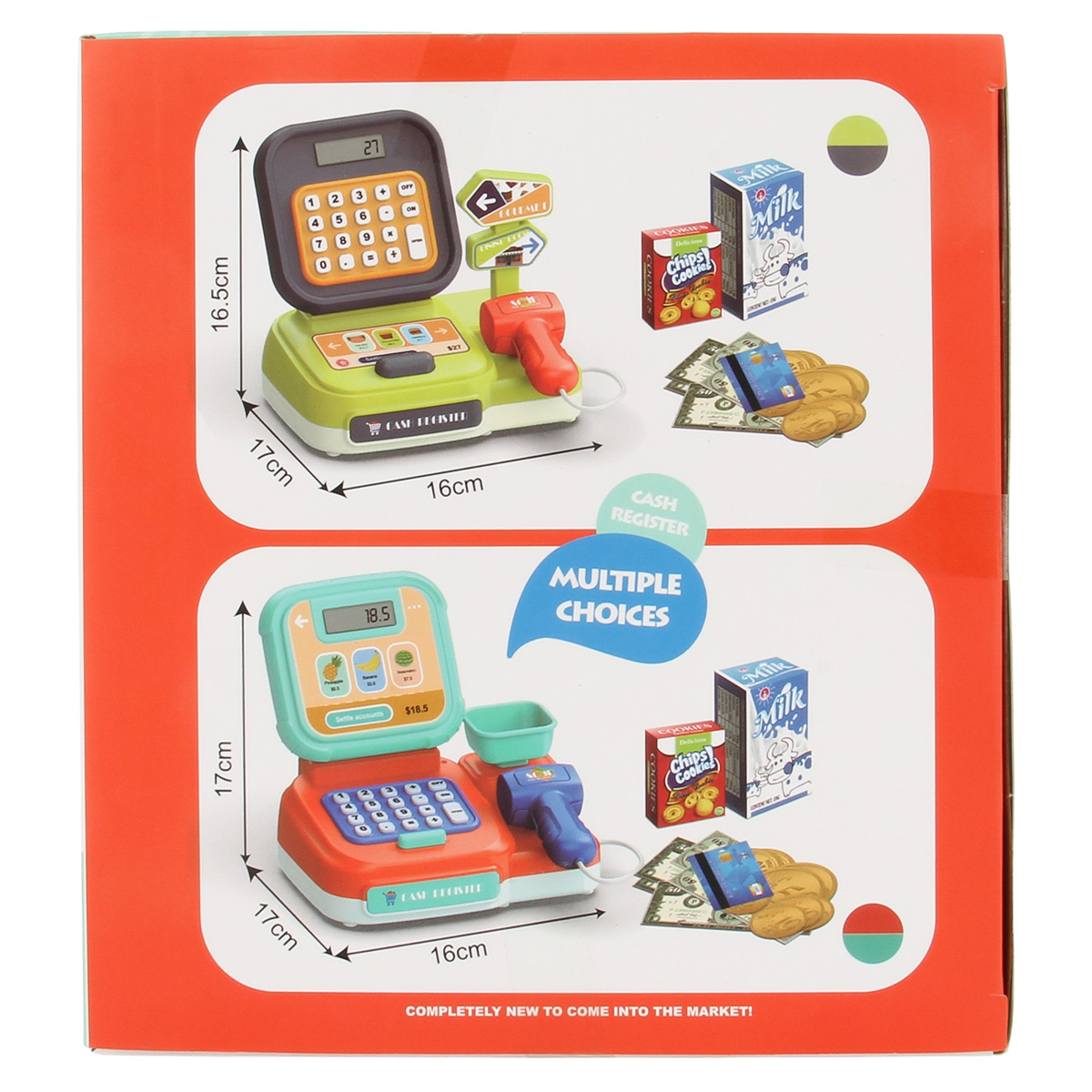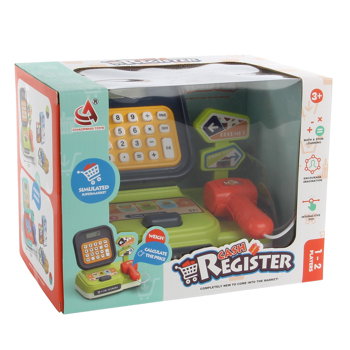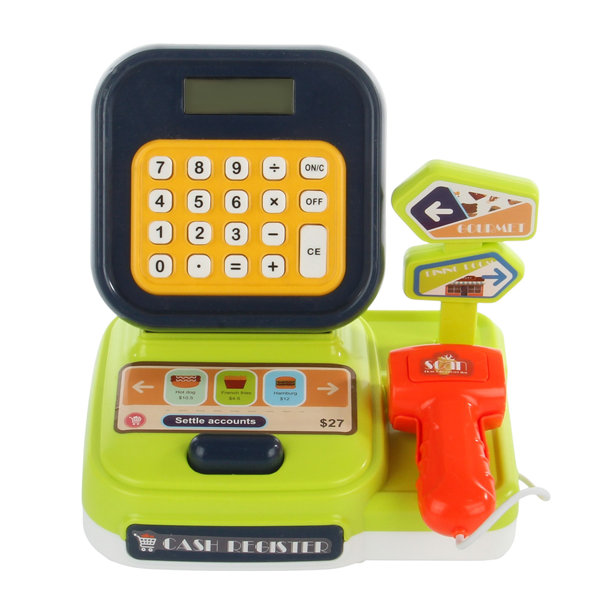 Детская игровая касса со сканером, световыми и звуковыми эффектами, калькулятором, выдвижным ящиком и множеством аксессуаров отлично подойдет для сюжетных игр в супермаркет. Изготовлена из прочных и безопасных материалов, прослужит много лет. Детский магазинчик оформлен в стилизованном дизайне и яркой расцветке. Обладает компактными размерами. В комплект игрового набора входят игрушка кассовый аппарат, 2 пустые коробочки игрушечной еды, 2 банковские карты, 4 банкноты и 5 монеток игрушечных денег. Чтобы использовать игрушку в качестве калькулятора, необходимо ввести пример на клавиатуре. Цифры отображаются на экране, все арифметические действия озвучиваются. При нажатии на кнопки с изображениями продуктов аппарат называет их, при этом на экране высветится цена продукта. Если нажать на кнопку с ладошками, издаст звук аплодисментов, приветствия, пожелает приятных покупок. При проведении картой по слоту, устройство произносит фразу об успешной оплате. Сканер устанавливается на держателе. При нажатии на кнопку сканер издает писк, лампочка подсвечивается красным. Чаша весов прогибается при нажатии. При прокрутке бокового рычага выдвигается фрагмент ленты. Отсек для денег выдвигается при нажатии на соответствующую кнопку. Такая игрушечная касса со звуком станет замечательным подарком детям, мальчику, девочке, на новый год, день рождения и на любой другой повод. С такой детской игрушкой ребёнок в игровой форме обучится основам финансовой грамотности. Озвучка английская. 14 предметов. Работает от 2 батареек АА, не входят в комплект. Детский супермаркет с кассой изготовлен из высококачественного полимера. Размер кассового аппарата 29х16х21 см. Размер сканера 4х3х10 см. Размер коробочки имитации продуктов 5х2х6 см. Размер банковской карты 6х4 см. Размер банкноты имитации денег 9х4 см. Диаметр большой монетки 3 см. Диаметр маленькой монетки 2 см. Размер коробки 35х18х25 см.