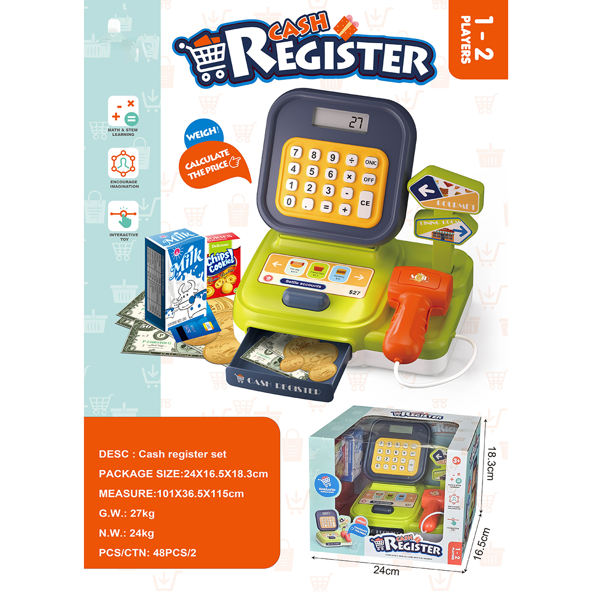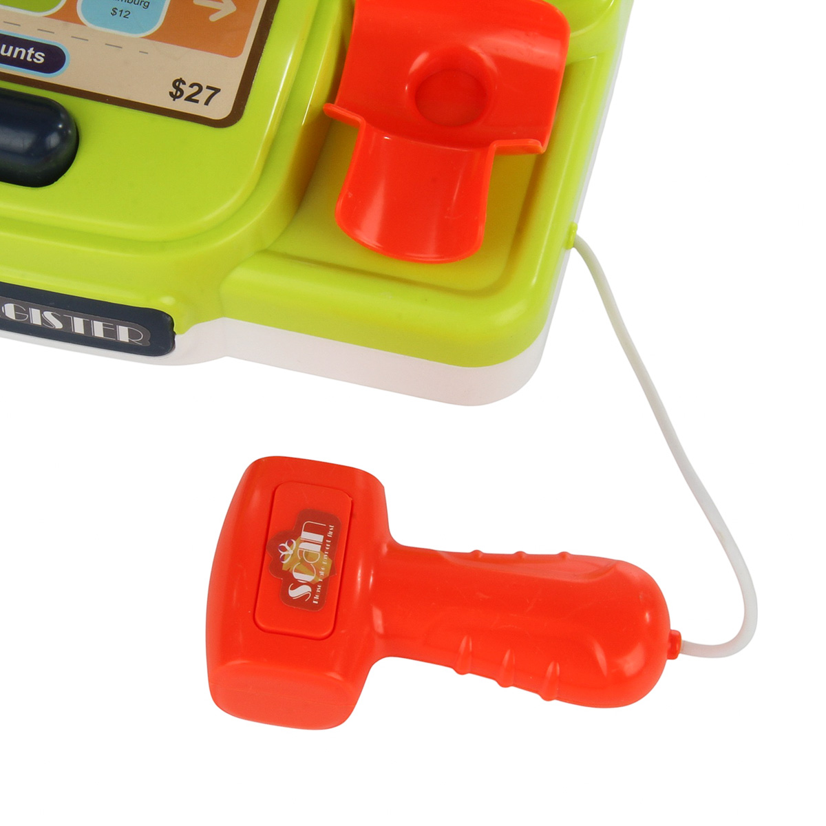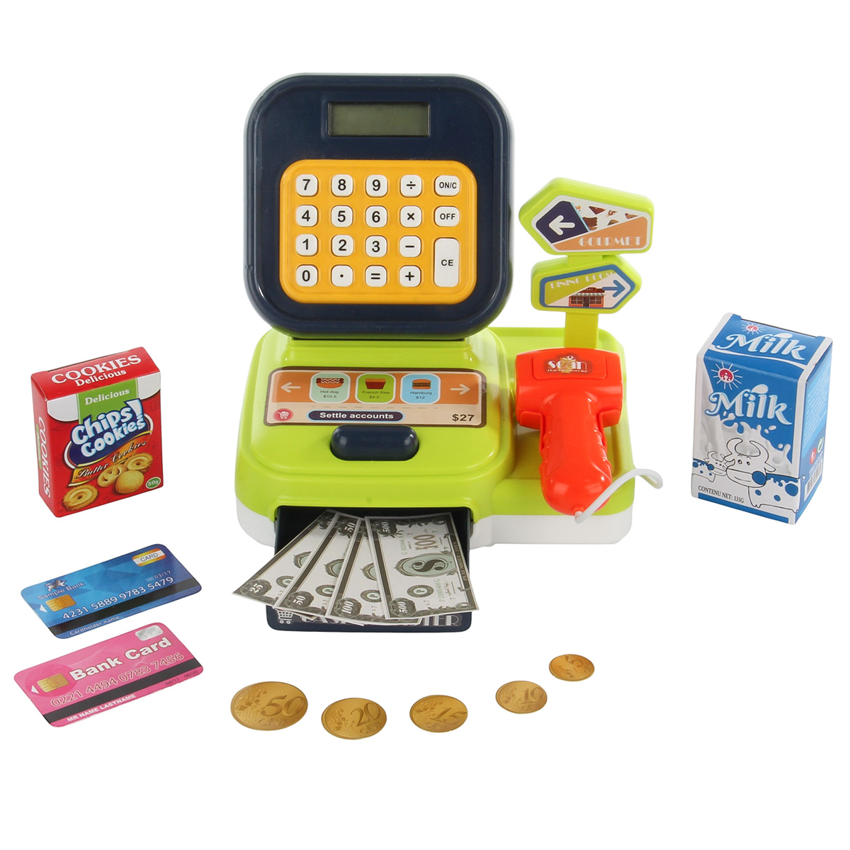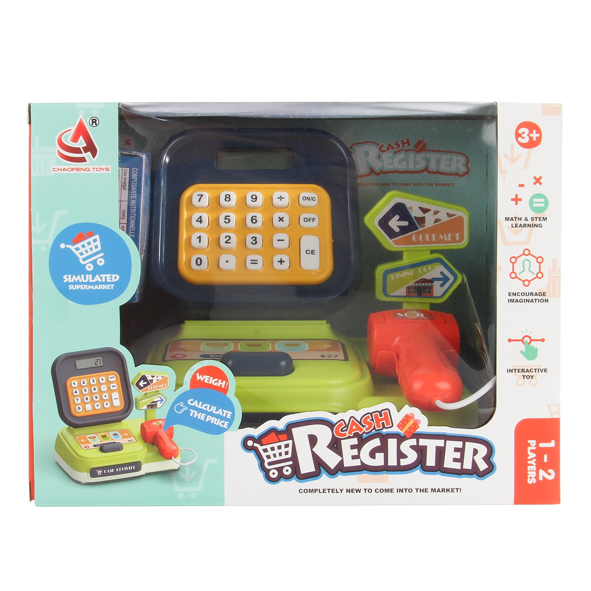 Детская игровая касса со сканером, световыми и звуковыми эффектами, калькулятором, выдвижным ящиком и множеством аксессуаров отлично подойдет для сюжетных игр в супермаркет. Изготовлена из прочных и безопасных материалов, прослужит много лет. Детский магазинчик оформлен в стилизованном дизайне и яркой расцветке. Обладает компактными размерами. В комплект игрового набора входят игрушка кассовый аппарат, 2 пустые коробочки игрушечной еды, 2 банковские карты, 4 банкноты и 5 монеток игрушечных денег. Чтобы использовать игрушку в качестве калькулятора, необходимо ввести пример на клавиатуре. Цифры отображаются на экране, все арифметические действия озвучиваются. При нажатии на кнопки с изображениями продуктов аппарат называет их, при этом на экране высветится цена продукта. Если нажать на кнопку с ладошками, издаст звук аплодисментов, приветствия, пожелает приятных покупок. При проведении картой по слоту, устройство произносит фразу об успешной оплате. Сканер устанавливается на держателе. При нажатии на кнопку сканер издает писк, лампочка подсвечивается красным. Чаша весов прогибается при нажатии. При прокрутке бокового рычага выдвигается фрагмент ленты. Отсек для денег выдвигается при нажатии на соответствующую кнопку. Такая игрушечная касса со звуком станет замечательным подарком детям, мальчику, девочке, на новый год, день рождения и на любой другой повод. С такой детской игрушкой ребёнок в игровой форме обучится основам финансовой грамотности. Озвучка английская. 14 предметов. Работает от 2 батареек АА, не входят в комплект. Детский супермаркет с кассой изготовлен из высококачественного полимера. Размер кассового аппарата 29х16х21 см. Размер сканера 4х3х10 см. Размер коробочки имитации продуктов 5х2х6 см. Размер банковской карты 6х4 см. Размер банкноты имитации денег 9х4 см. Диаметр большой монетки 3 см. Диаметр маленькой монетки 2 см. Размер коробки 35х18х25 см.