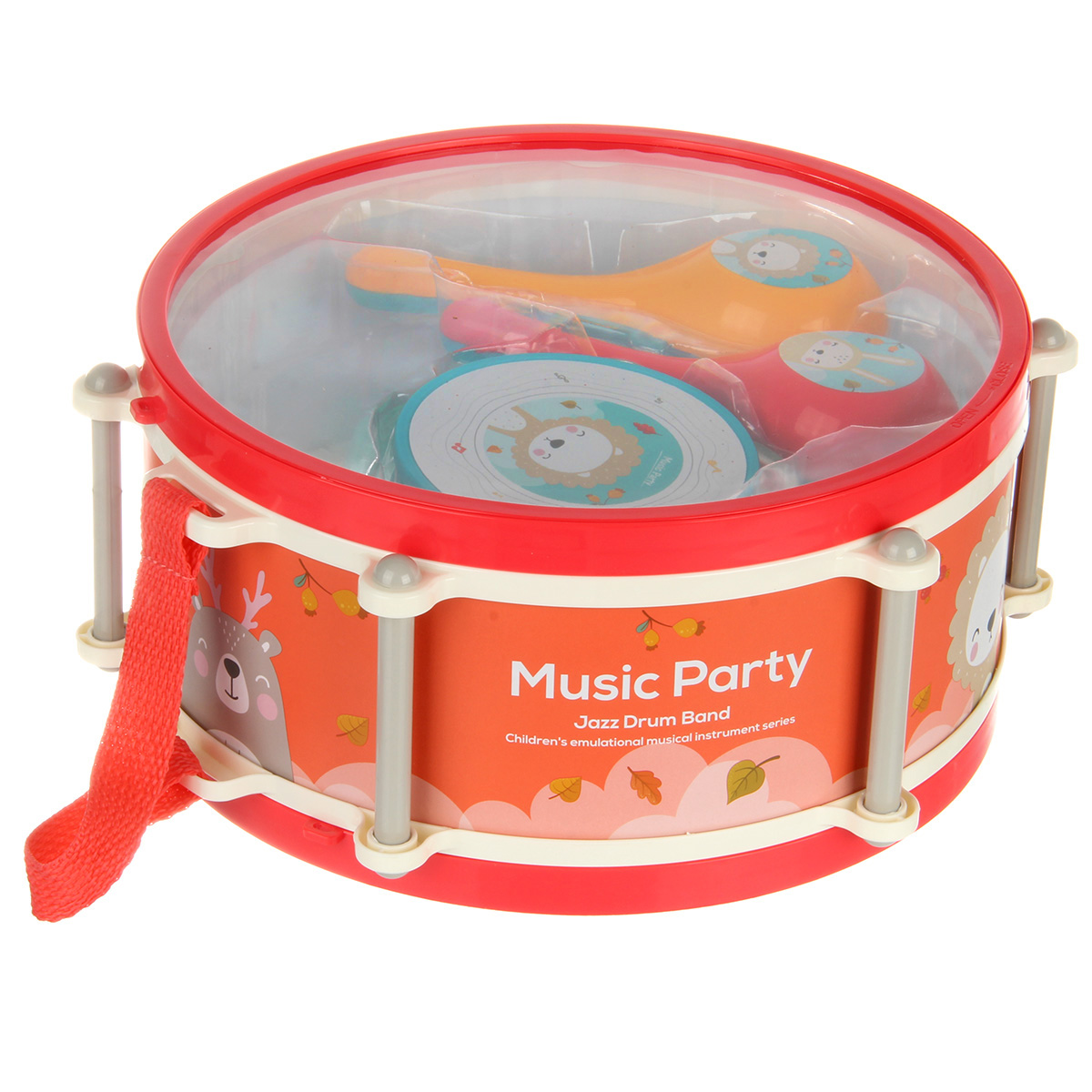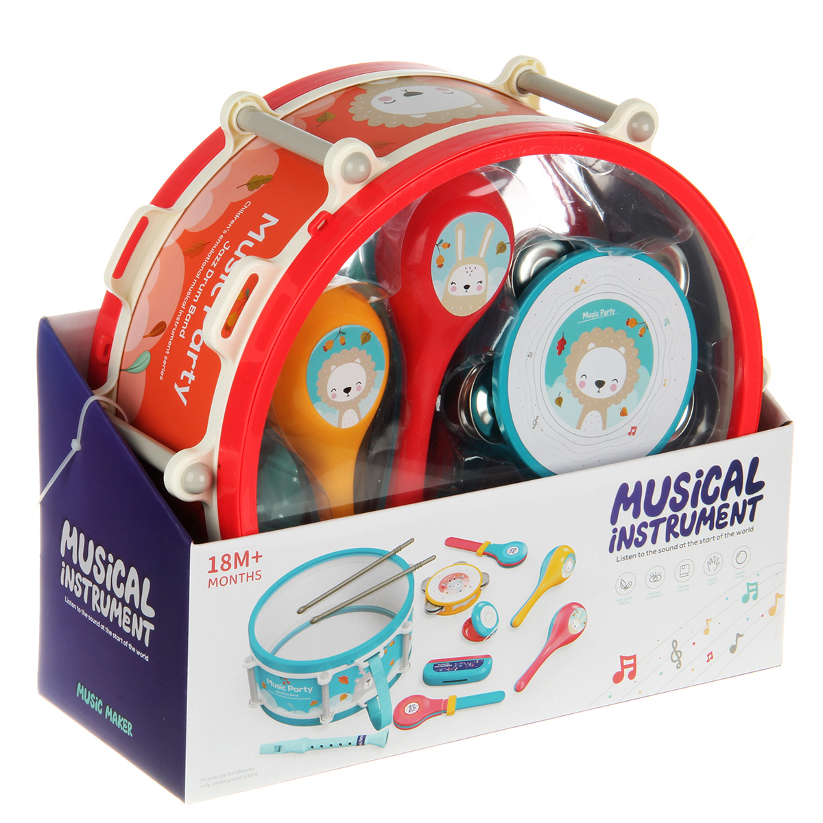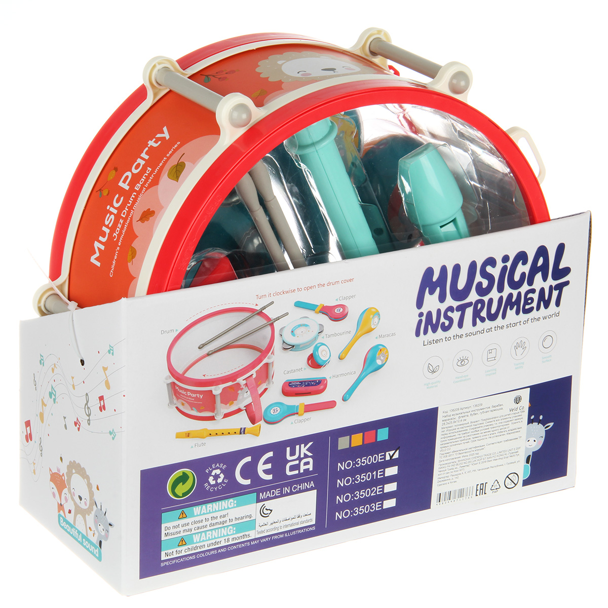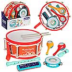 Игровой набор музыкальных инструментов с большим количеством предметов. Каждый игрушечный инструмент издаёт соответствующий звук. Удобный ремешок барабана, все предметы можно положить в барабан и переносить в нем, компактные размеры, лёгкий вес. Музыкальные игрушки изготовлены из прочных и безопасных материалов, оформлены в милом дизайне и яркой расцветке.