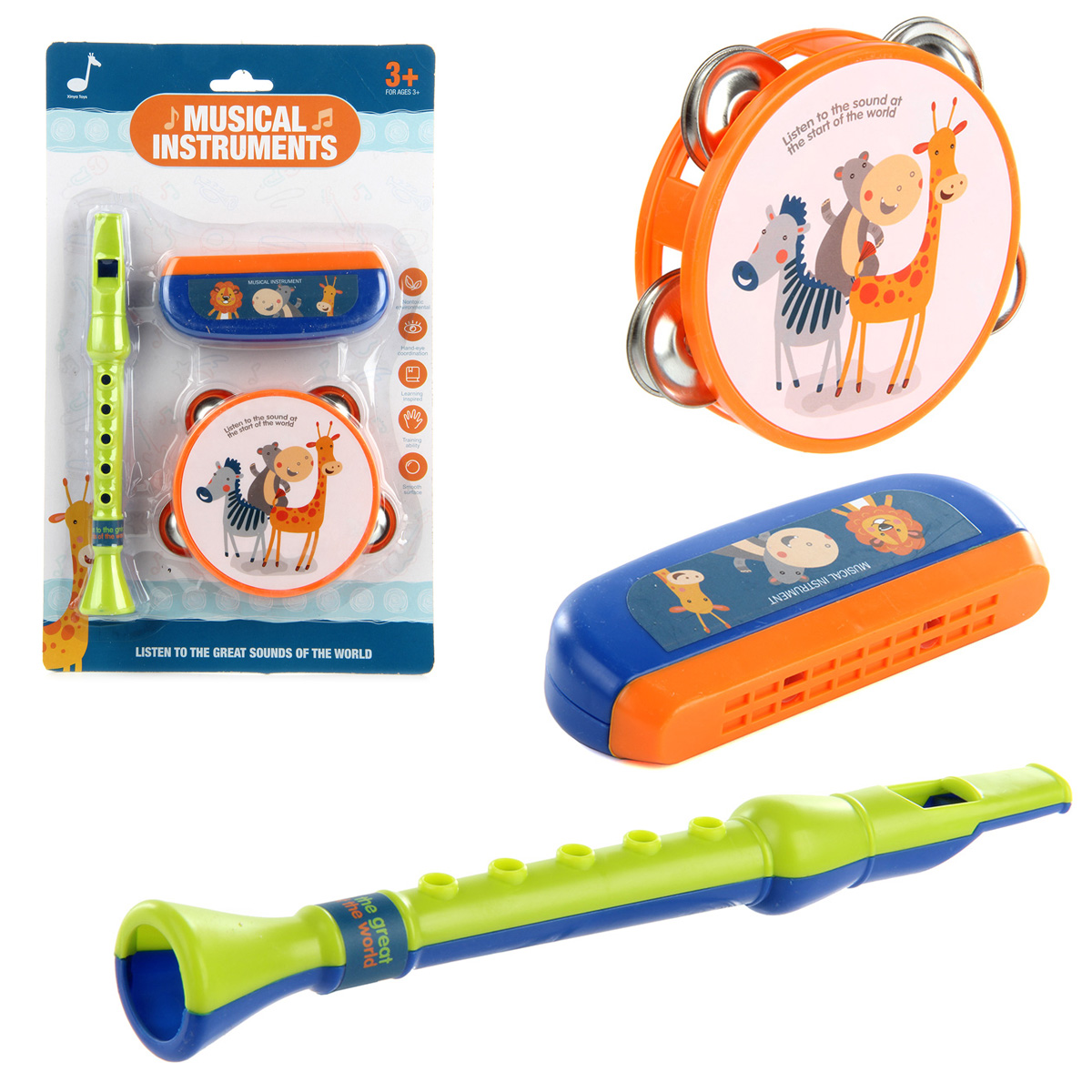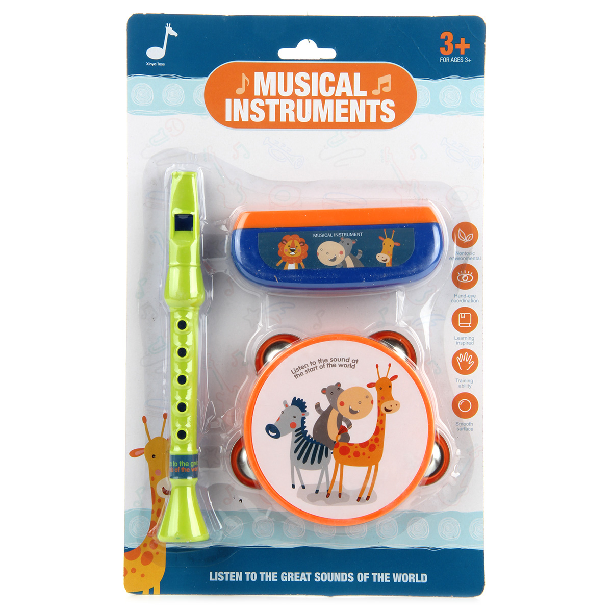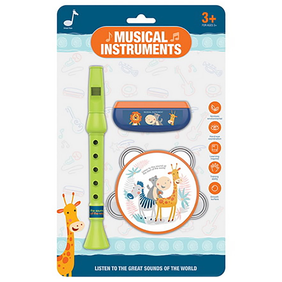 Яркая, красивая и очень полезная игрушка для развития ребенка - набор музыкальных инструментов. В комплект входят флейта, бубен и гармошка. Играть следует, как на обычных инструментах. Игрушка отлично развивает мелкую моторику рук, координацию движений, логическое мышление, слуховое и музыкальное восприятие, внимание, воображение. Ребенок знакомится с музыкой и осваивает музыкальные инструменты. Игрушка изготовлена из качественного и безопасного полимерного материала, упакована в блистер с отверстием. Размеры бубна: 11*10,5*2,5 см. Размеры флейты: 19*3*3 см. Размеры гармошки: 11*2*4,5 см. Размеры игрушки в упаковке: 18,5*3*30 см.
