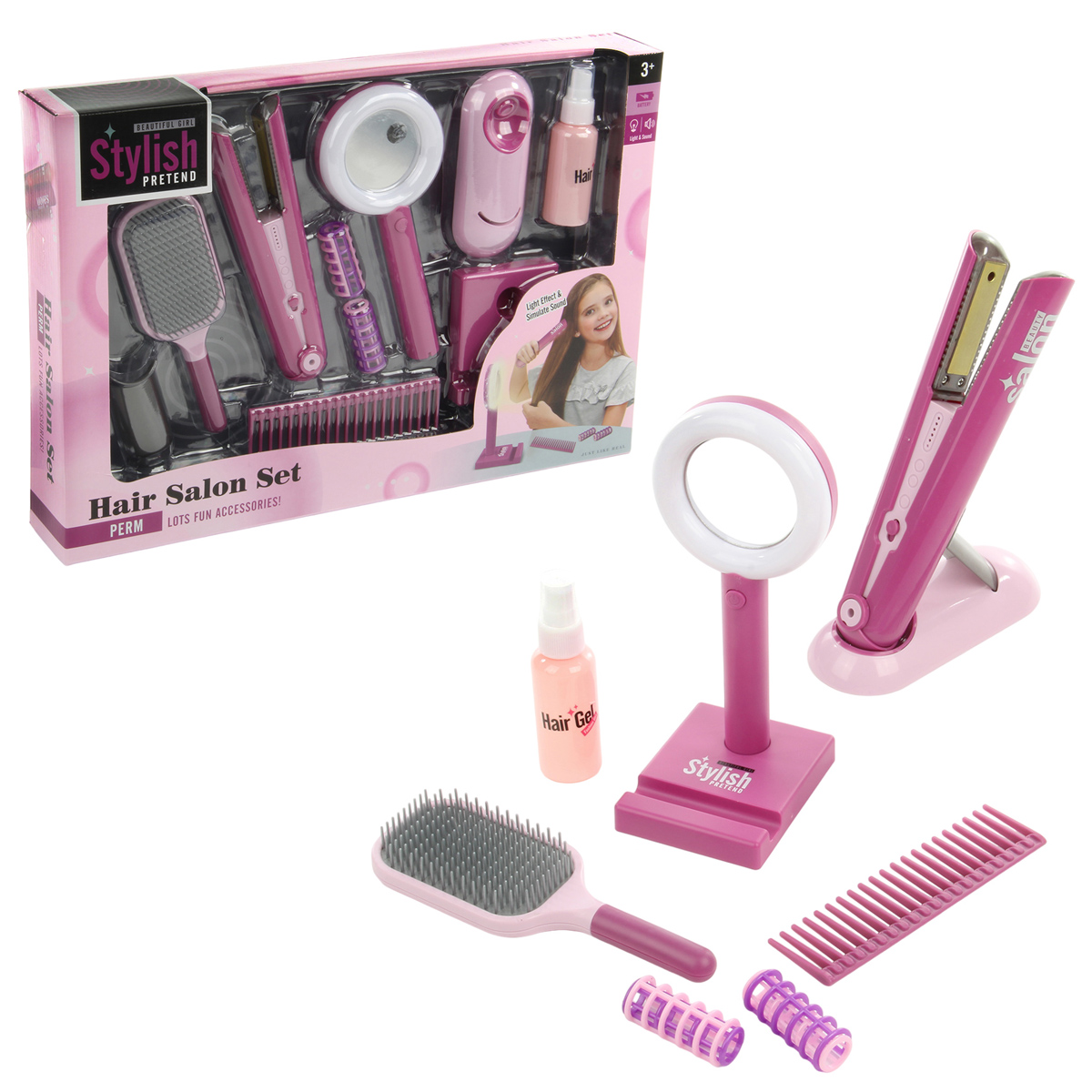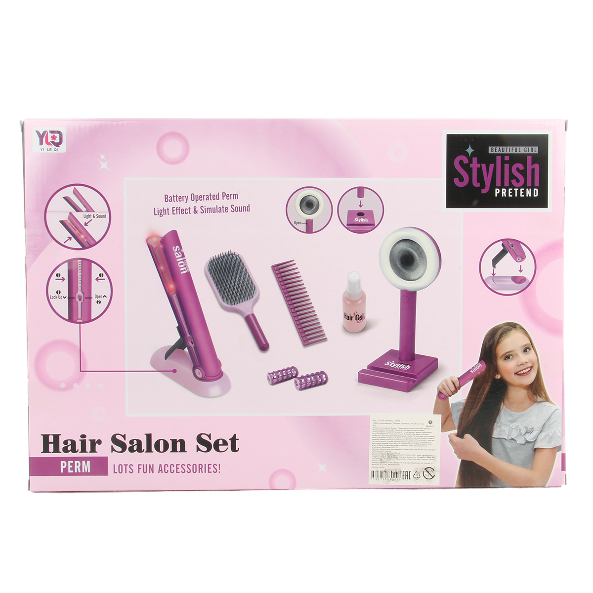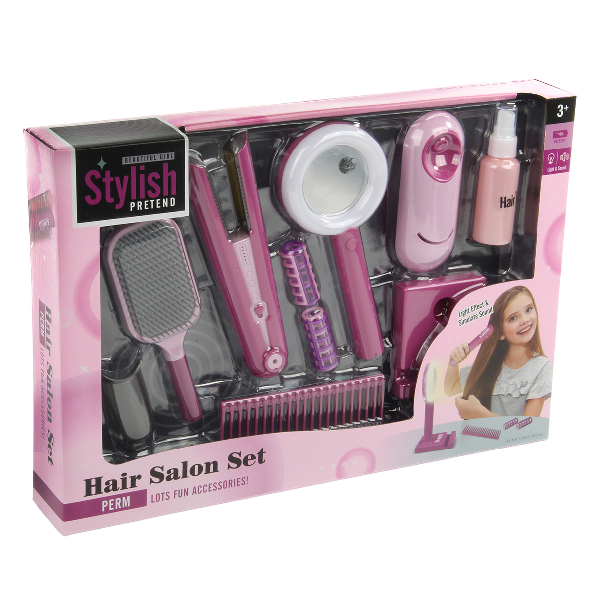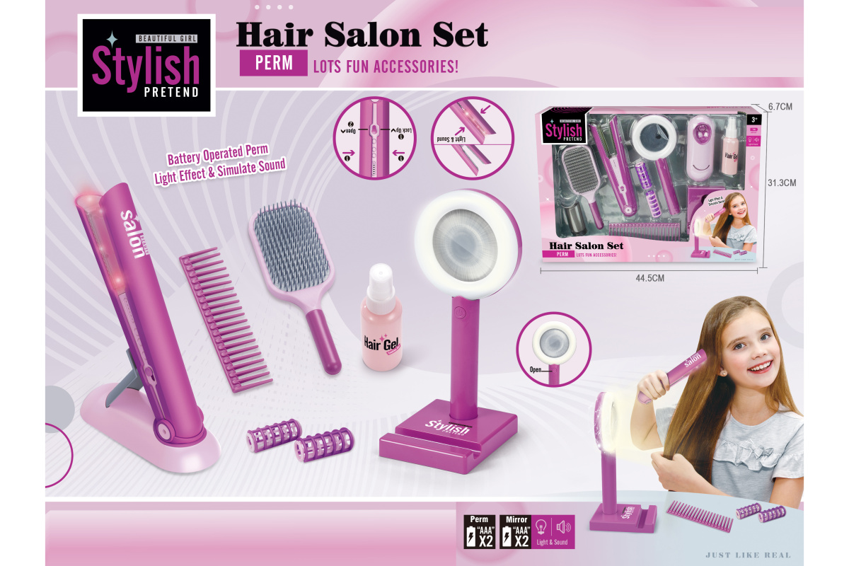 Игрушечный утюжок со звуком и светом, 2 расчески, зеркало с эффектной подсветкой, пульверизатор, в который можно набрать воды, этот роскошный набор Парикмахерская очень понравится ребенку.