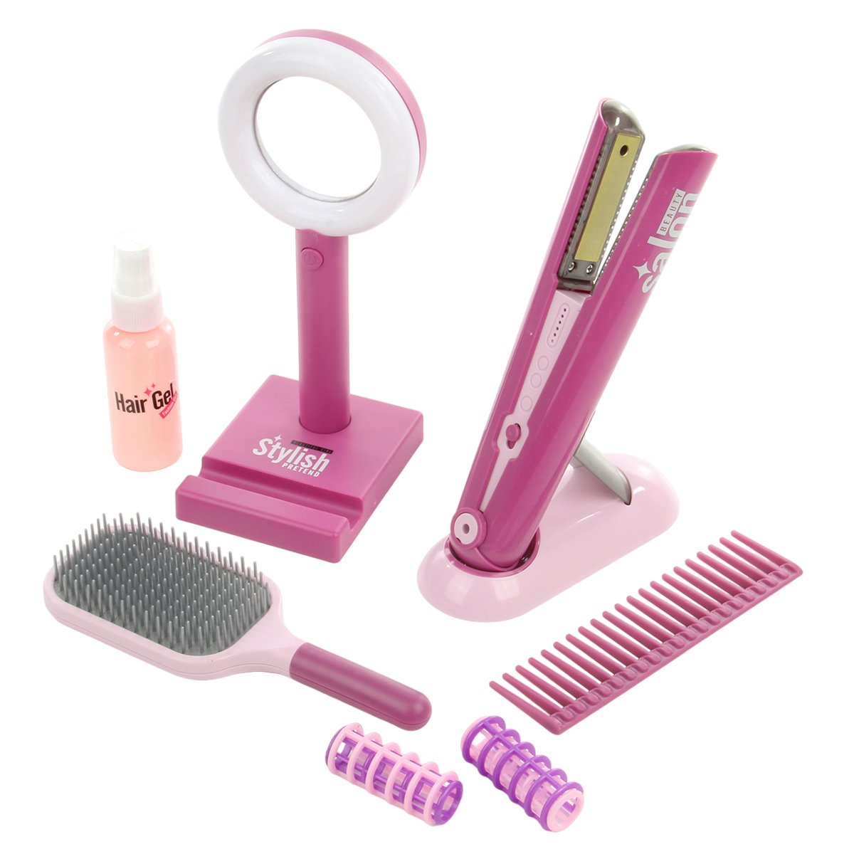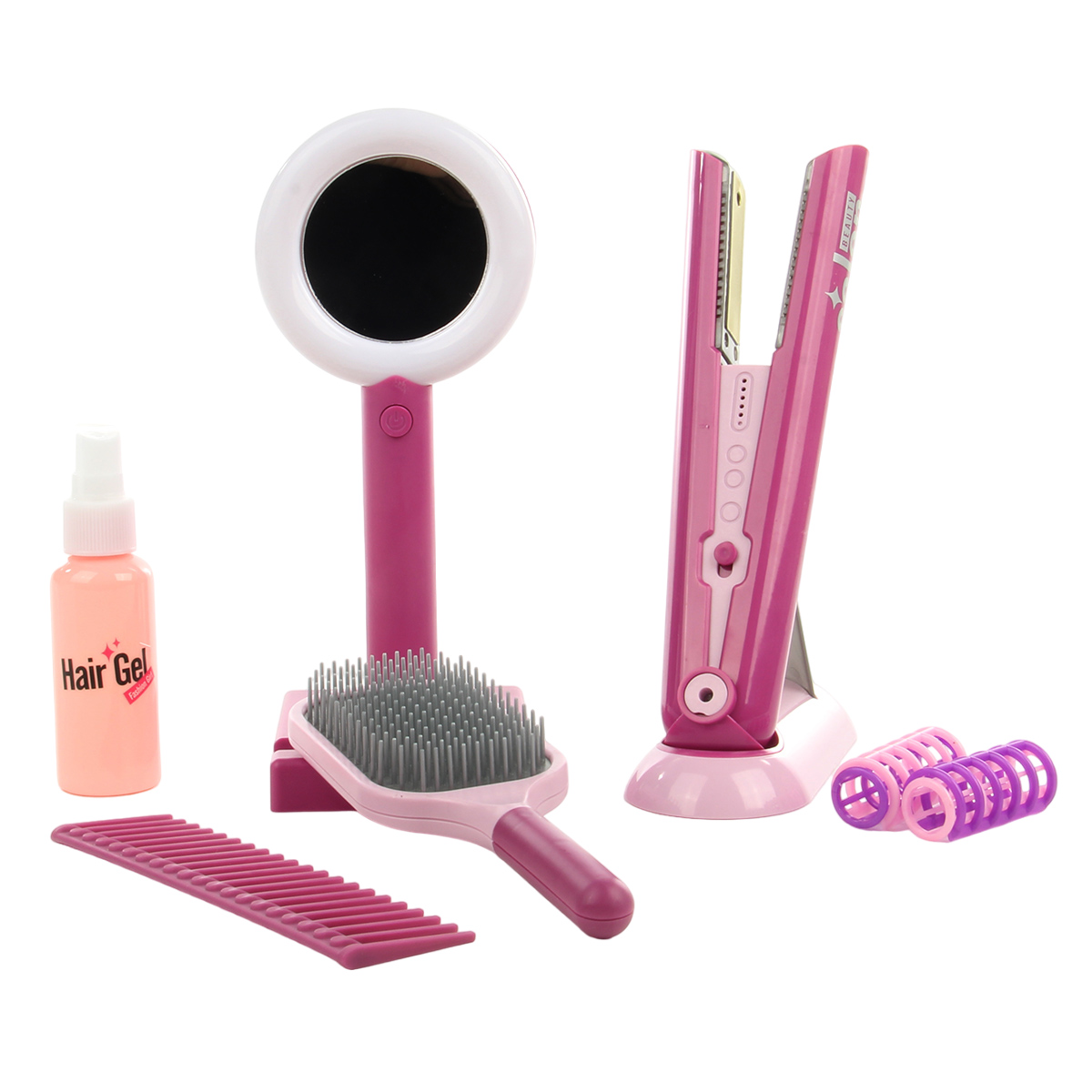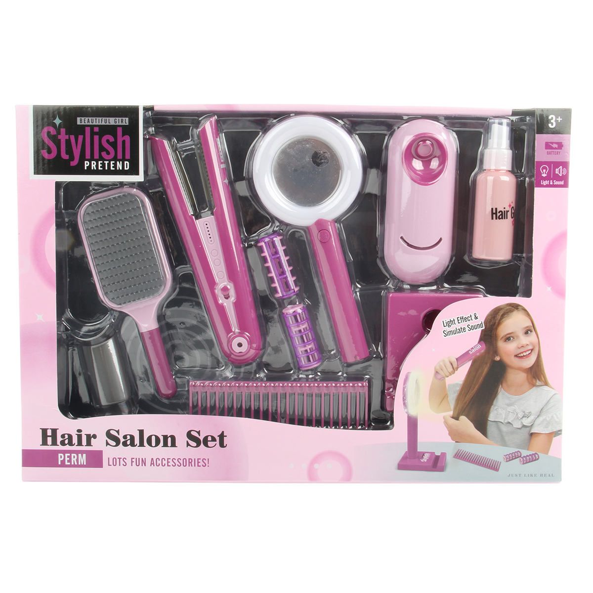 Игрушечный утюжок со звуком и светом, 2 расчески, зеркало с эффектной подсветкой, пульверизатор, в который можно набрать воды, этот роскошный набор Парикмахерская очень понравится ребенку.