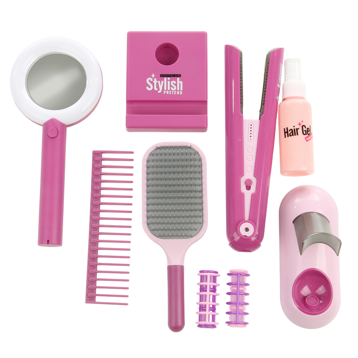 Комплектация. Утюжок, подставка для него, расческа массажная, зеркало с подставкой, гребень, 2 бигуди, пульверизатор.